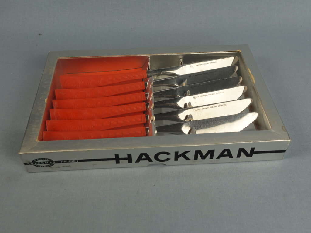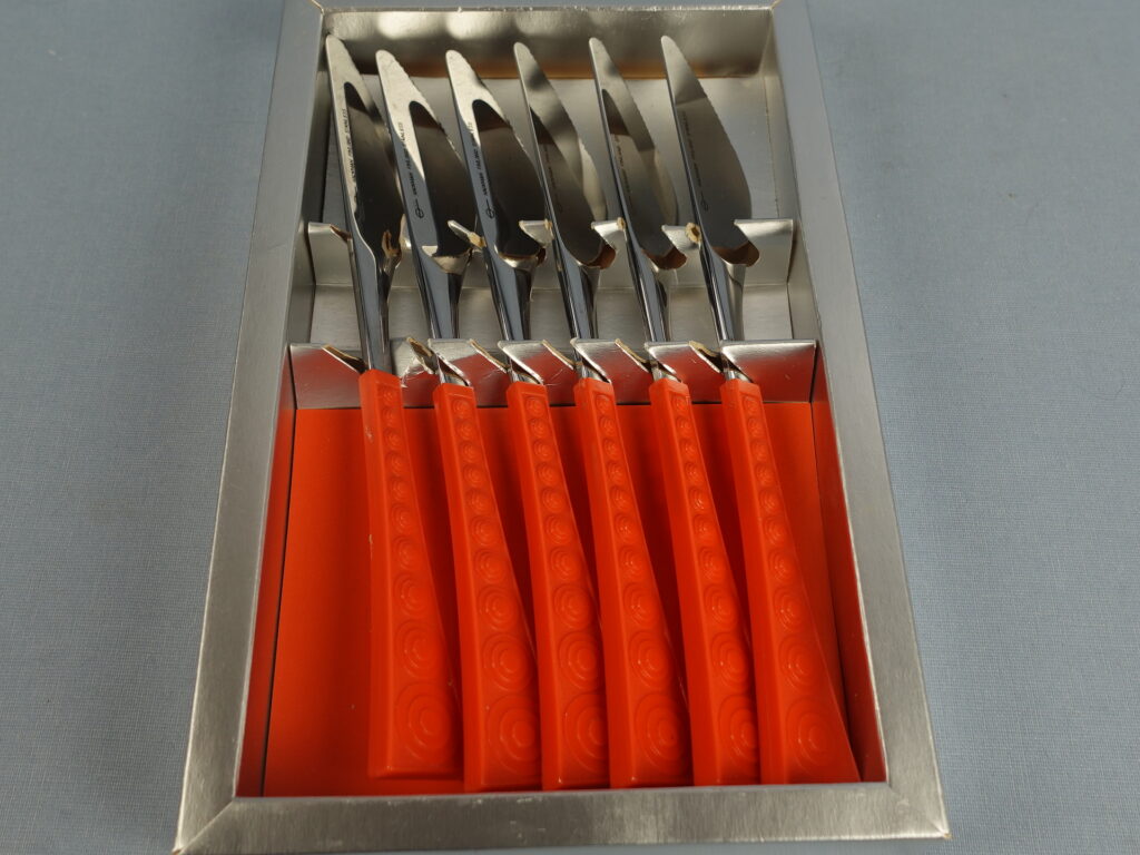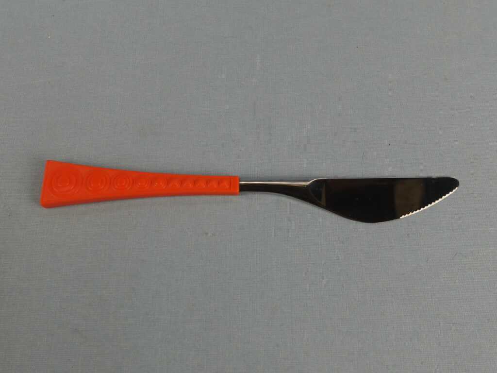 Orange dinner knives from the Colorina series designed by Nanny Still for Hackman. The series was produced in 1970-73 and was also produced in red, green and blue. The knive’s handles are made of decorative plastic and the rest is made of stainless steel. The length of the dinner knives is 19.7 cm. The knives for sale are in their original packaging and are almost unused.