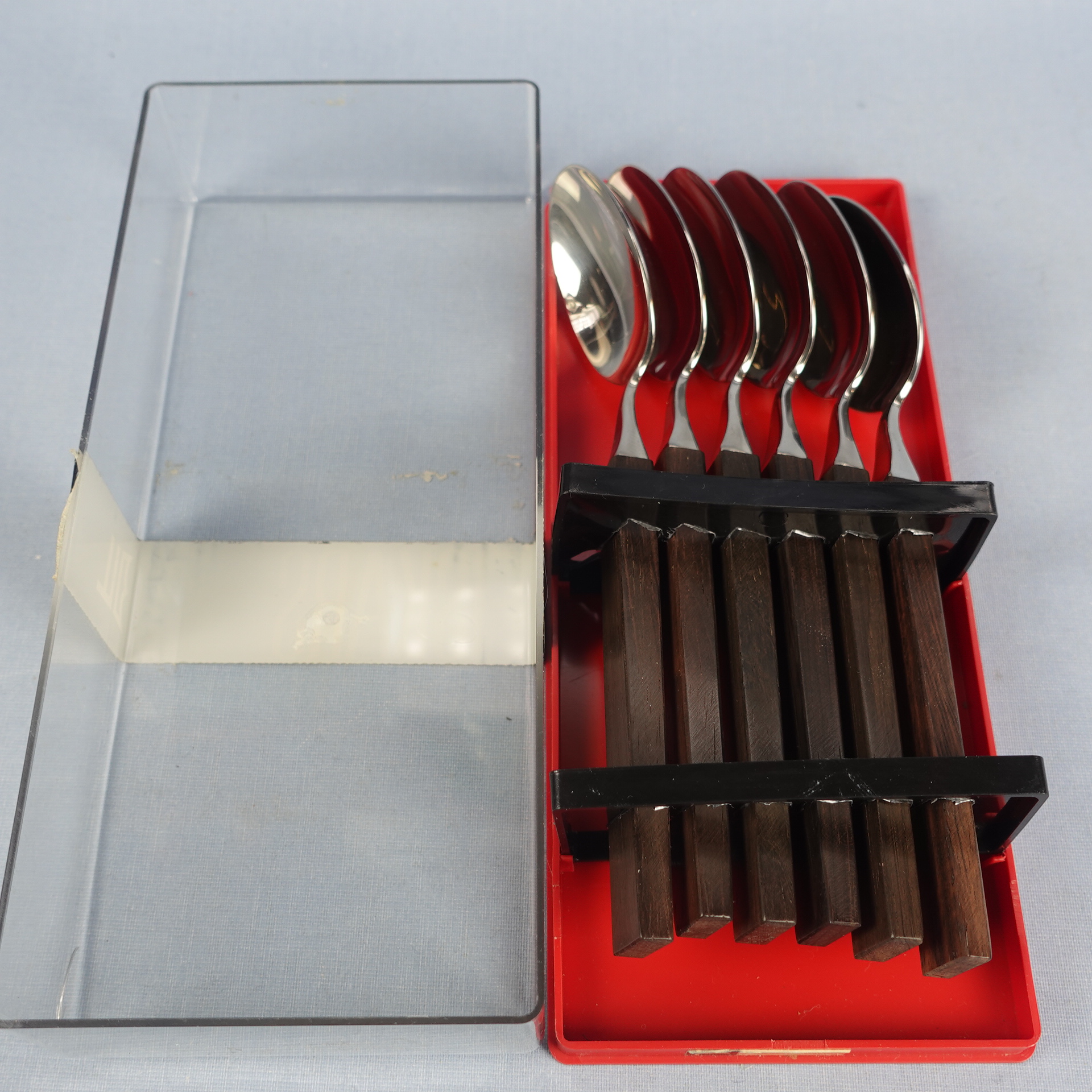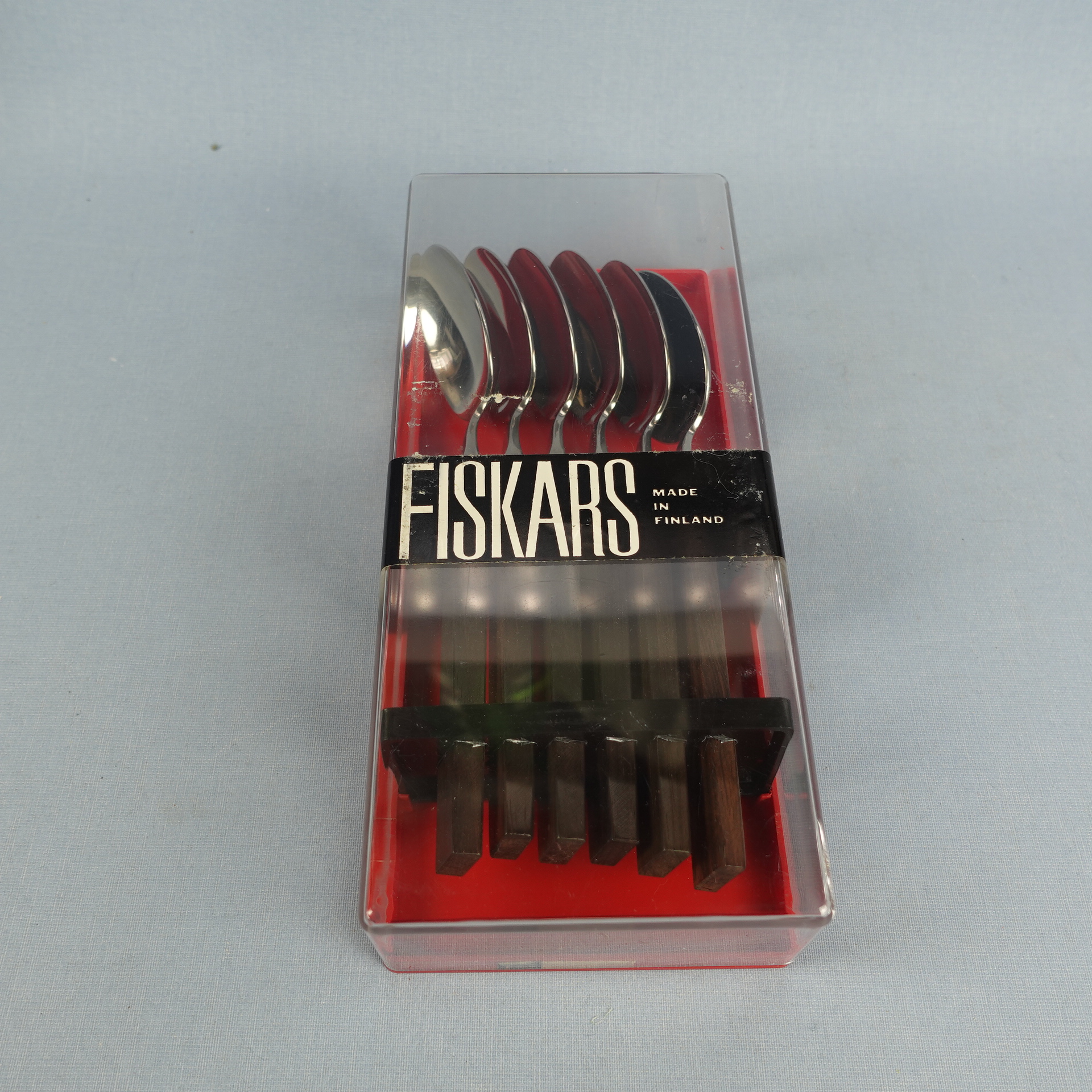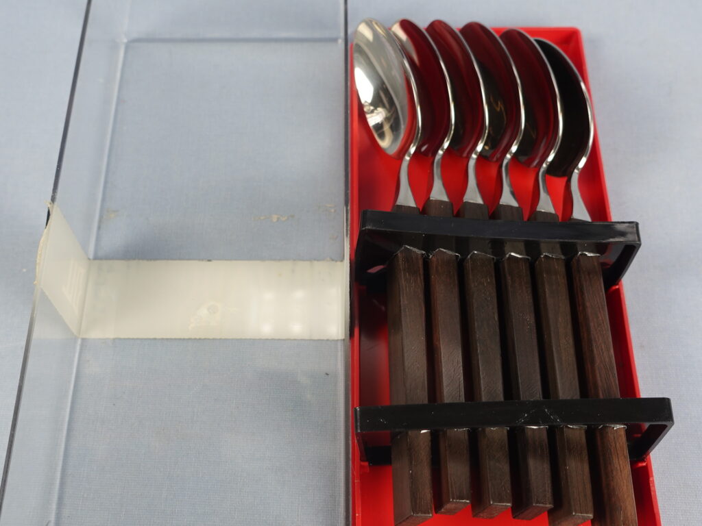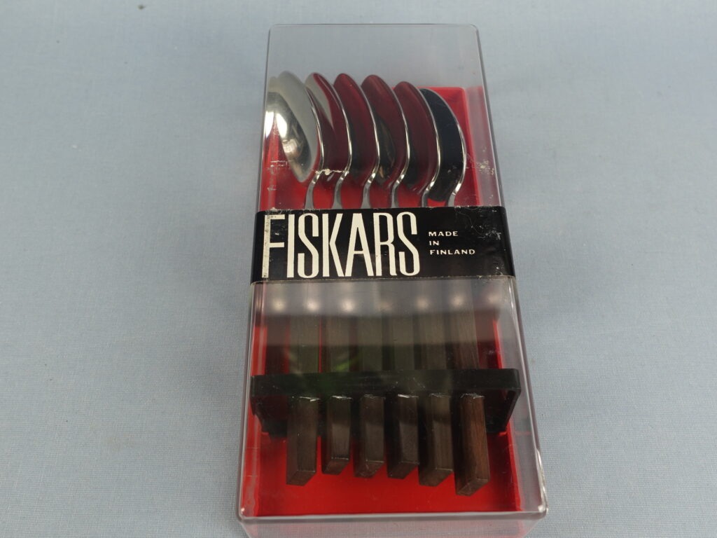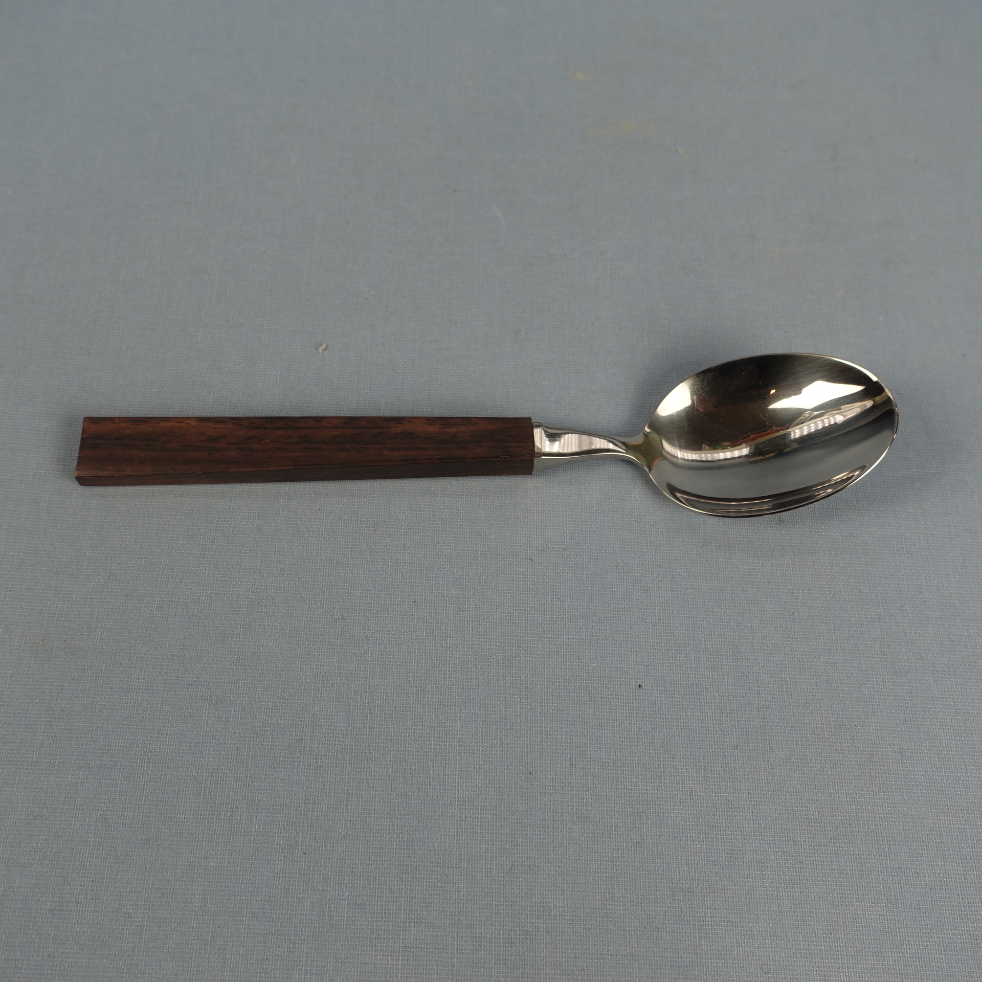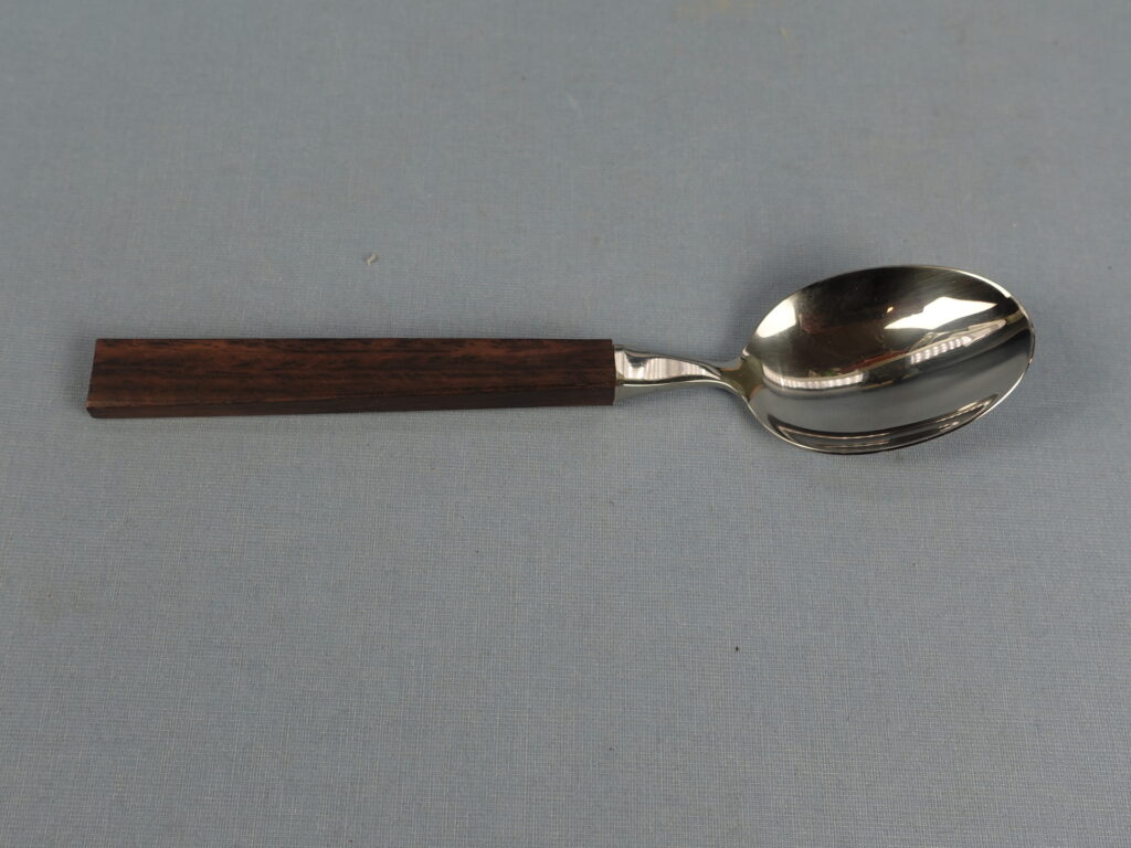 Triennale series spoons designed by Bertel Gardberg for Fiskars. The series was designed in 1957 and in the same year it was awarded a gold medal at the Milan Triennale. The handle of the spoon is made of palisander (rosewood) and the rest is stainless steel. The length of the spoon is 18 cm. The spoons for sale are unused and in their original packaging.