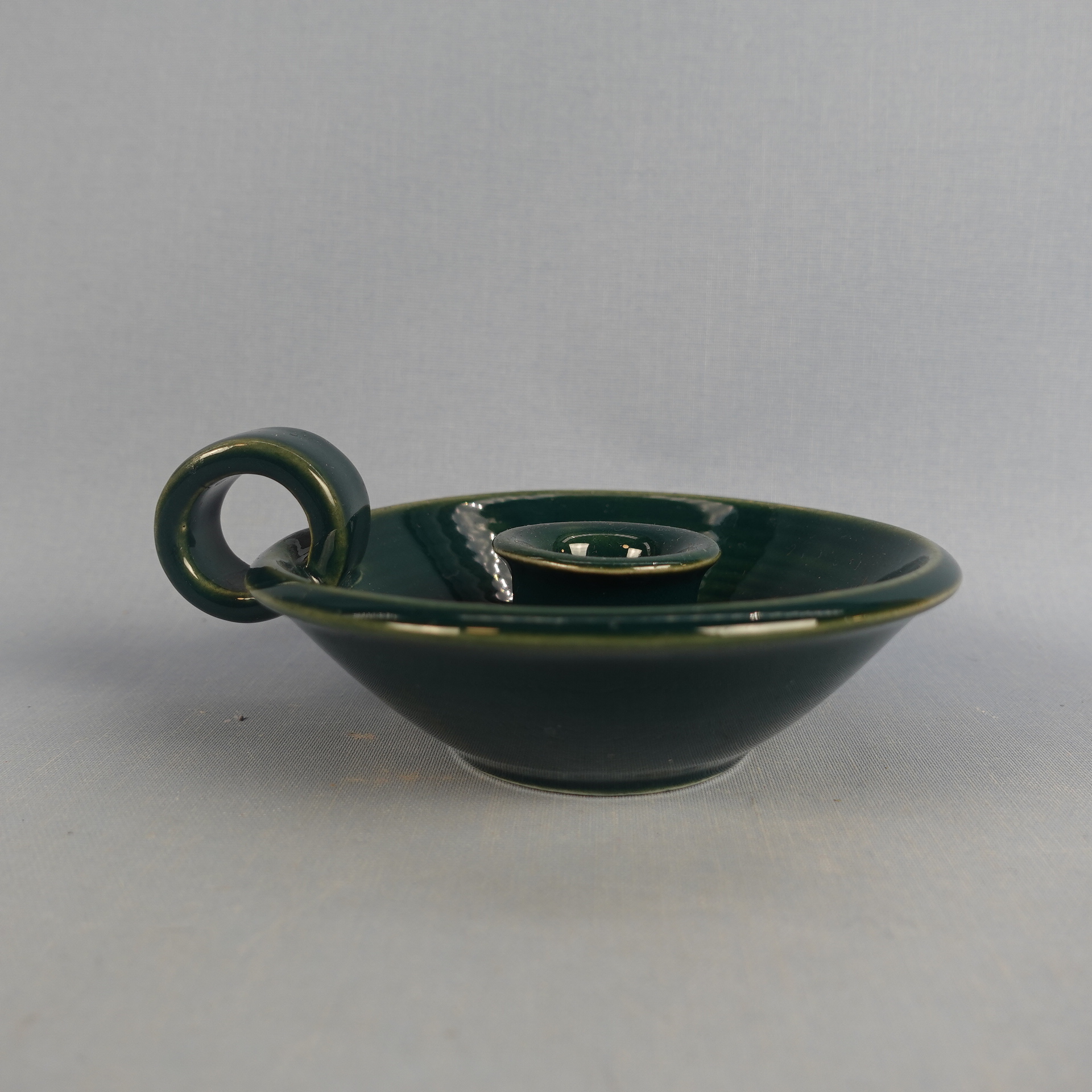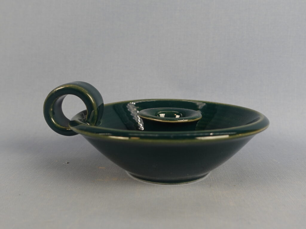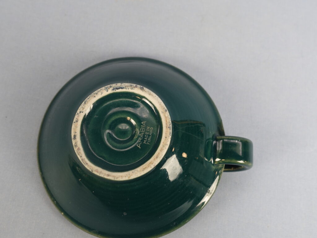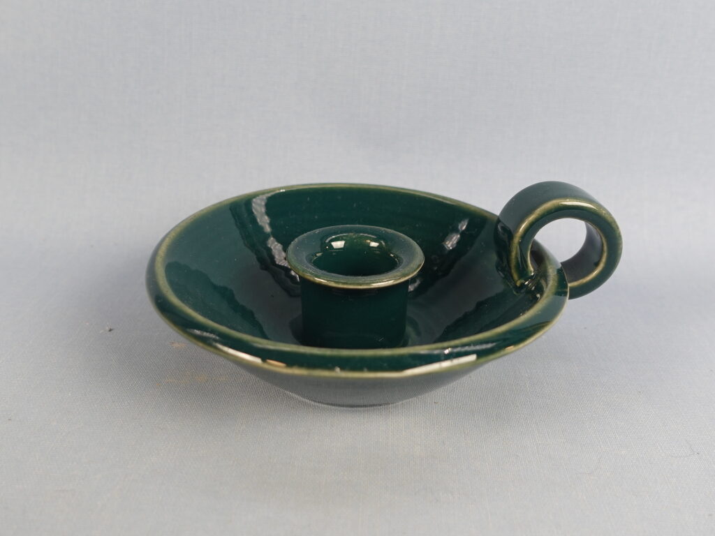 Green candlestick made by Arabia from the 1960s. The diameter of the candlestick is 12 cm and the height is 4 cm. The candlestick is intact and otherwise in good condition.