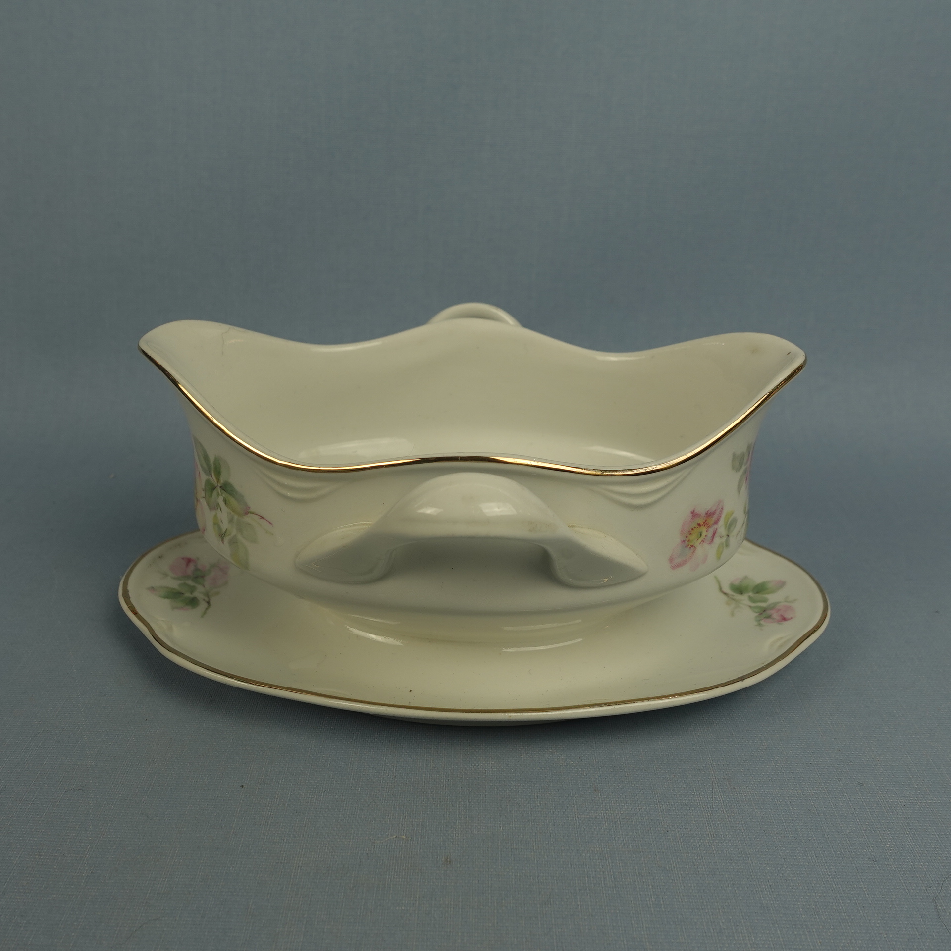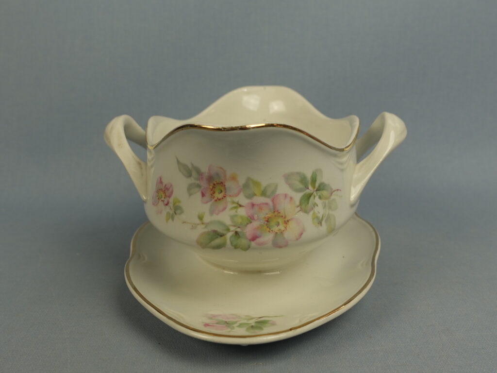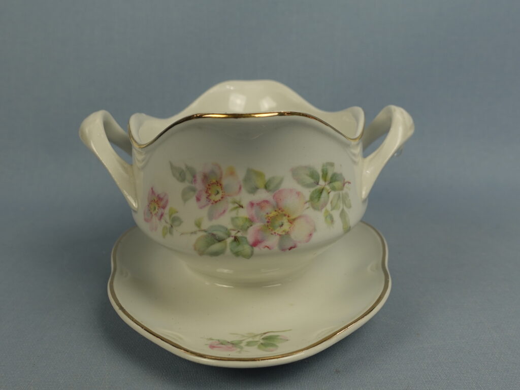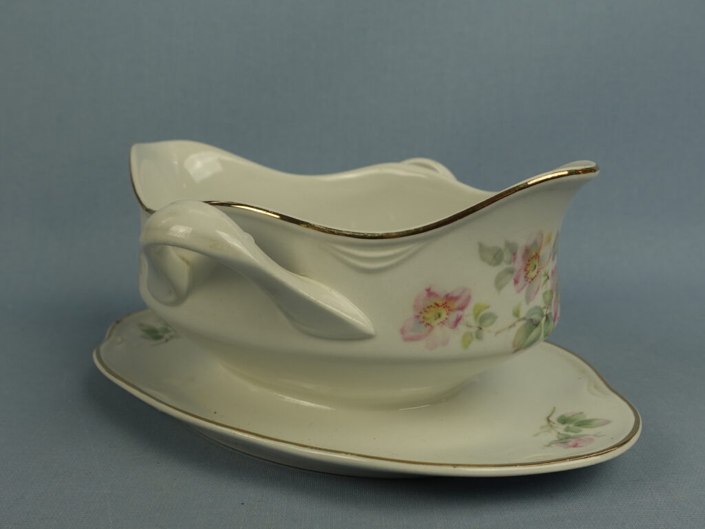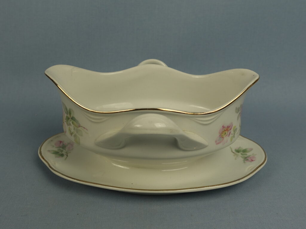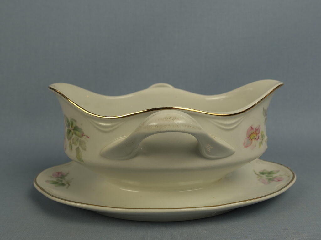 “Dog Rose” decorative sauce pot made by Arabia. The sauce pot is an FQ model and has a second quality stamp. The sauce pot is 18.5 cm wide, 14 cm deep, 8.5 cm high and has a volume of 40 cl. The sauce pot for sale is intact and otherwise in good condition.