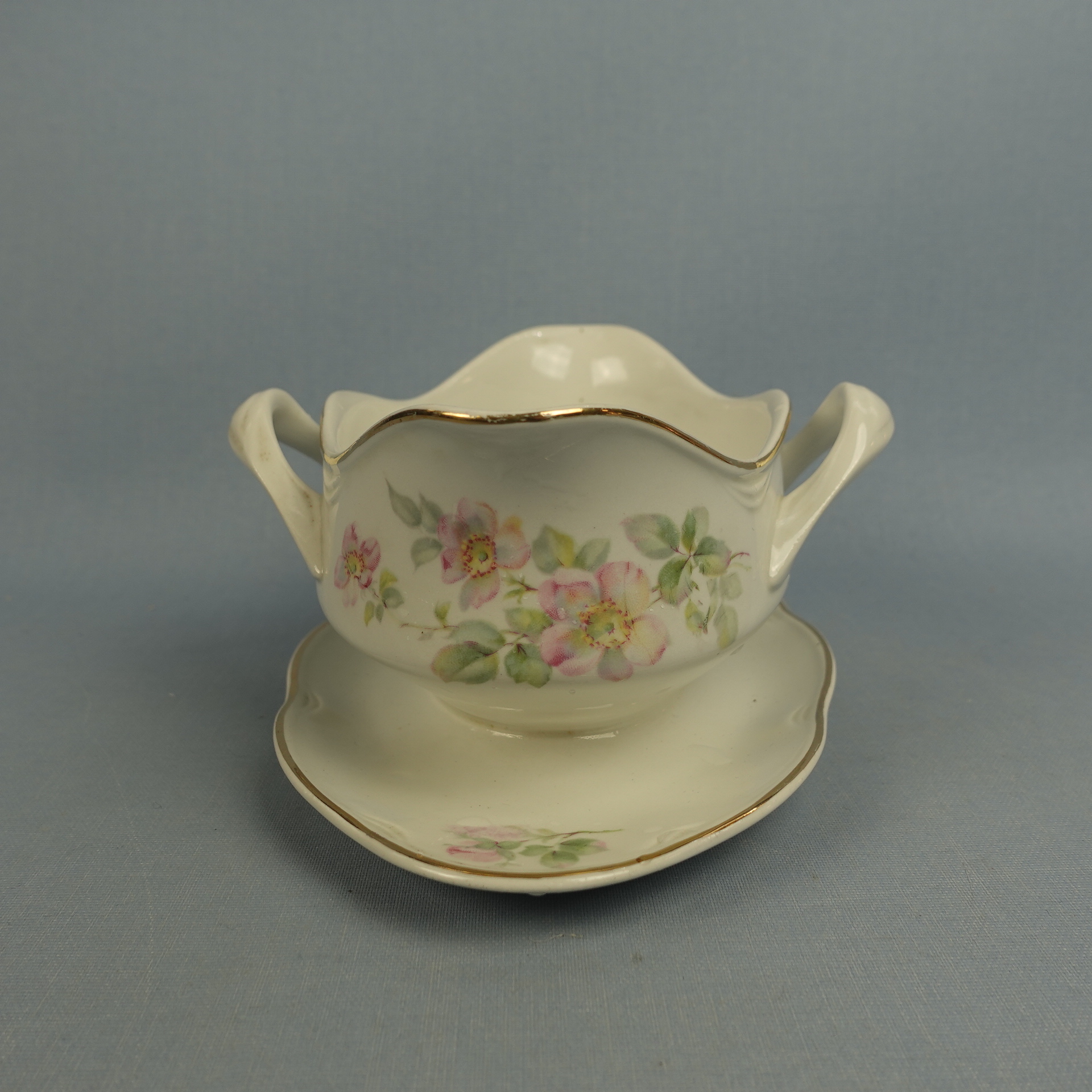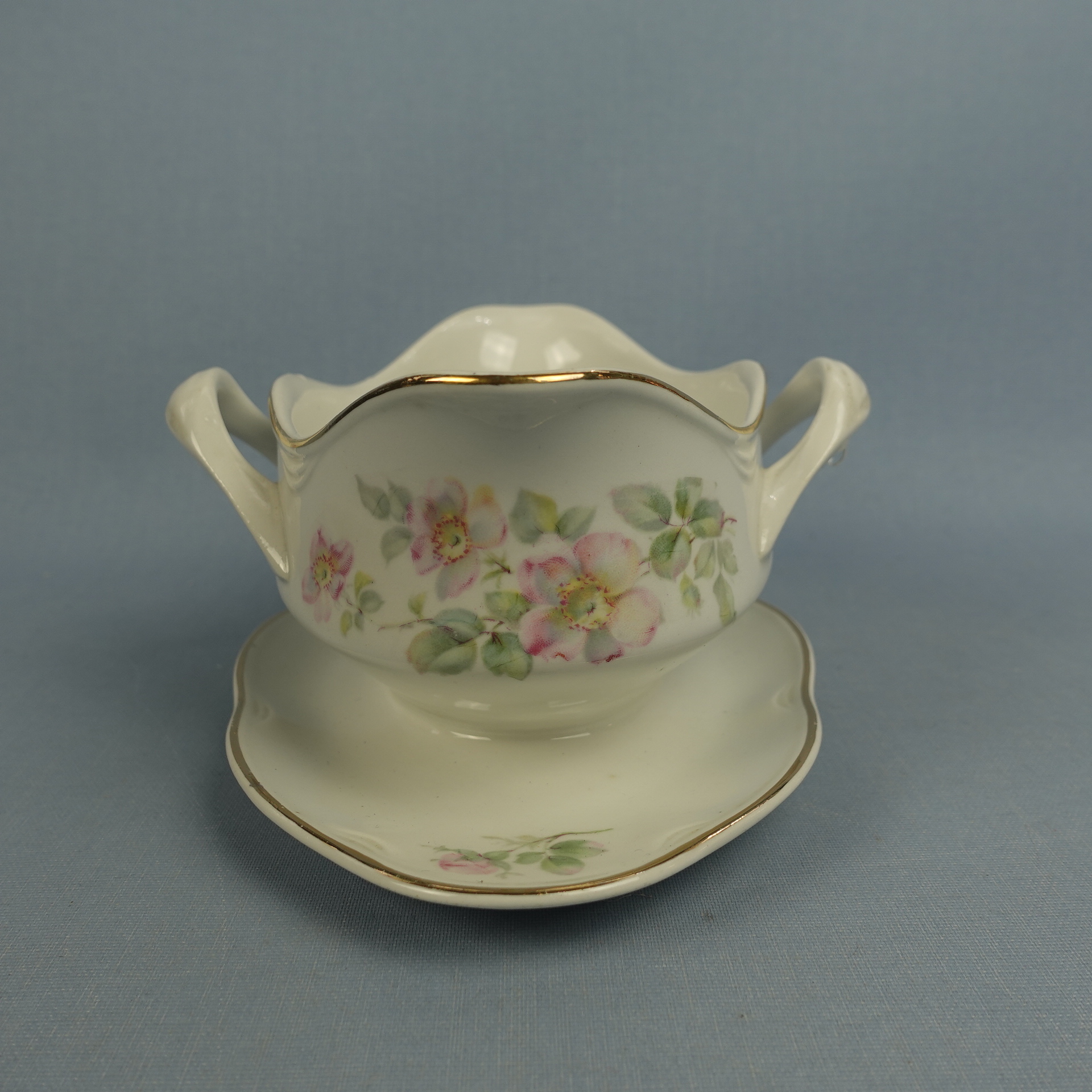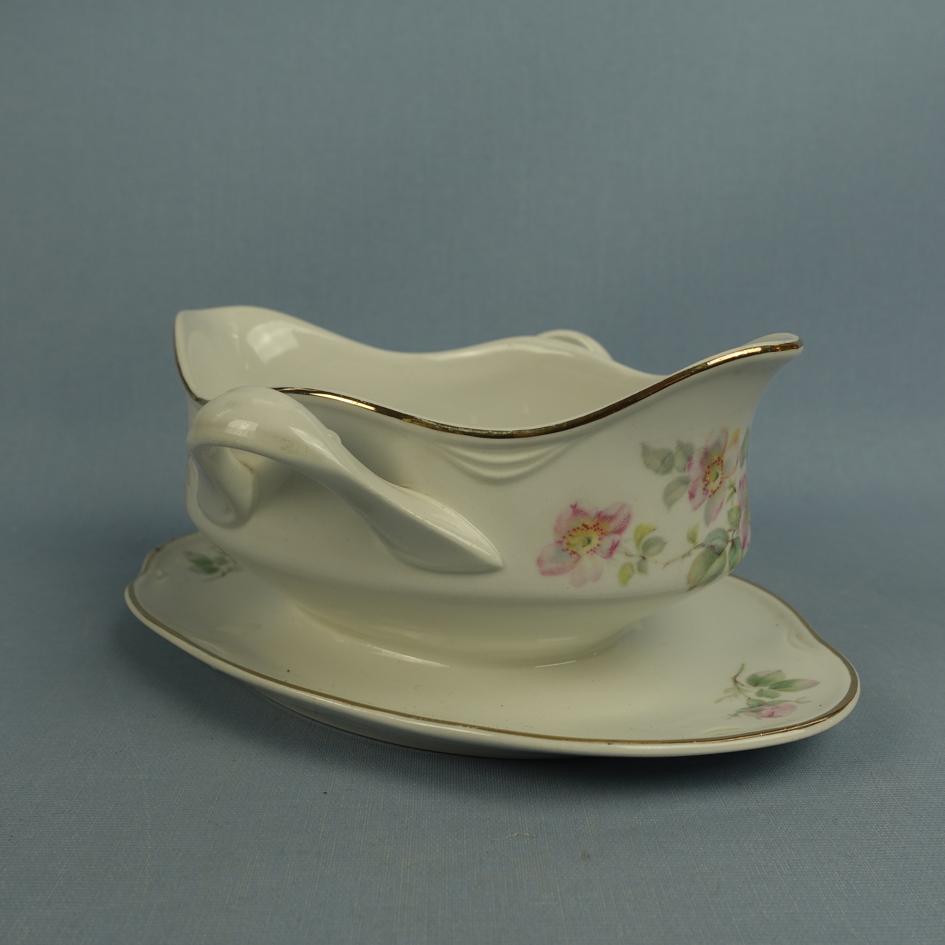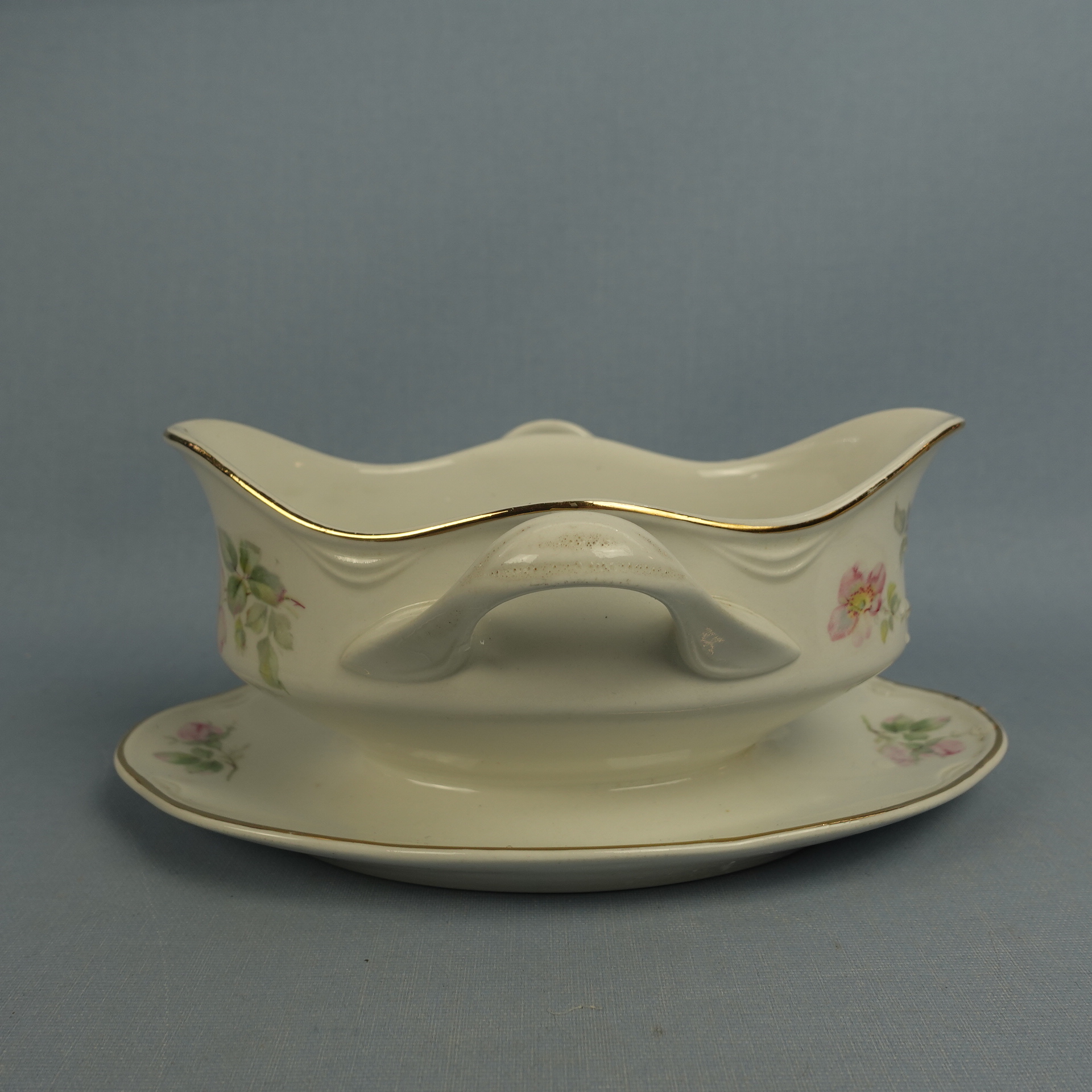 “Dog Rose” decorative sauce pot made by Arabia. The sauce pot is an FQ model and has a second quality stamp. The sauce pot is 18.5 cm wide, 14 cm deep, 8.5 cm high and has a volume of 40 cl. The sauce pot for sale is intact and otherwise in good condition.