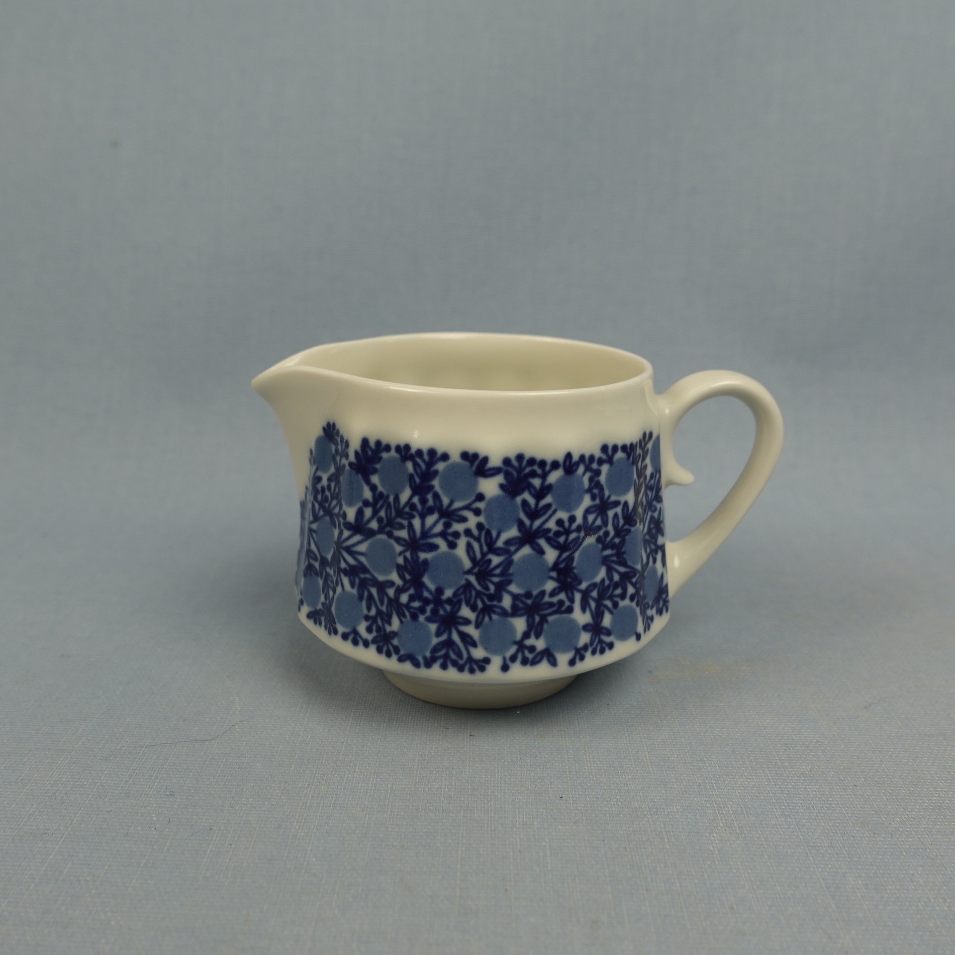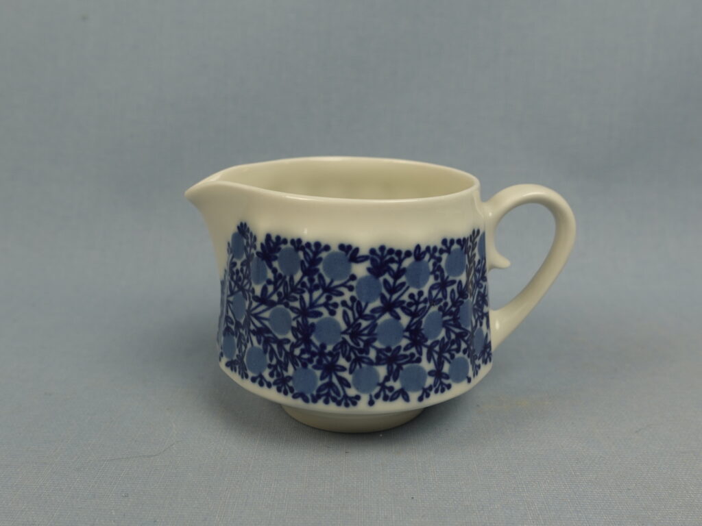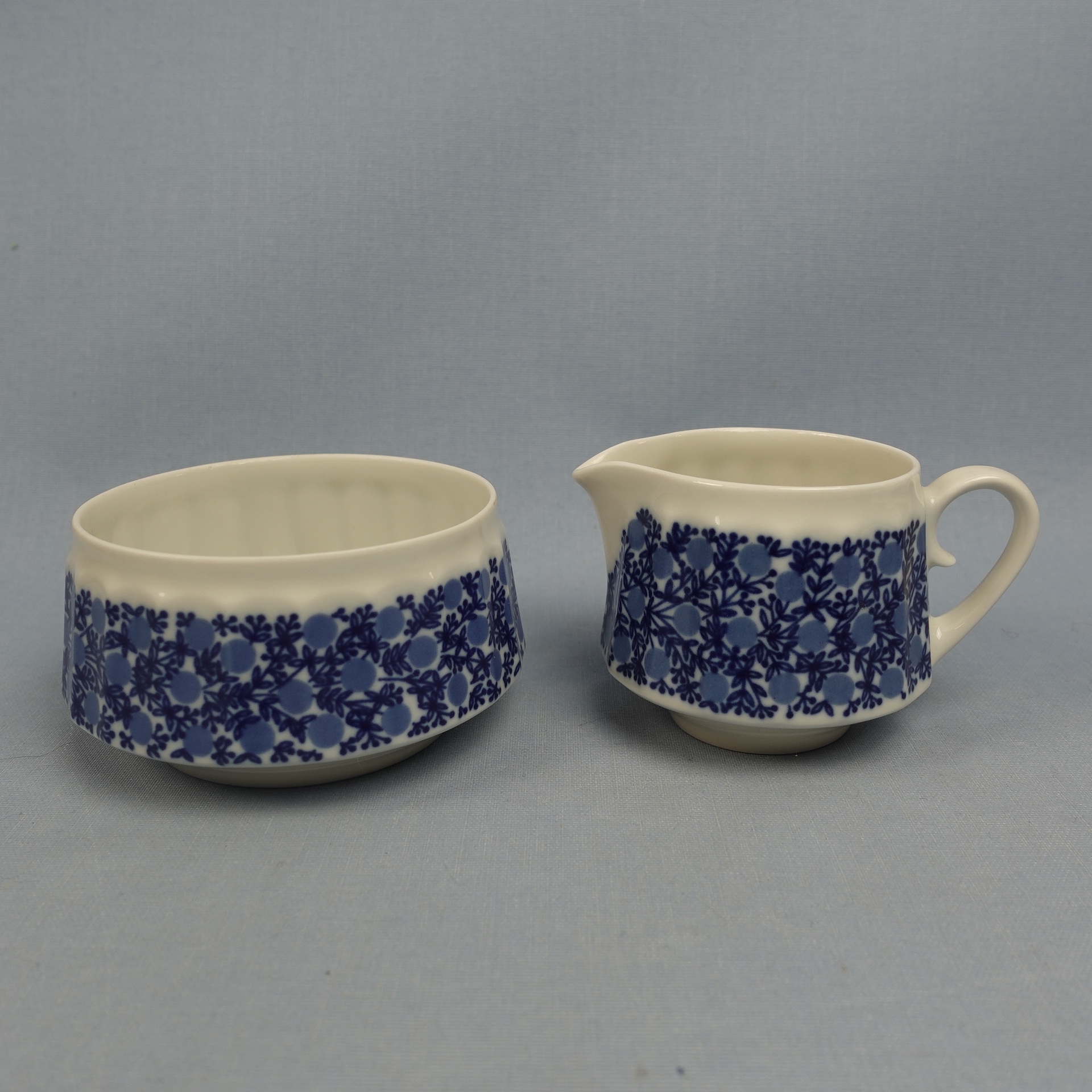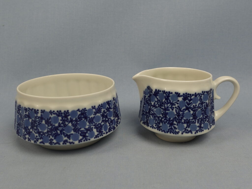 Slightly rare sugar bowl and creamer from the Doria series designed by Raija Uosikkinen for Arabia. The decoration was produced on the DG series dishes designed by Richard Lindh in 1965-71. The sugar bowl and creamer for sale are intact and otherwise in good condition. The sugar bowl and creamer are sold as separate products.