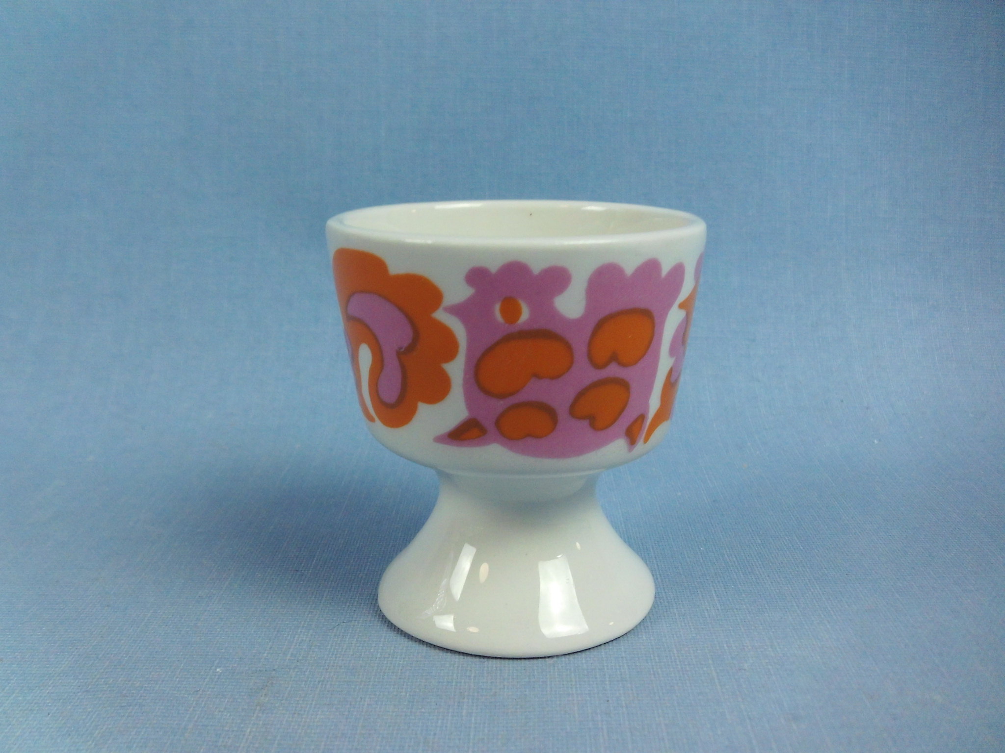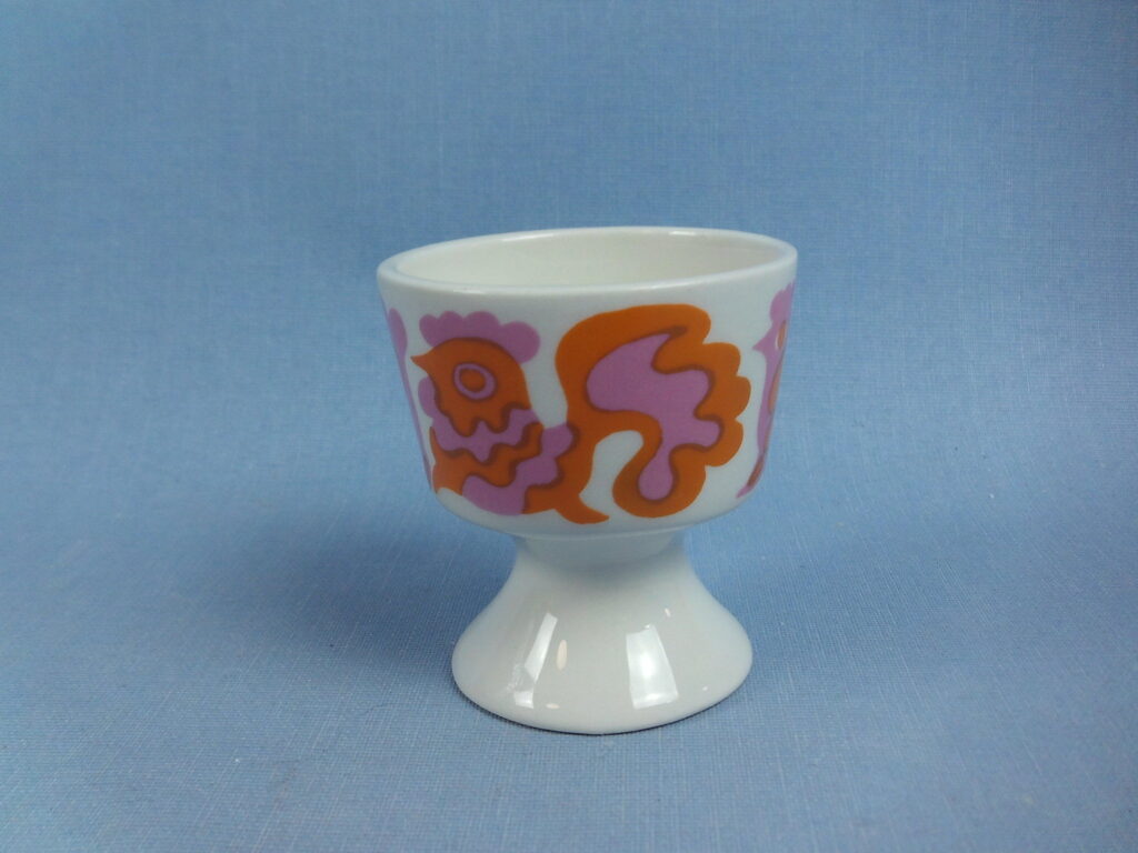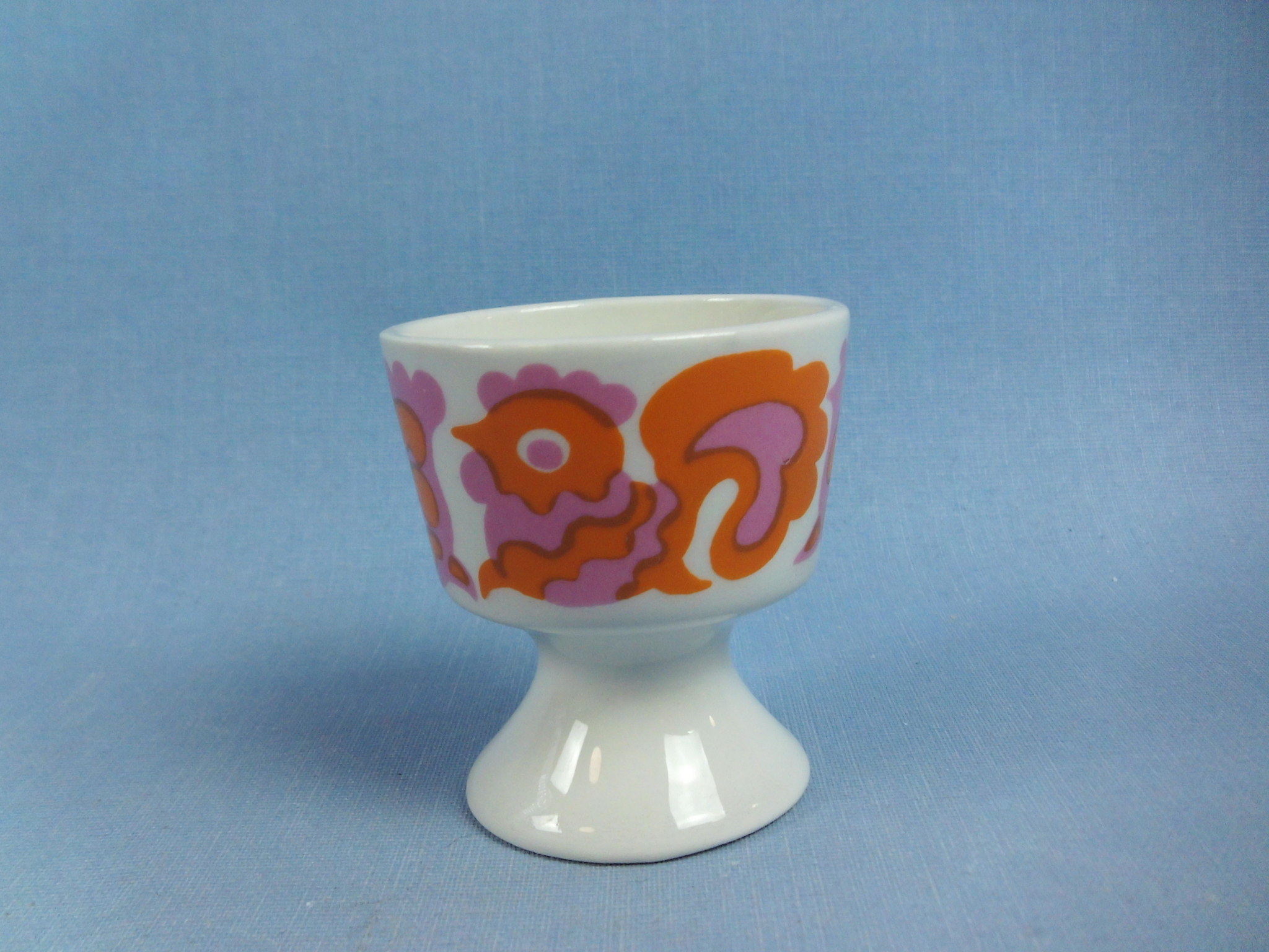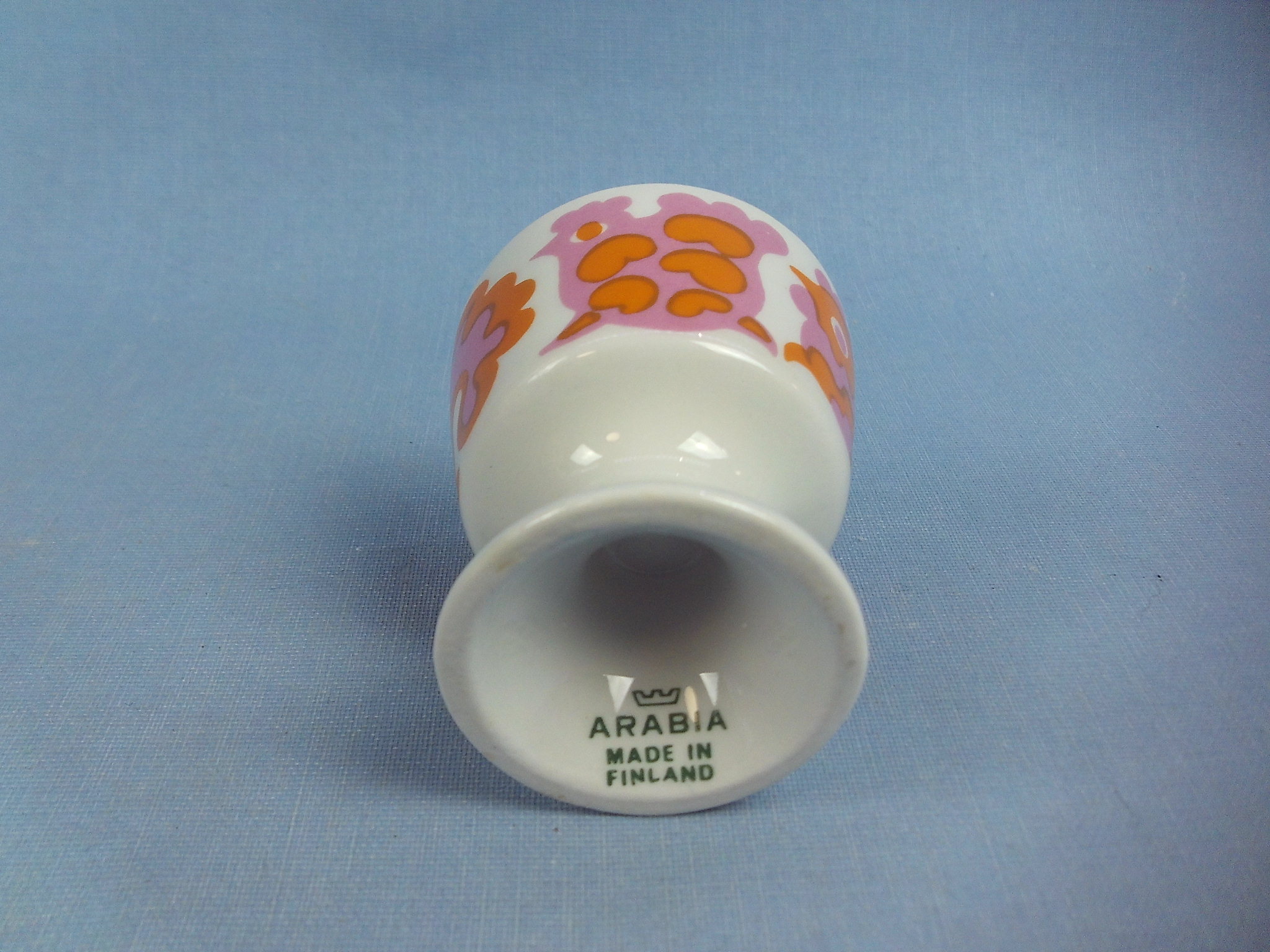 Orange Emma egg cup designed by Gunvor Olin-Grönqvist for Arabia. The decoration was produced on HN model egg cups designed by Kaarina Aho in the early 1970s. The egg cup is 5.4 cm high and 4.8 cm in diameter. The egg cup for sale is intact and otherwise in good condition.