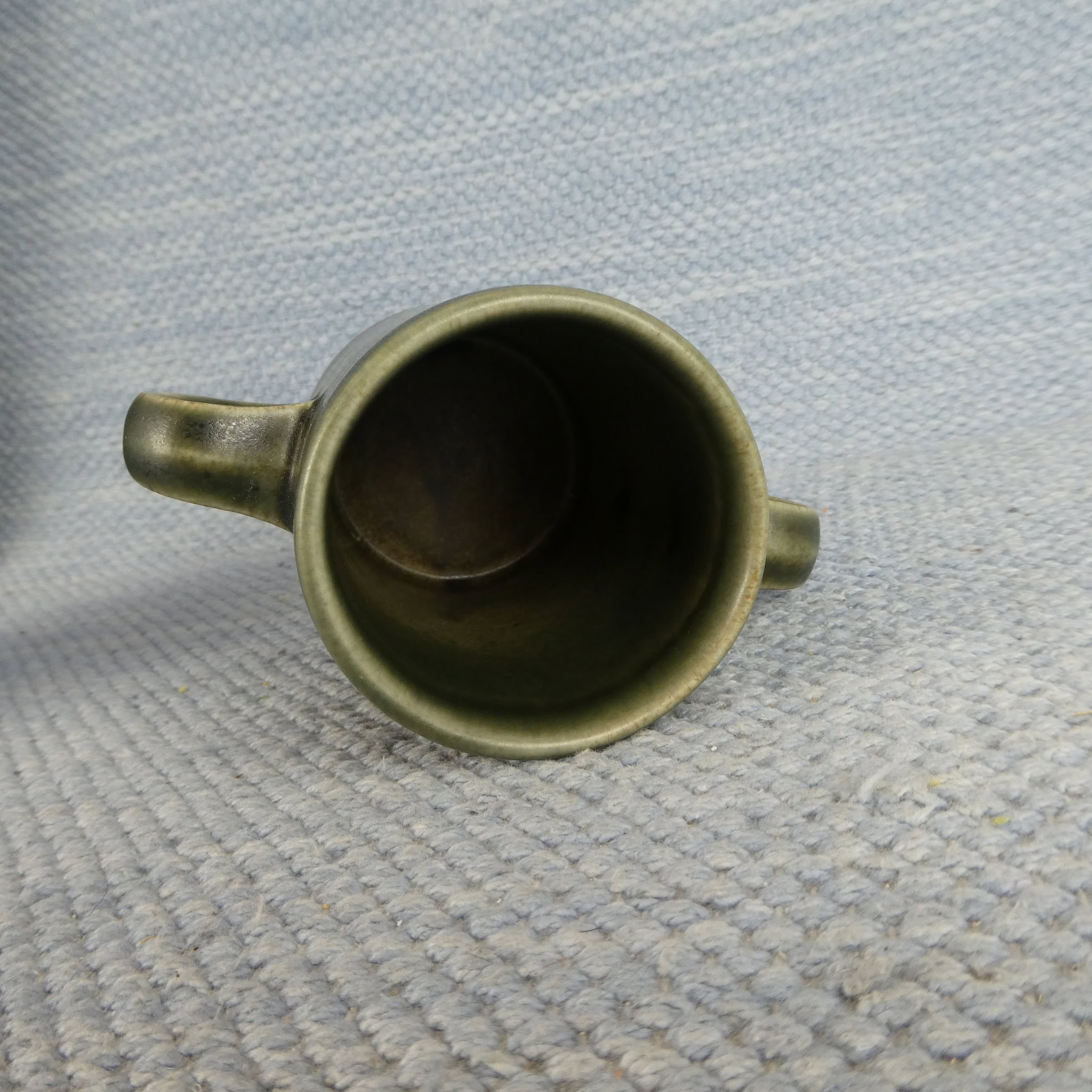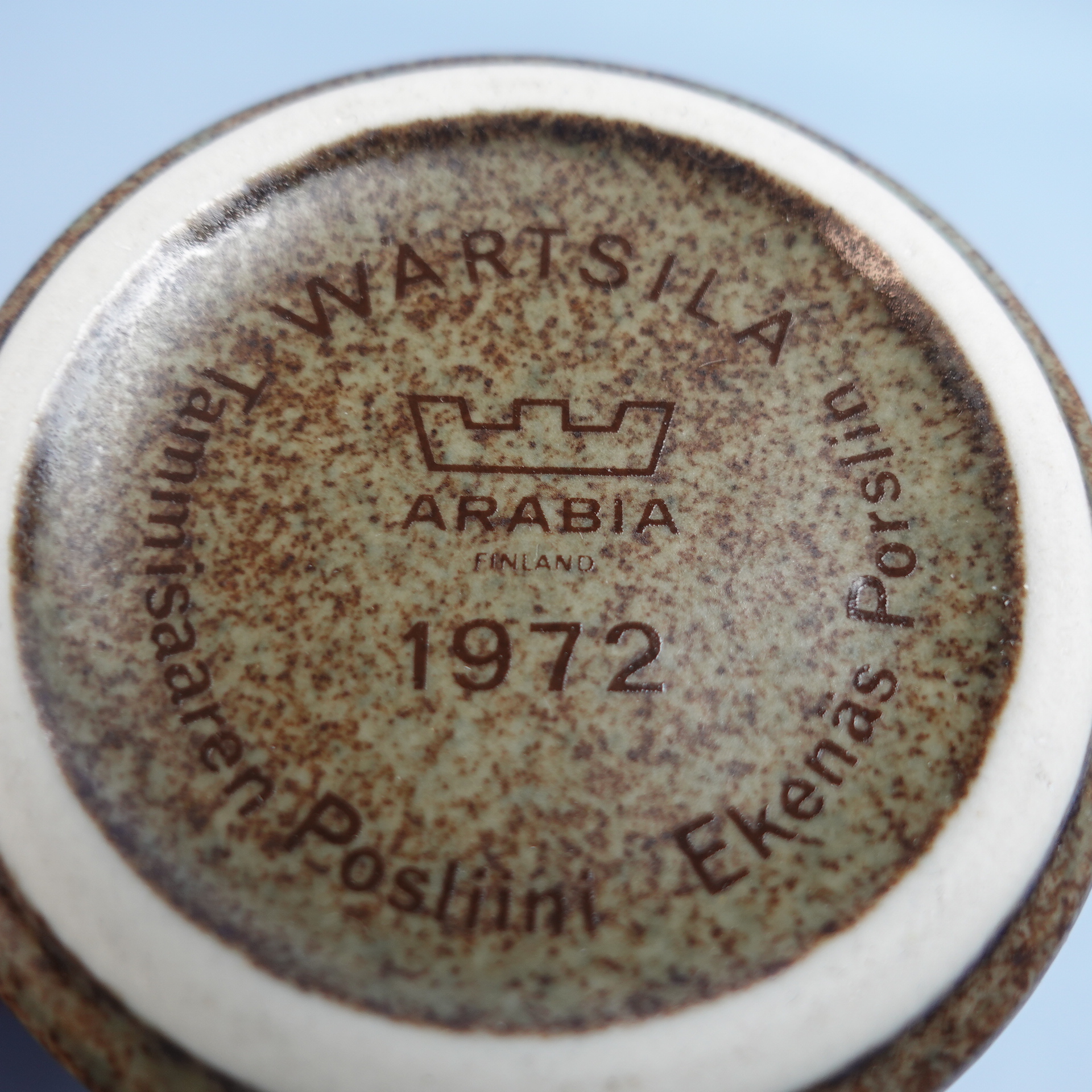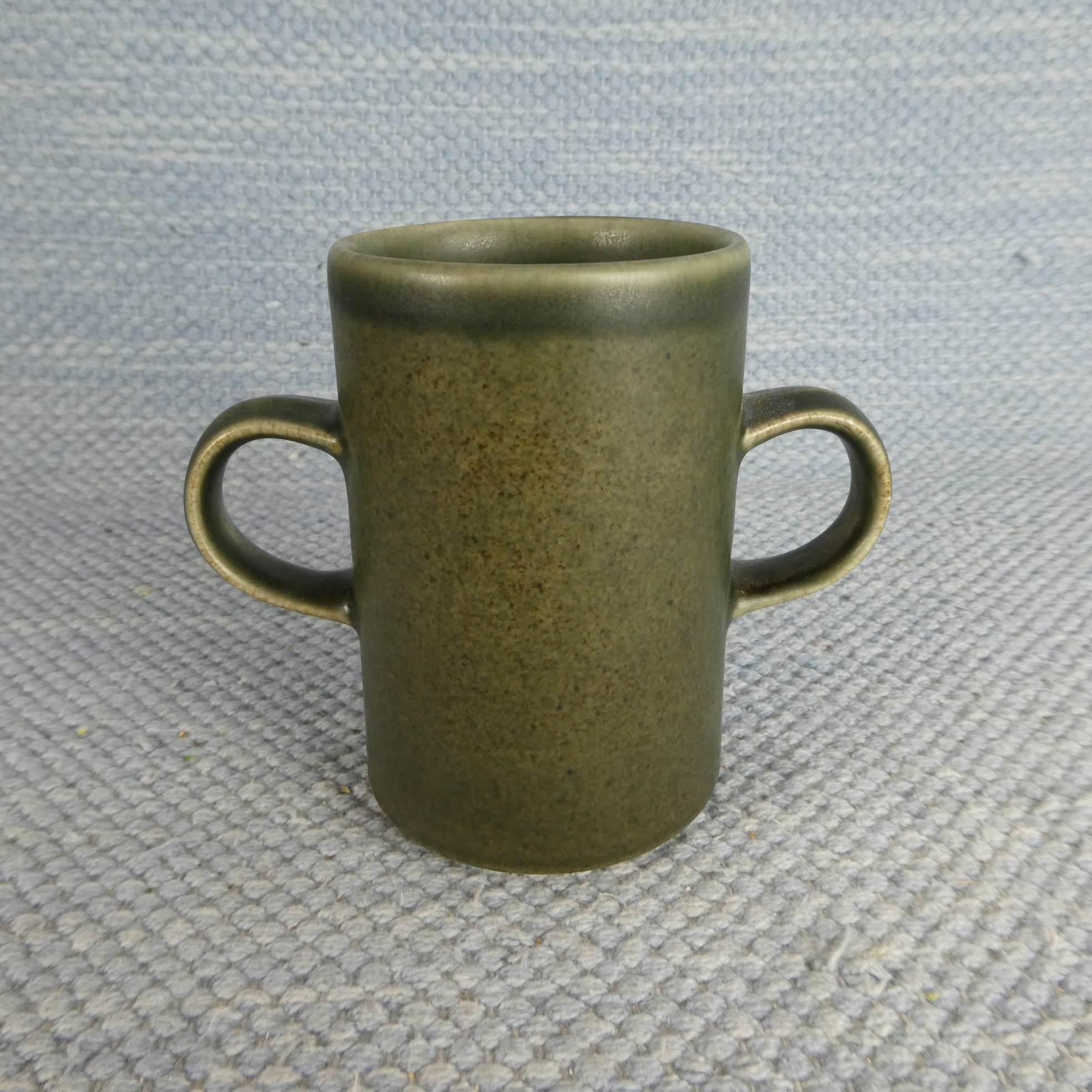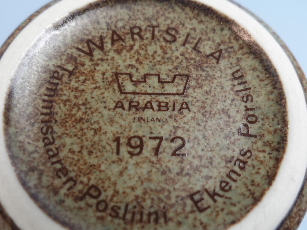 Arabia two-handled mug, brown. Made in the early 1970s. The mug’s height is 10.5 cm and its diameter is 7 cm. The mugs are intact and otherwise in good condition. There is no stamp on the base.
