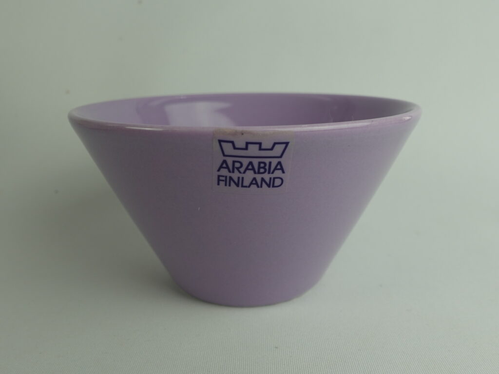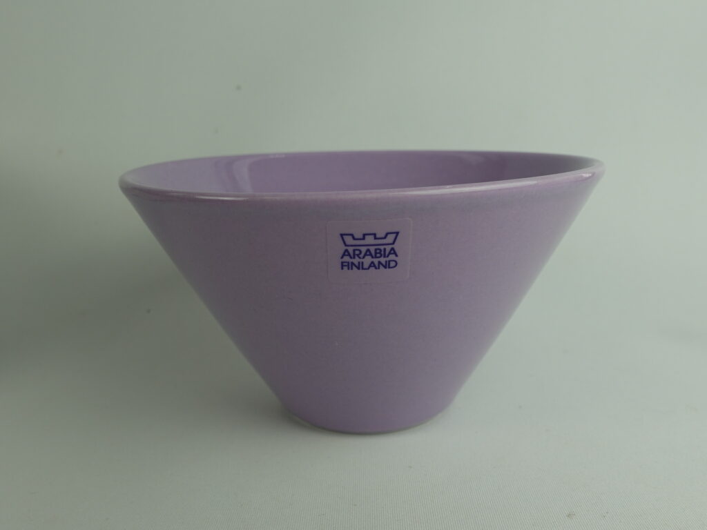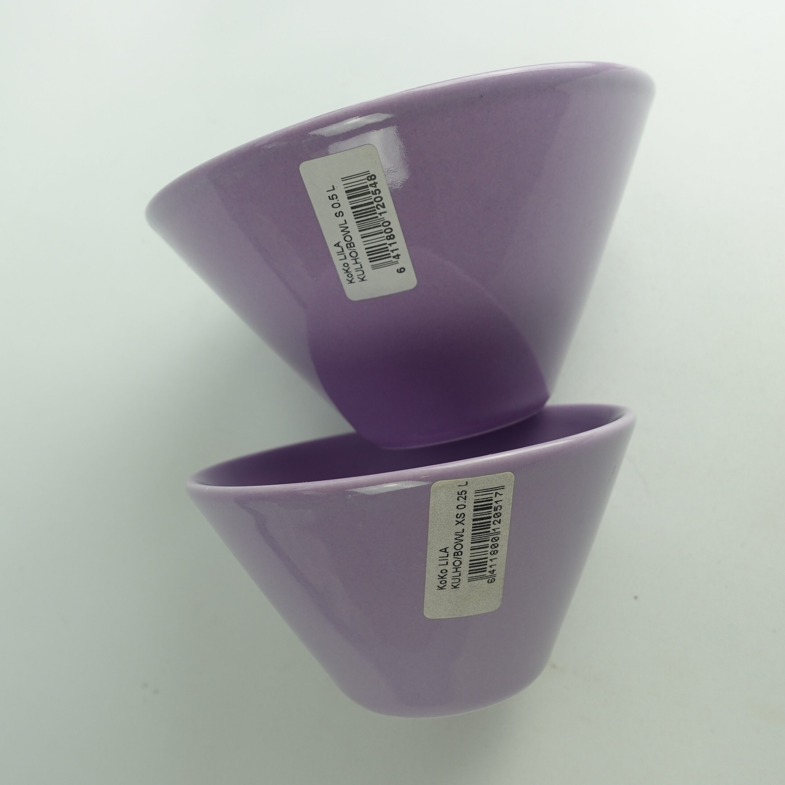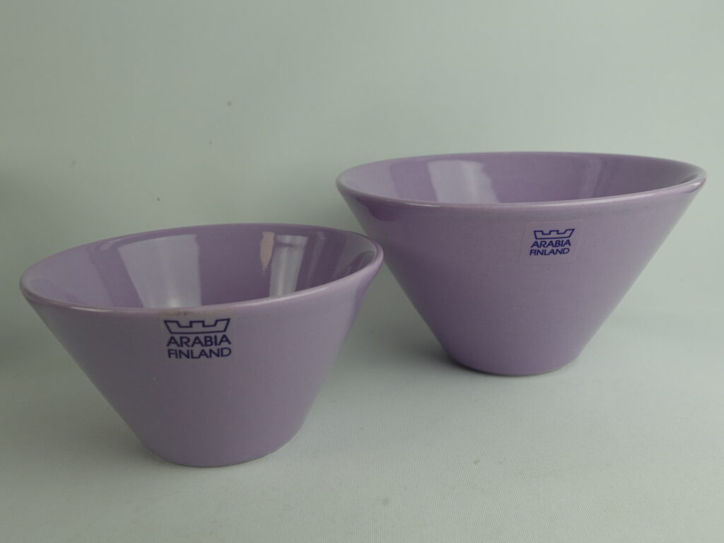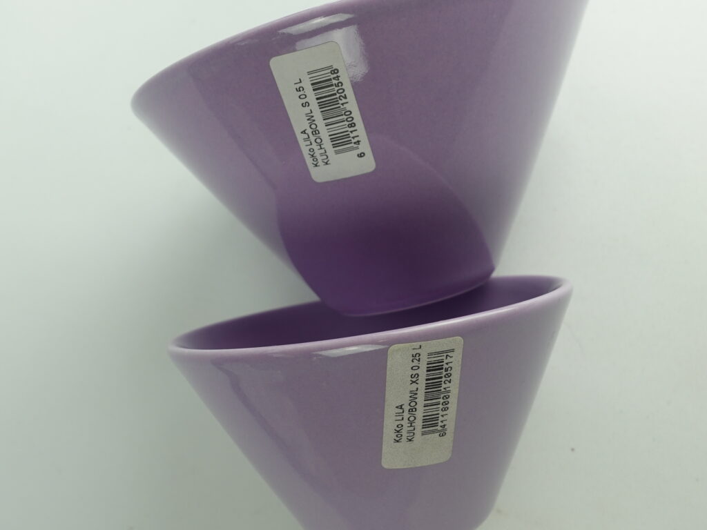 Lilac colored XS and S bowls from the KoKo series designed by Kati Tuominen-Niittylä and Kristina Riska for Arabia. The color was in production in 2008-11. The XS bowl is 6.5 cm high, 12 cm in diameter and has a capacity of 25 cl. The S bowl is 8.5 cm high, 15.3 cm in diameter and has a capacity of 50 cl. The bowls for sale are unused.