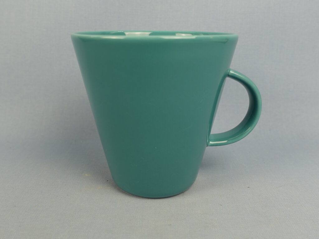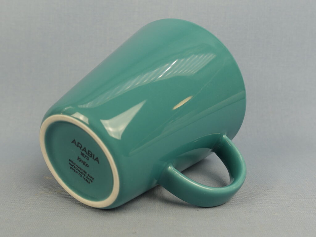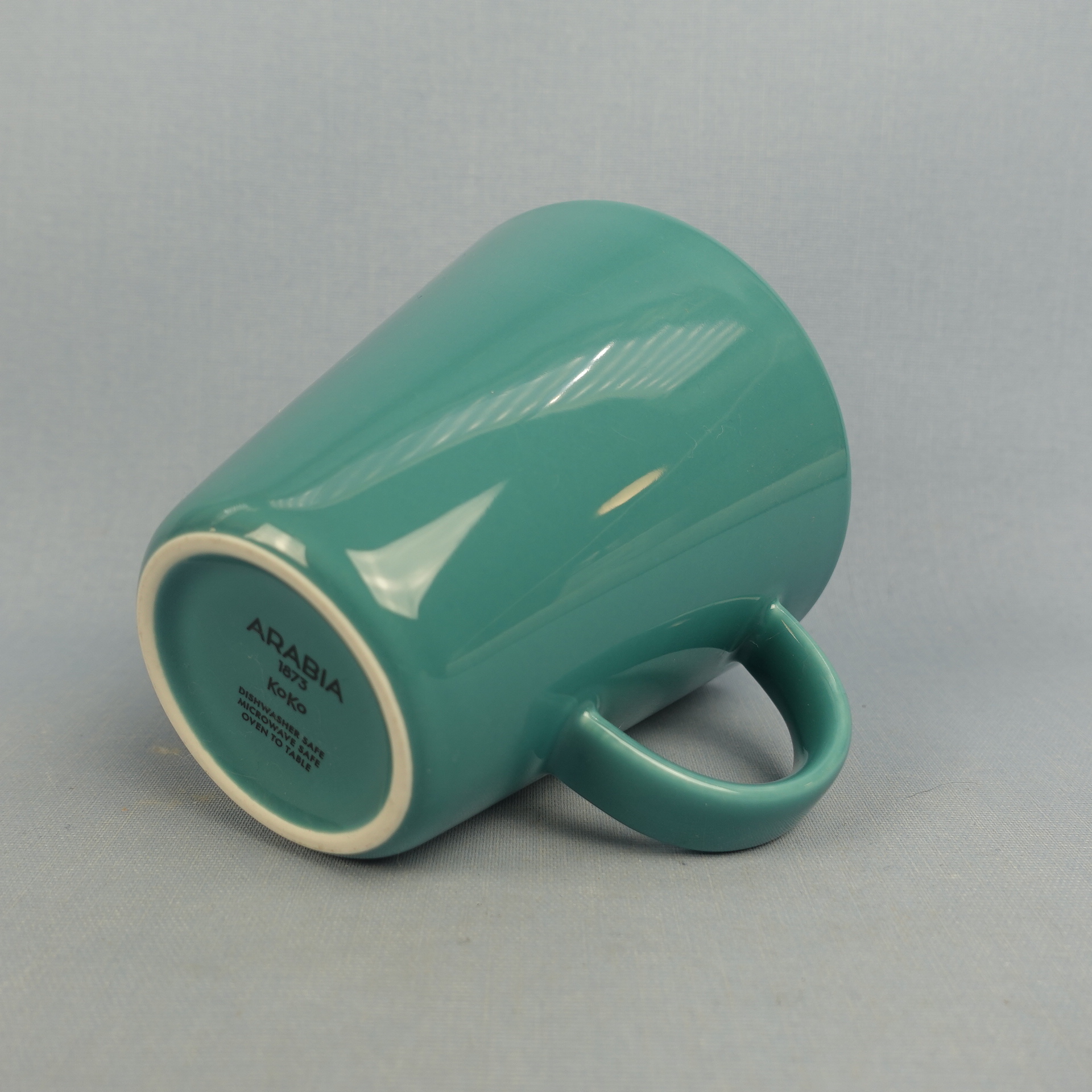 Lagoon-colored mug from the KoKo series designed by Kati Tuominen-Niittylä and Kristina Riska for Arabia. The color was in production in 2022-25. The mug is 10 cm high, 9.8 cm in diameter and has a capacity of 35 cl. The mug for sale is intact and in good condition.