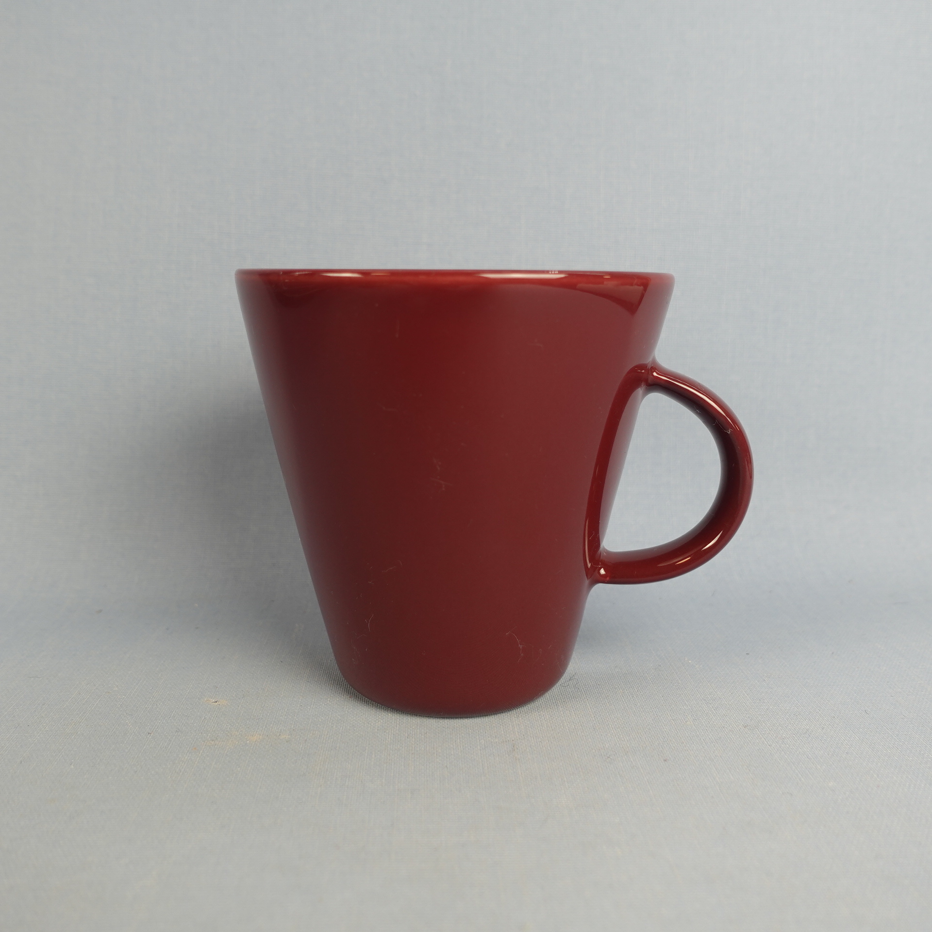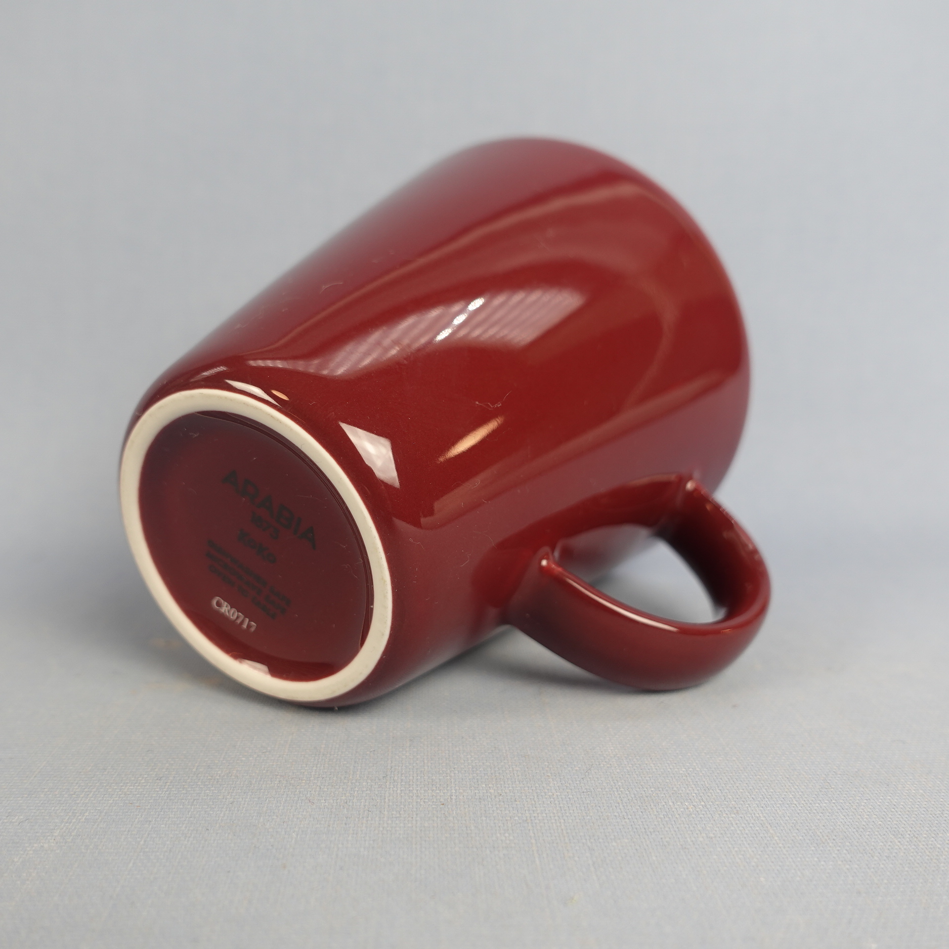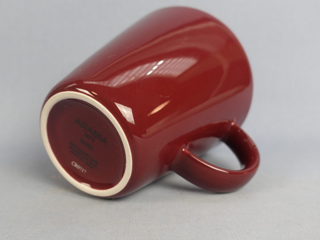 A cherry mug from the KoKo series designed by Kati Tuominen-Niittylä and Kristina Riska for Arabia. The mug is 10 cm high, 10 cm in diameter and has a capacity of 35 cl. The mug for sale is intact and in good condition.