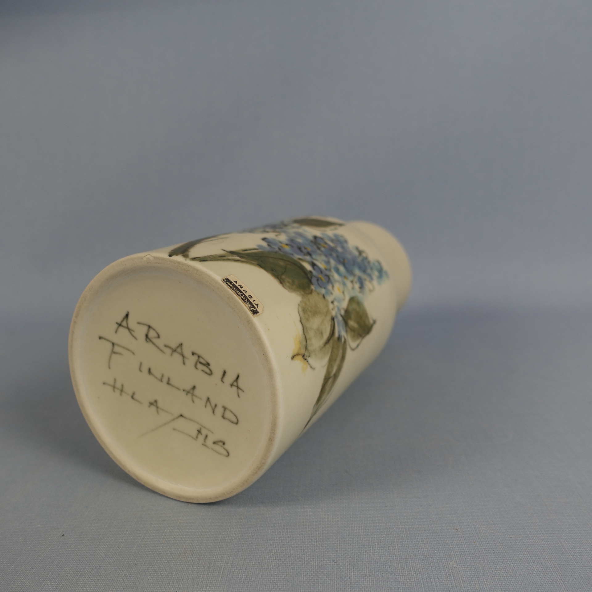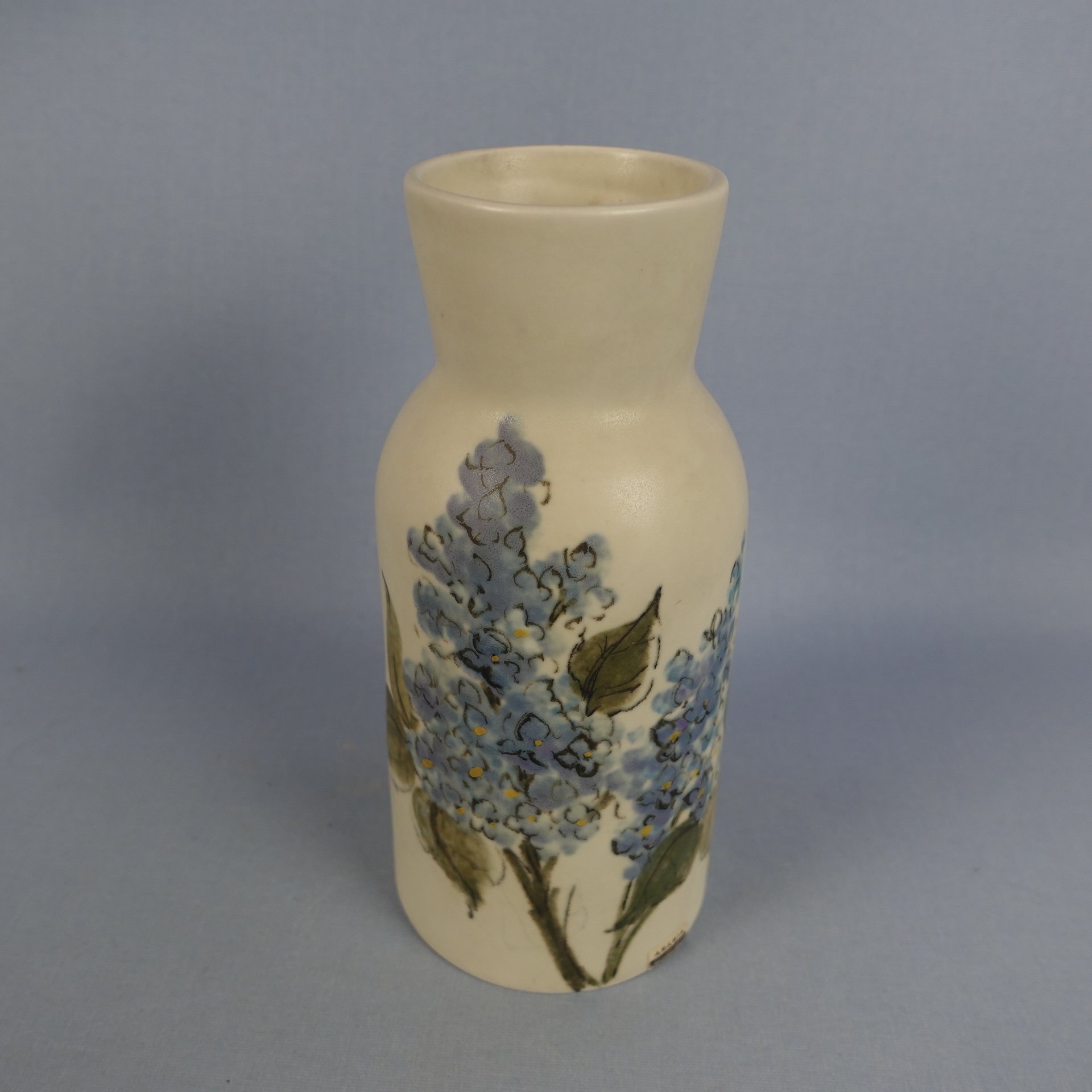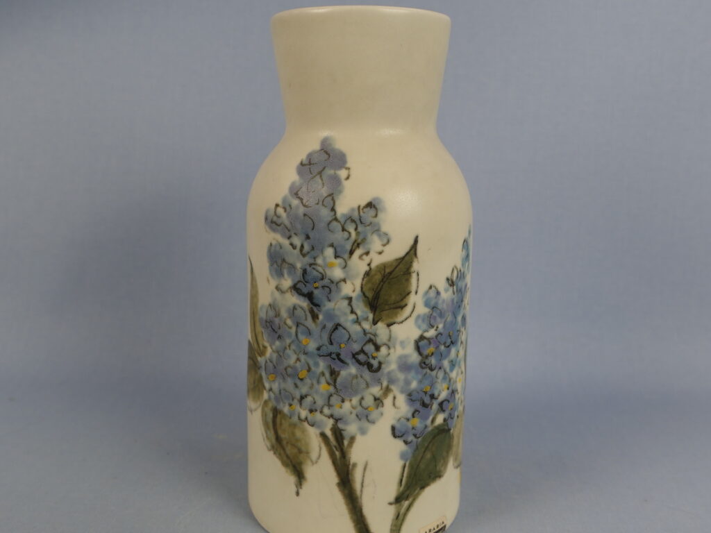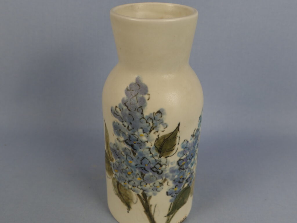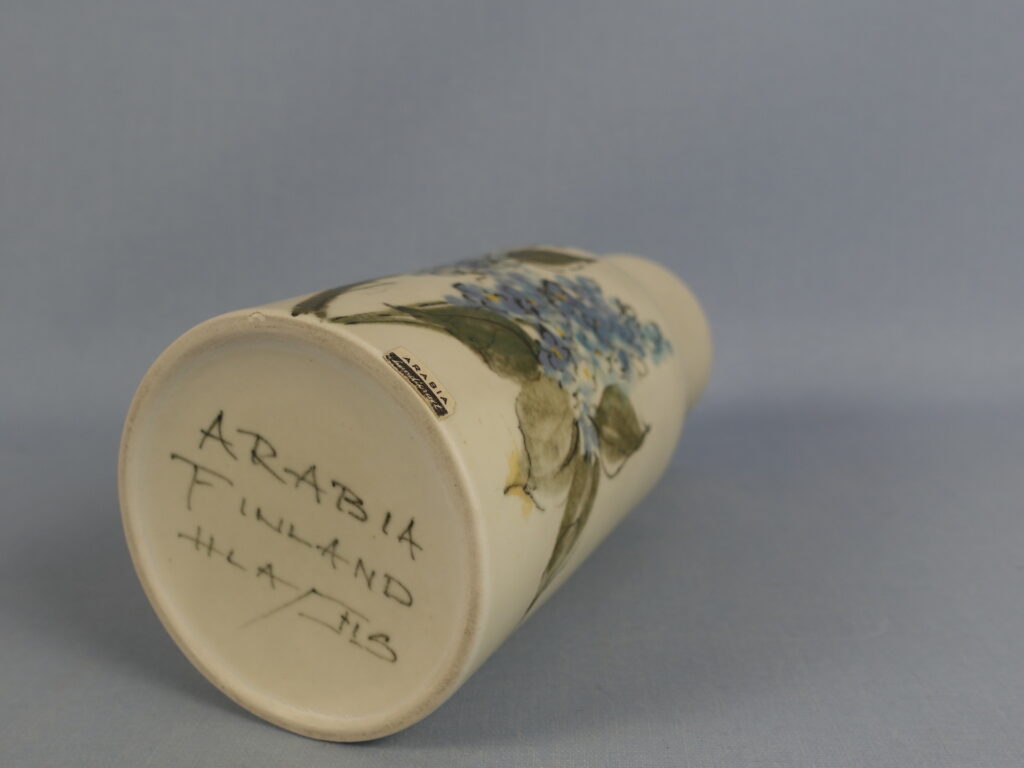 Vase from the Kukka-series designed by Hilkka-Liisa Ahola for Arabia, featuring lilac flowers. The vase was in production from 1958-75. The height of the vase is 18.5 cm and the mouth diameter is approximately 6 cm. The vase for sale is intact and otherwise in good condition.