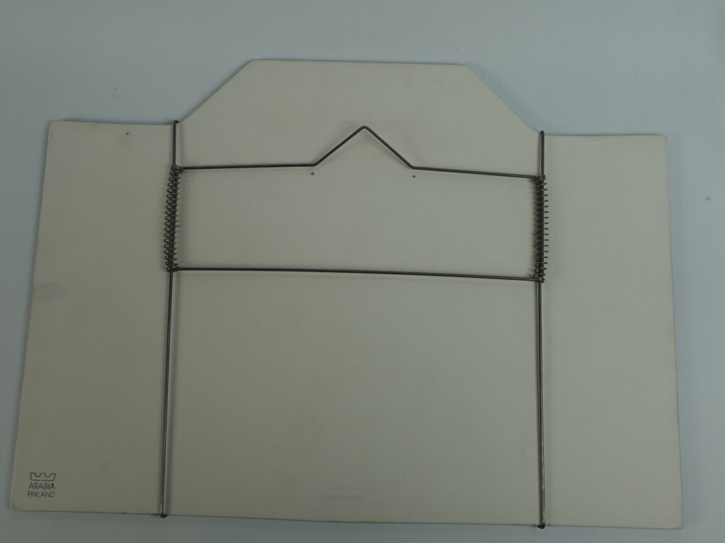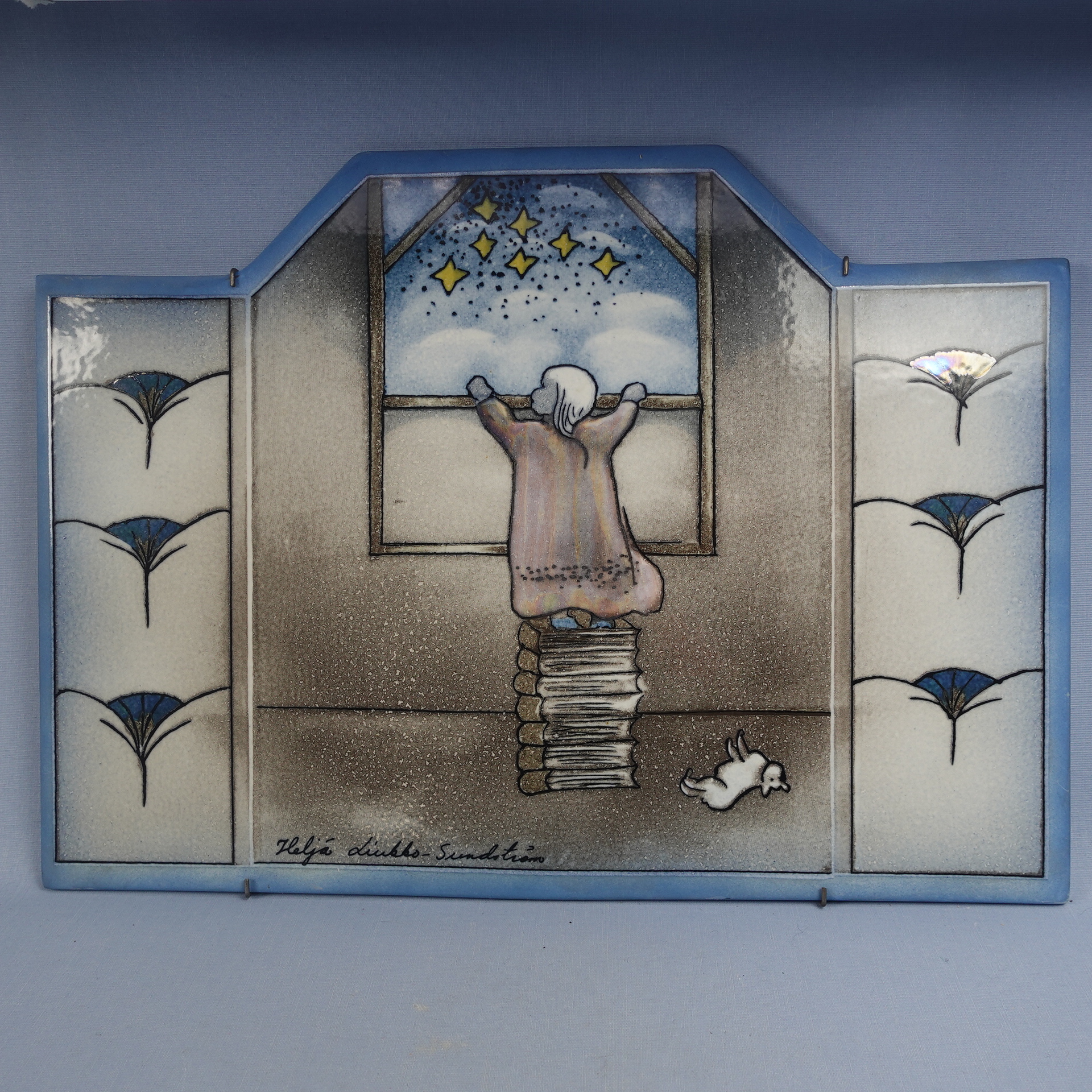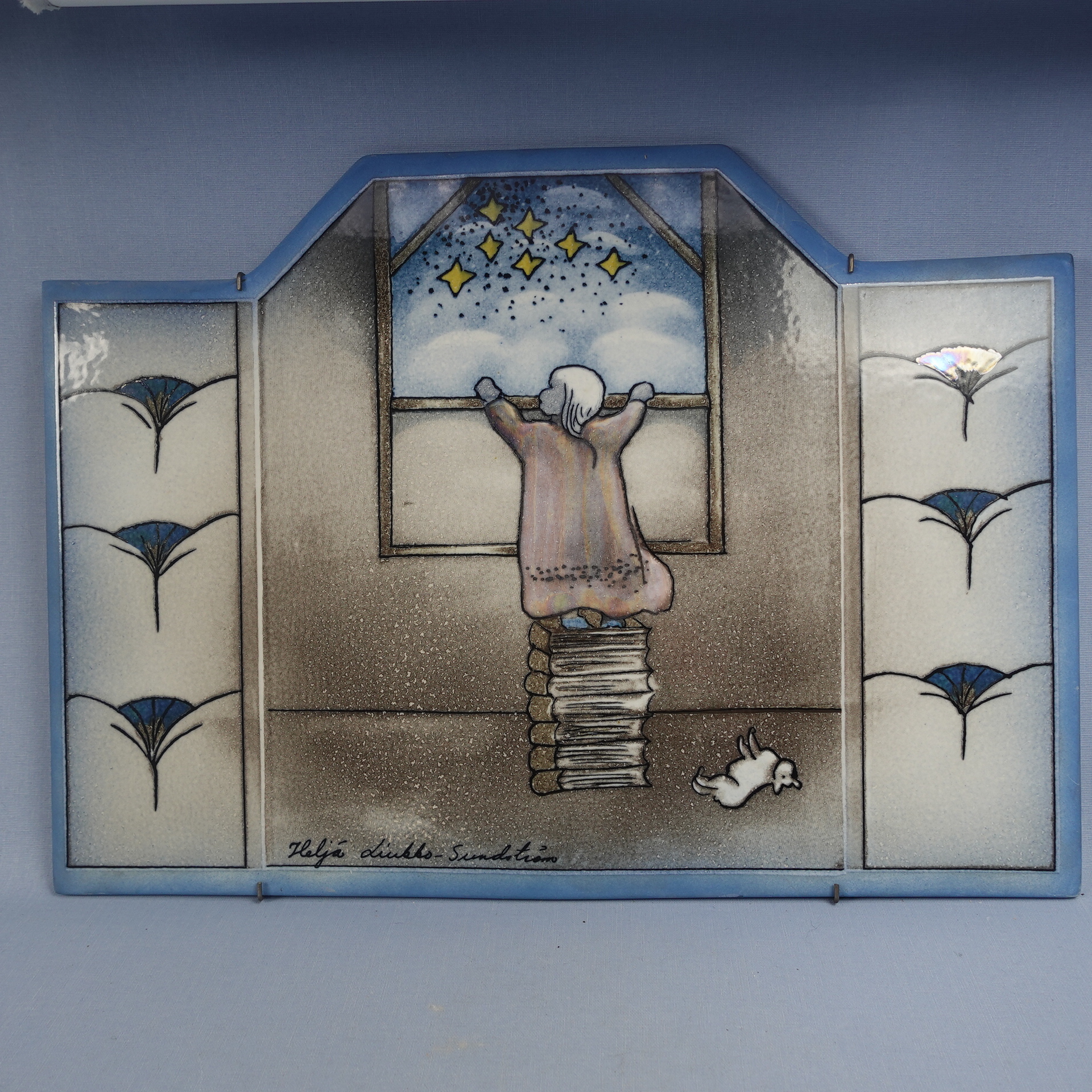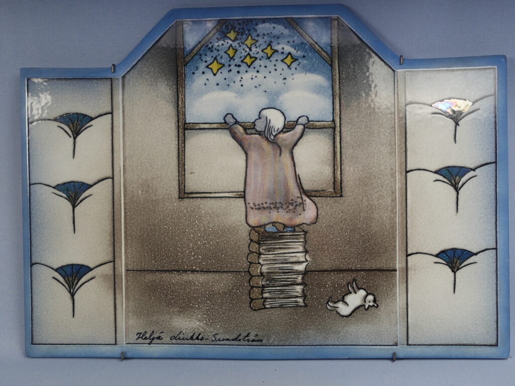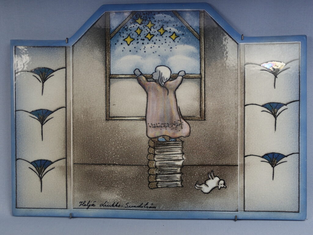 A rare Lookin Out (=Kurkistus) wall plate designed by Heljä Liukko-Sundström for Arabia. The plate was designed in 1993. The plate is 31 cm high and 43 cm wide. The plate decoration shows a little girl climbing on top of a stack of books to see the starry night sky through the window. The plate for sale is intact and otherwise in good condition.