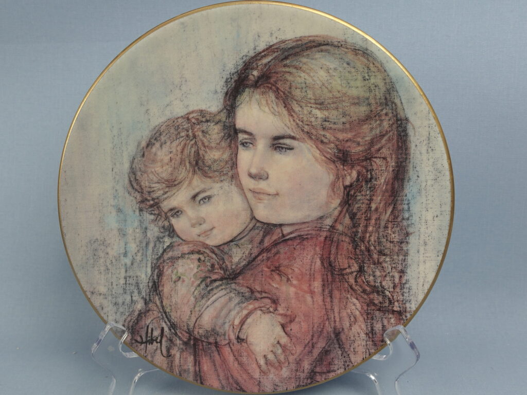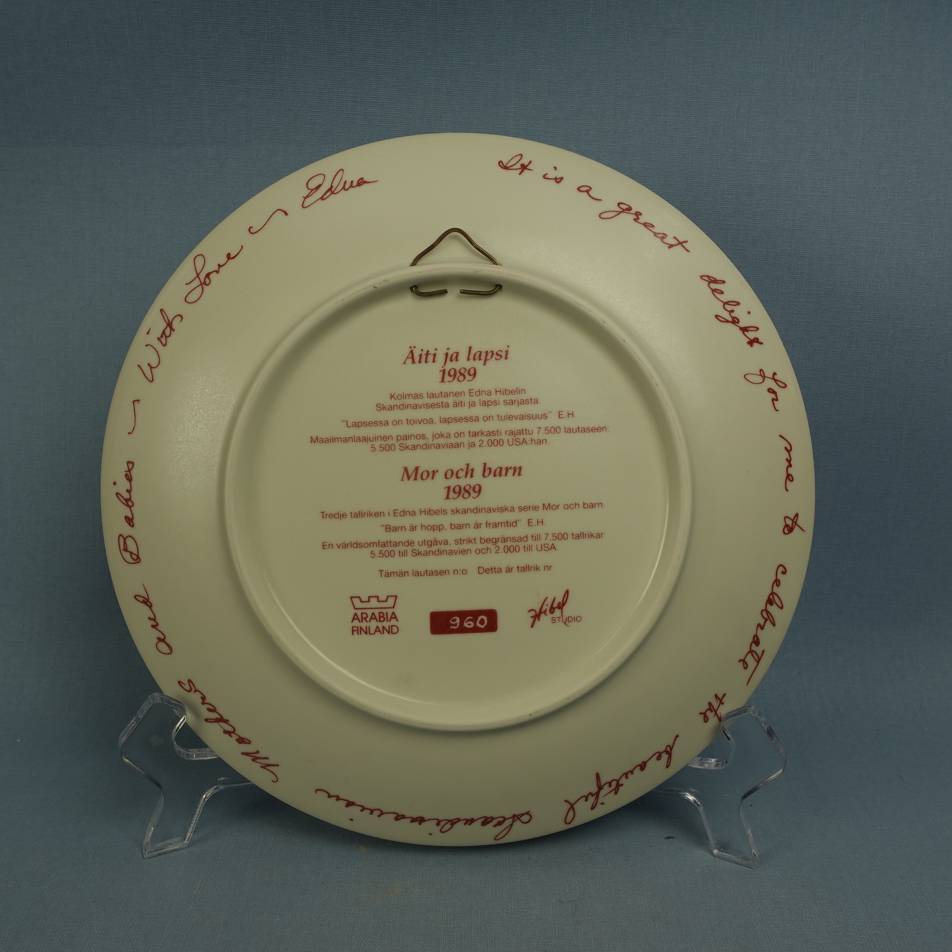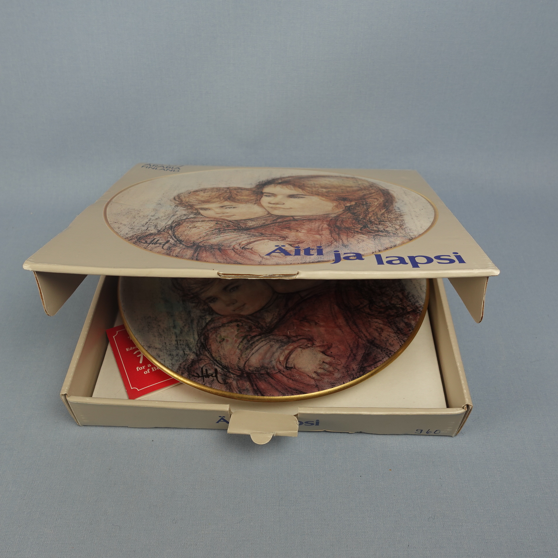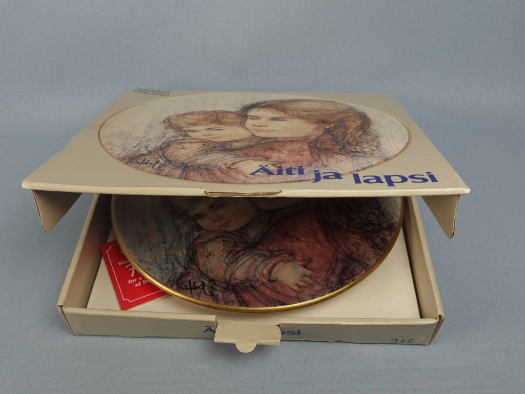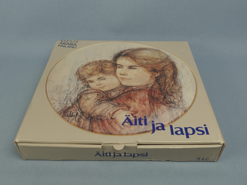Mother and Child wall plate designed by Edna Hibel for Arabia in 1989. The plate is the third in the series from Hibel’s Scandinavian plate series. 2000 plates have been produced and they are all numbered. The diameter of the plate is 23 cm. The wall plate for sale is intact and otherwise in good condition. The original sales packaging and wall mount are also included in the price.