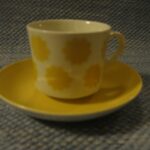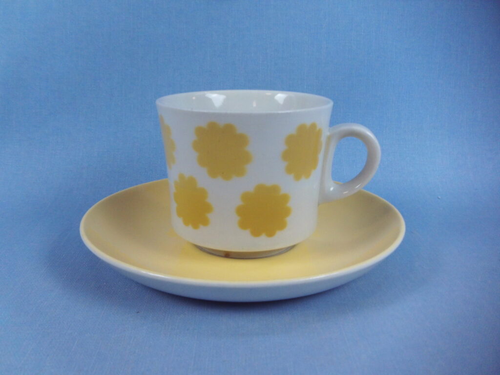 Yellow “Pipari” coffee cup made by Arabia. The blown-decorated cup was produced in the late 1960s and early 1970s and was produced in several different colors. The BR model cup is 6.3 cm high, 7.2 cm in diameter and has a capacity of 15 cl. The saucer has a diameter of 13.3 cm. The cups for sale are intact and otherwise in good condition.