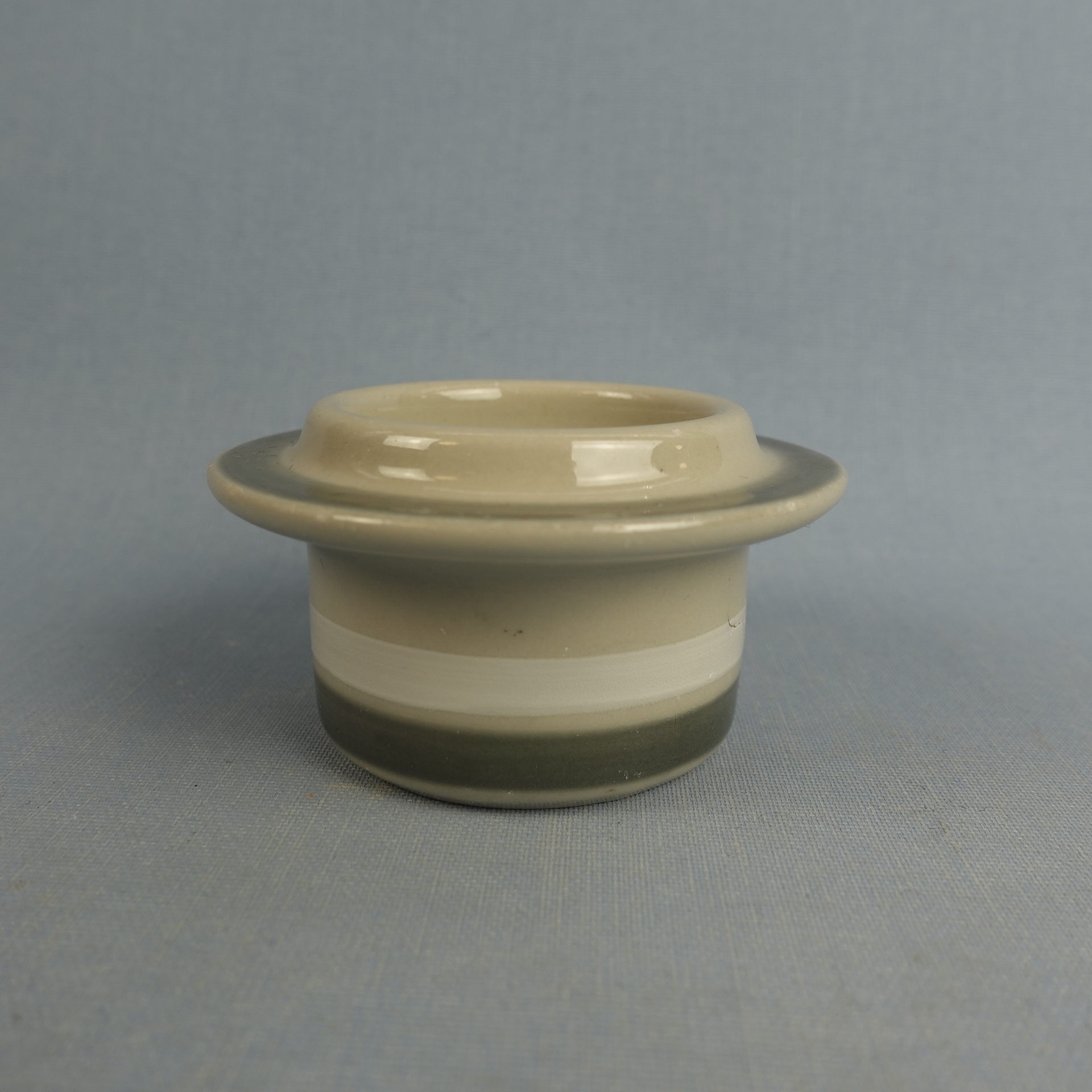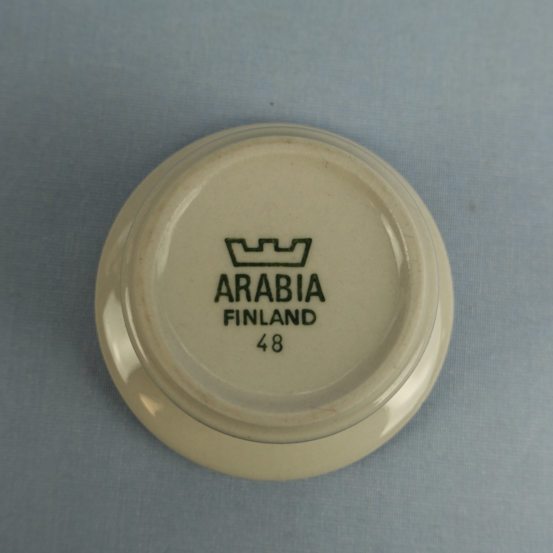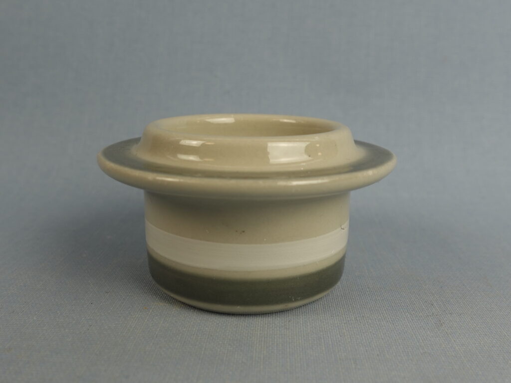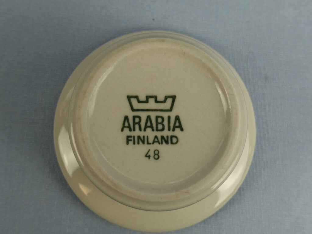 An egg cup from the Salla series designed by Raija Uosikkinen for Arabia. The decoration was produced on the S-model dishes designed by Ulla Procopé in 1979-83. The diameter of the egg cup is 7.5 cm and the height is 4 cm. The egg cups for sale are intact and otherwise in good condition.