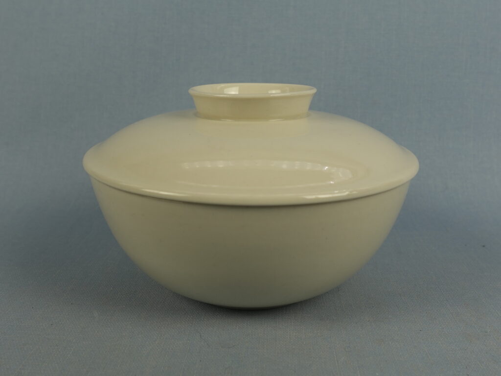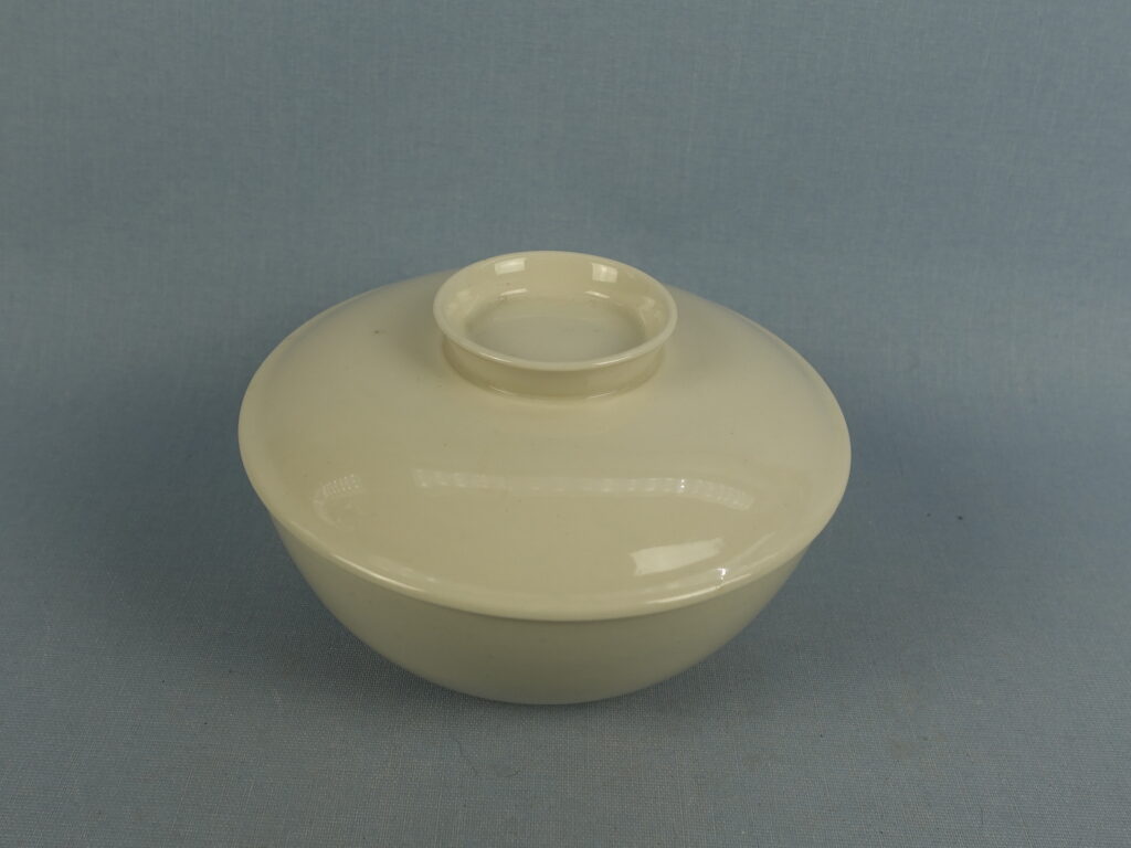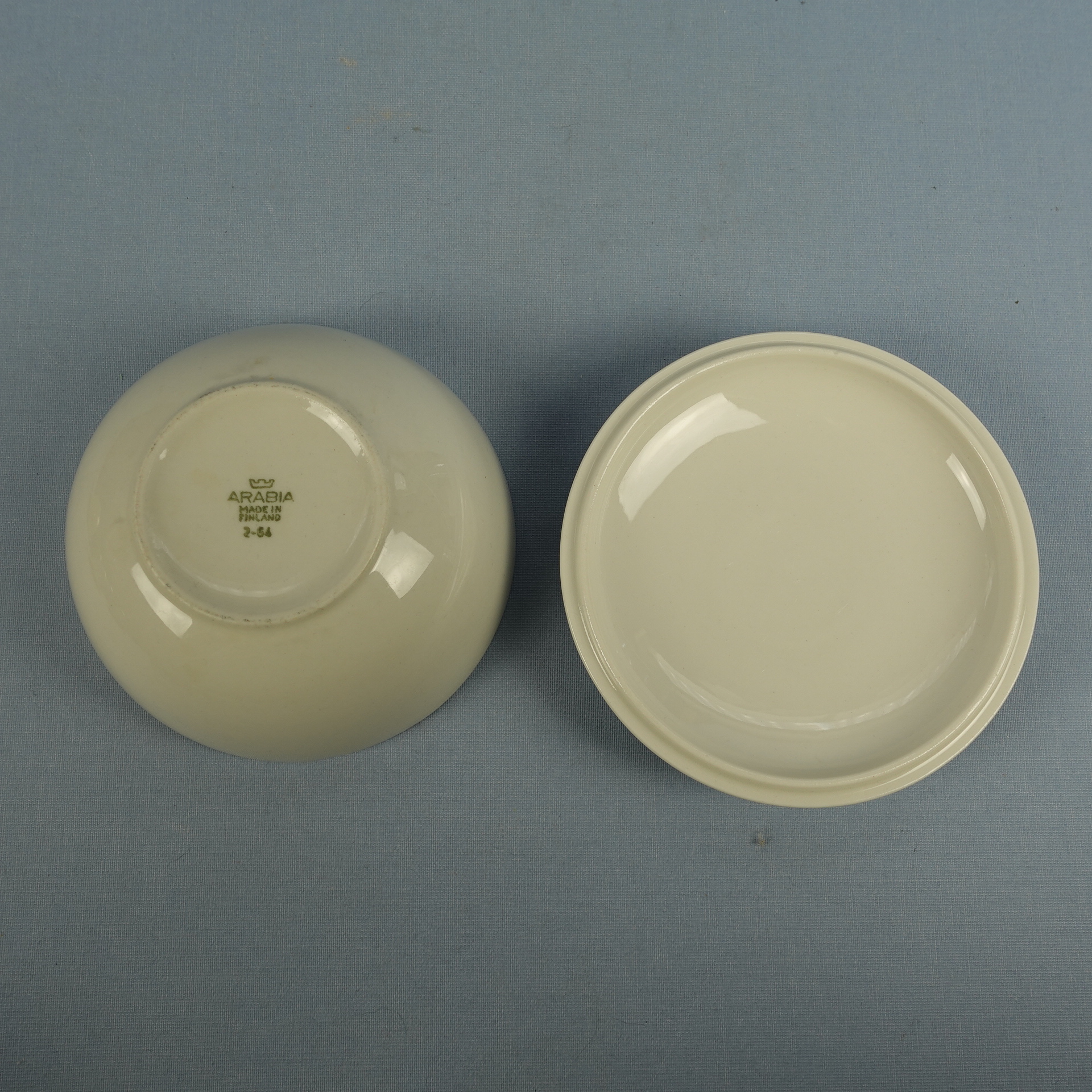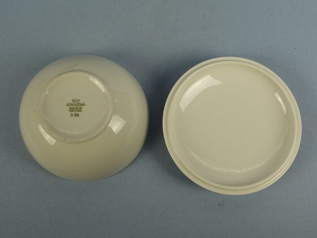 A soup cup with a lid from the white X-model tableware set designed by Kaarina Aho for Arabia. The tableware set was produced from 1955-67. The height of the soup cup without the lid is 5 cm, the diameter is 12.2 cm and the volume is 37 cl. The cup and lid for sale are intact and otherwise in good condition.