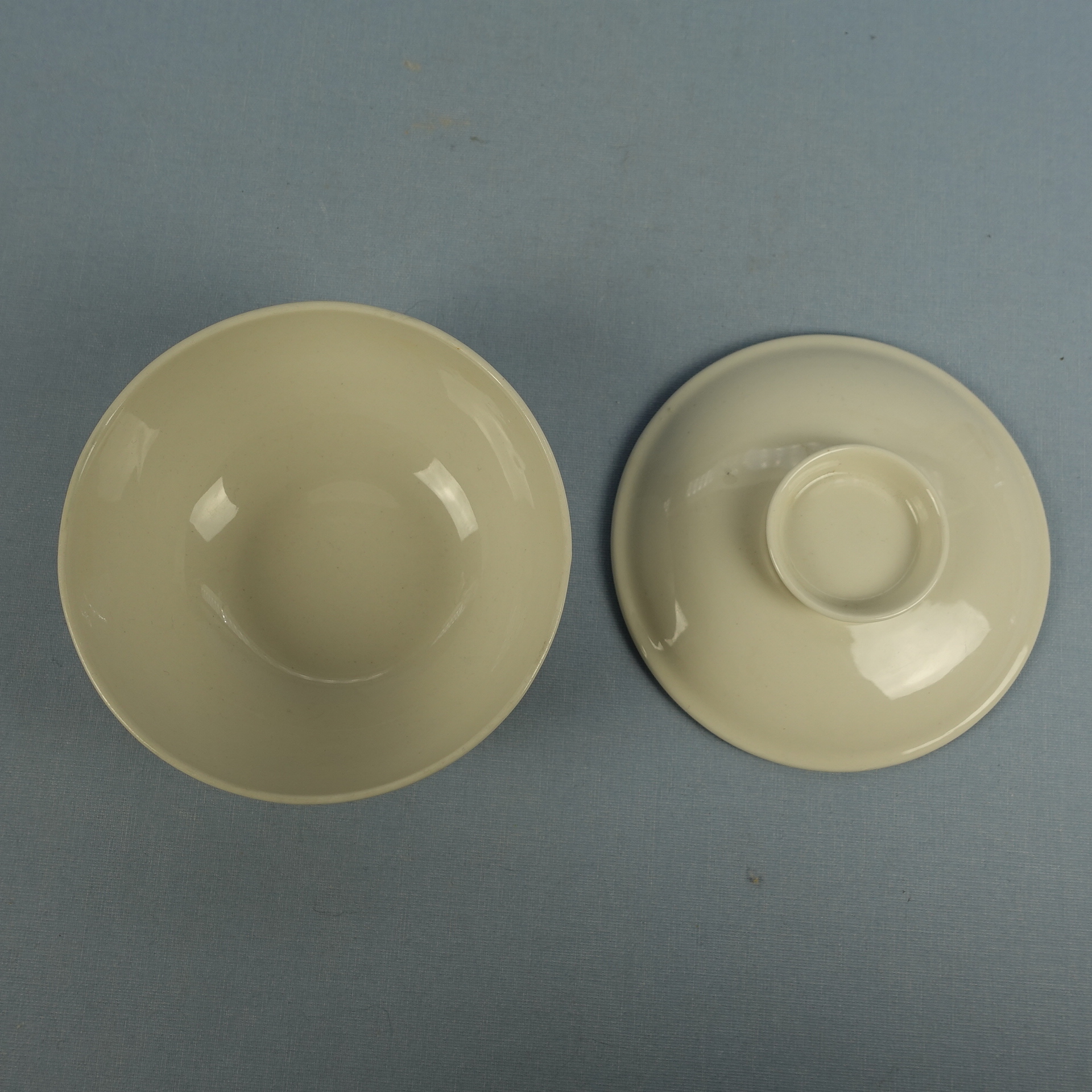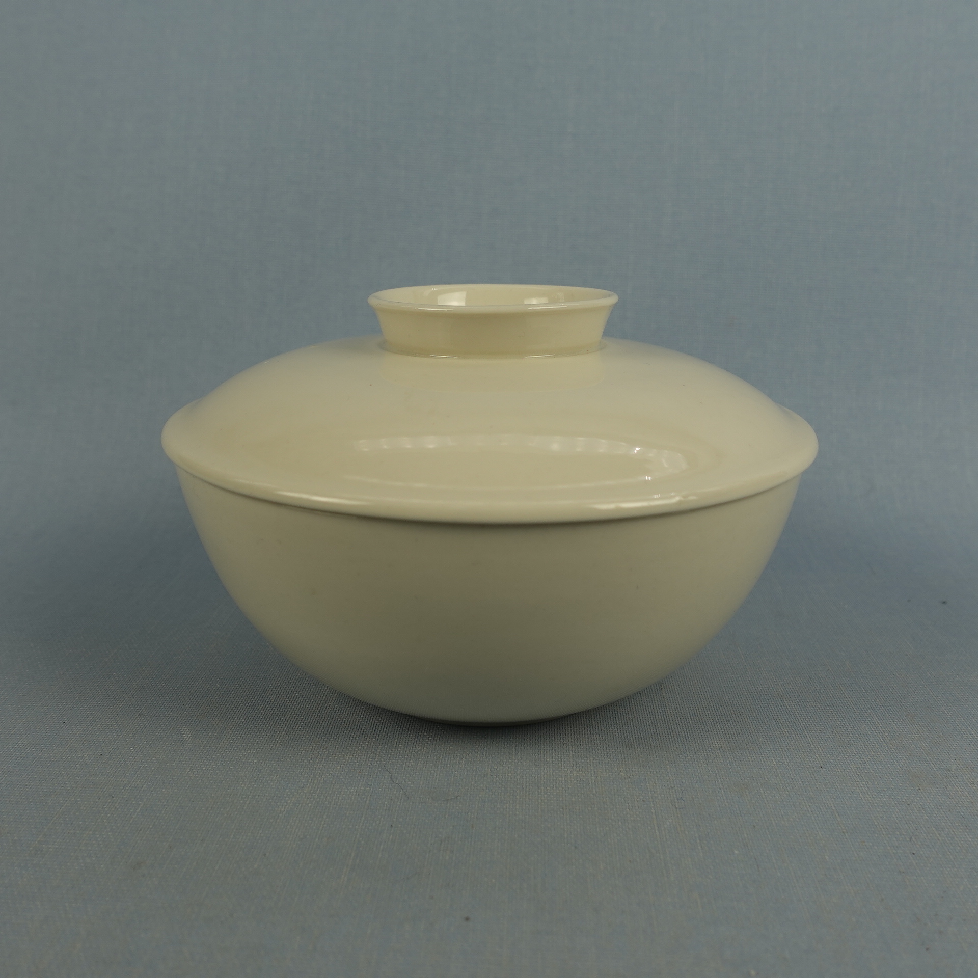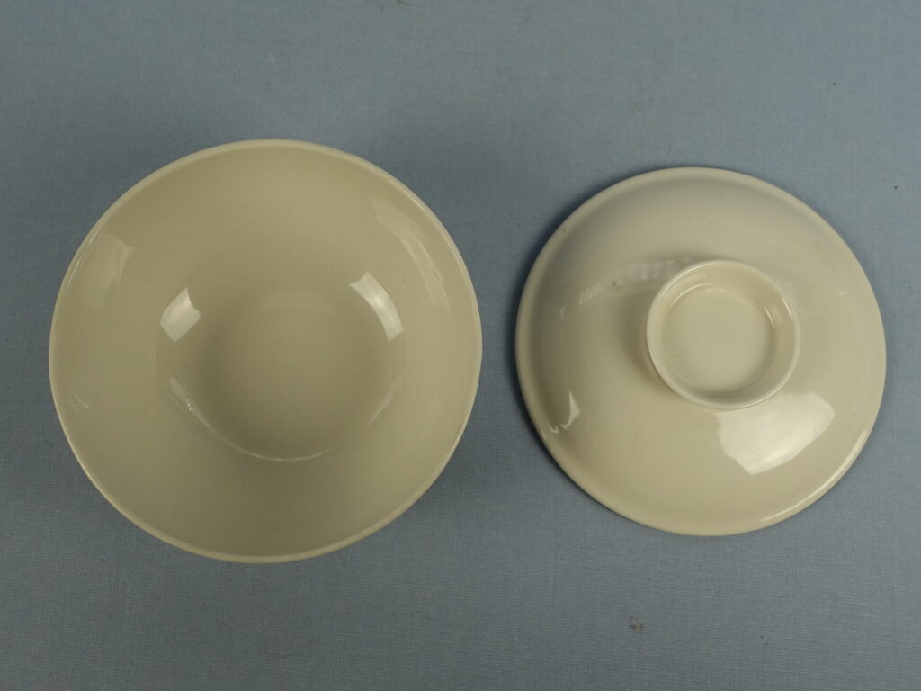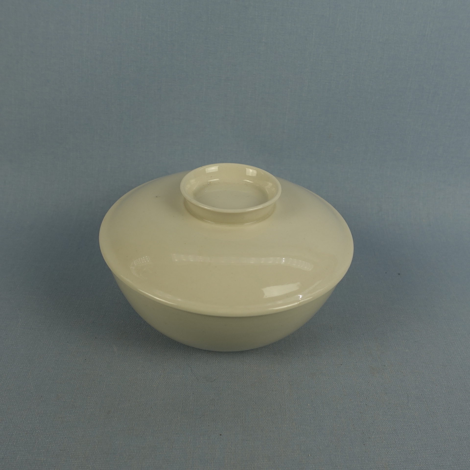 A soup cup with a lid from the white X-model tableware set designed by Kaarina Aho for Arabia. The tableware set was produced from 1955-67. The height of the soup cup without the lid is 5 cm, the diameter is 12.2 cm and the volume is 37 cl. The cup and lid for sale are intact and otherwise in good condition.