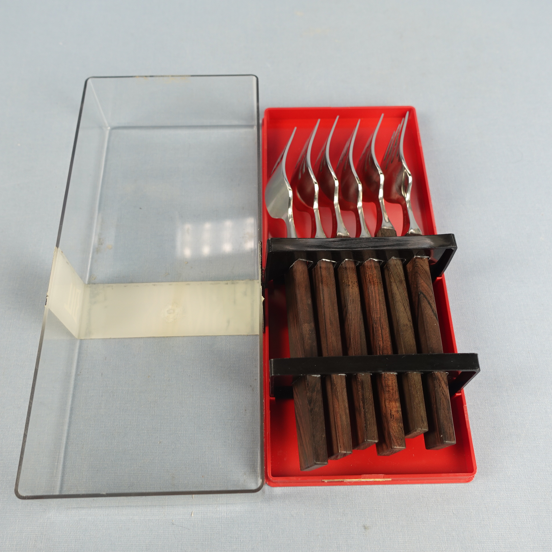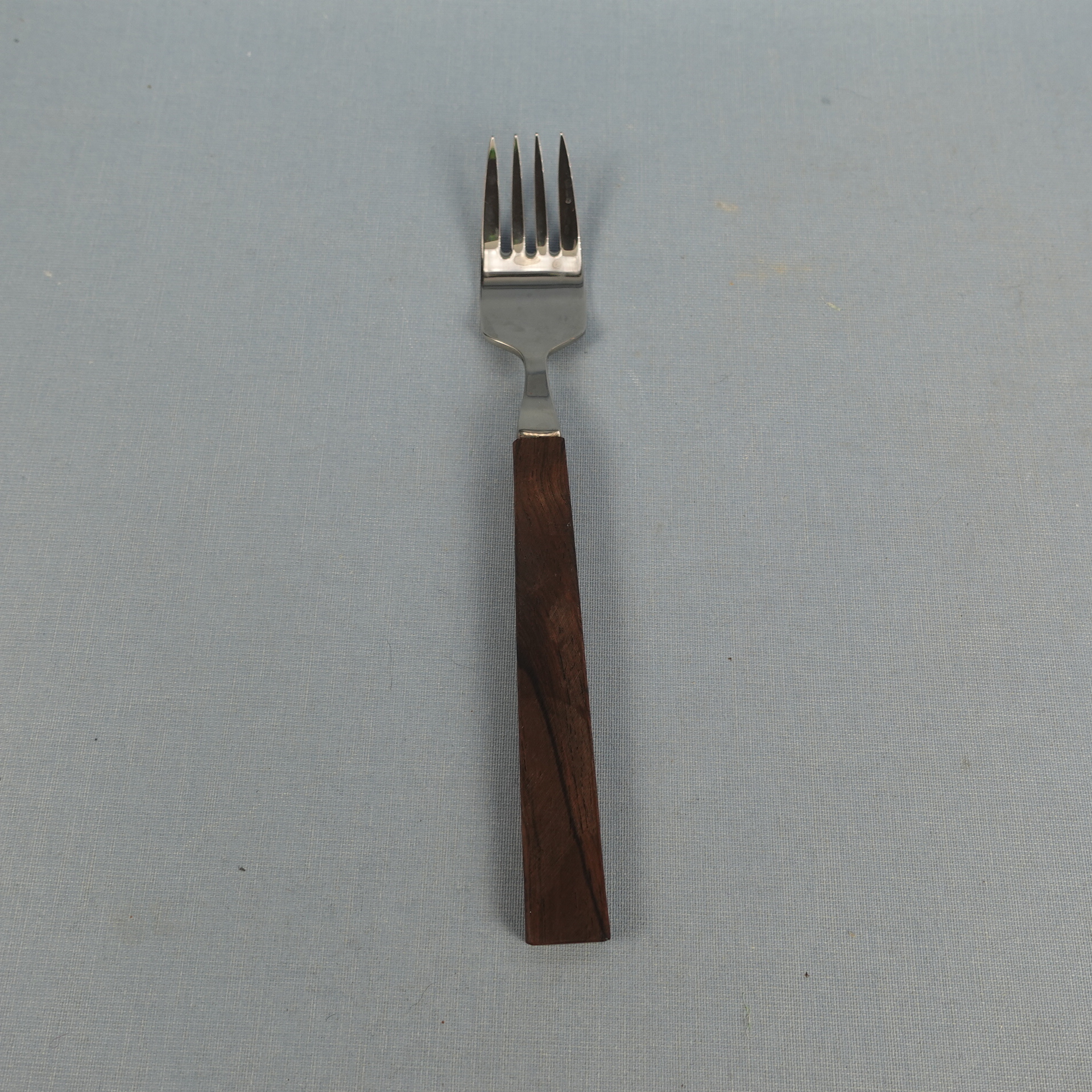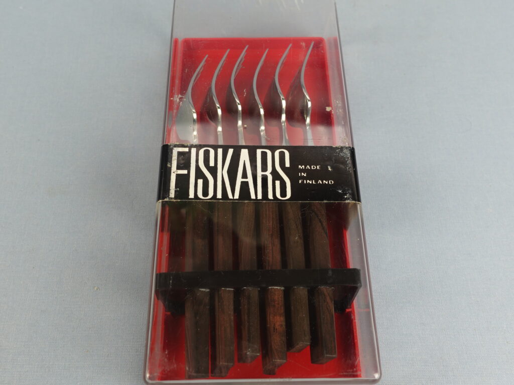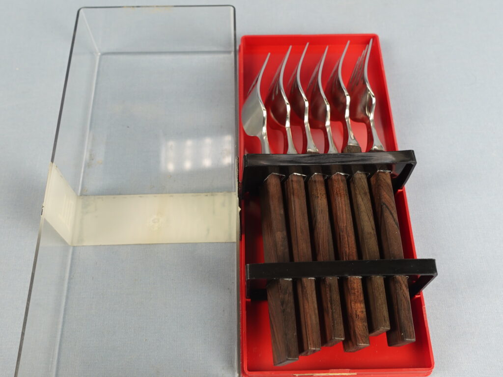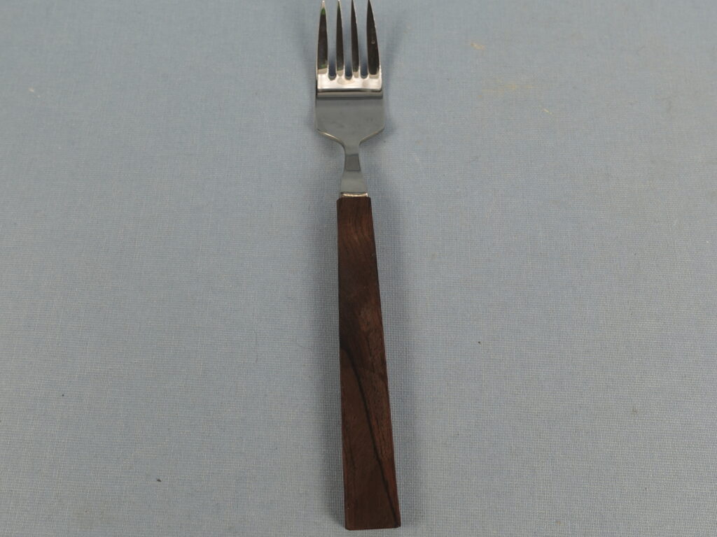 Triennale series forks designed by Bertel Gardberg for Fiskars. The series was designed in 1957 and in the same year it was awarded a gold medal at the Milan Triennale. The fork handle is made of palisander (rosewood) and the rest is stainless steel. The fork length is 17.8 cm. The forks for sale are unused and in their original packaging.
