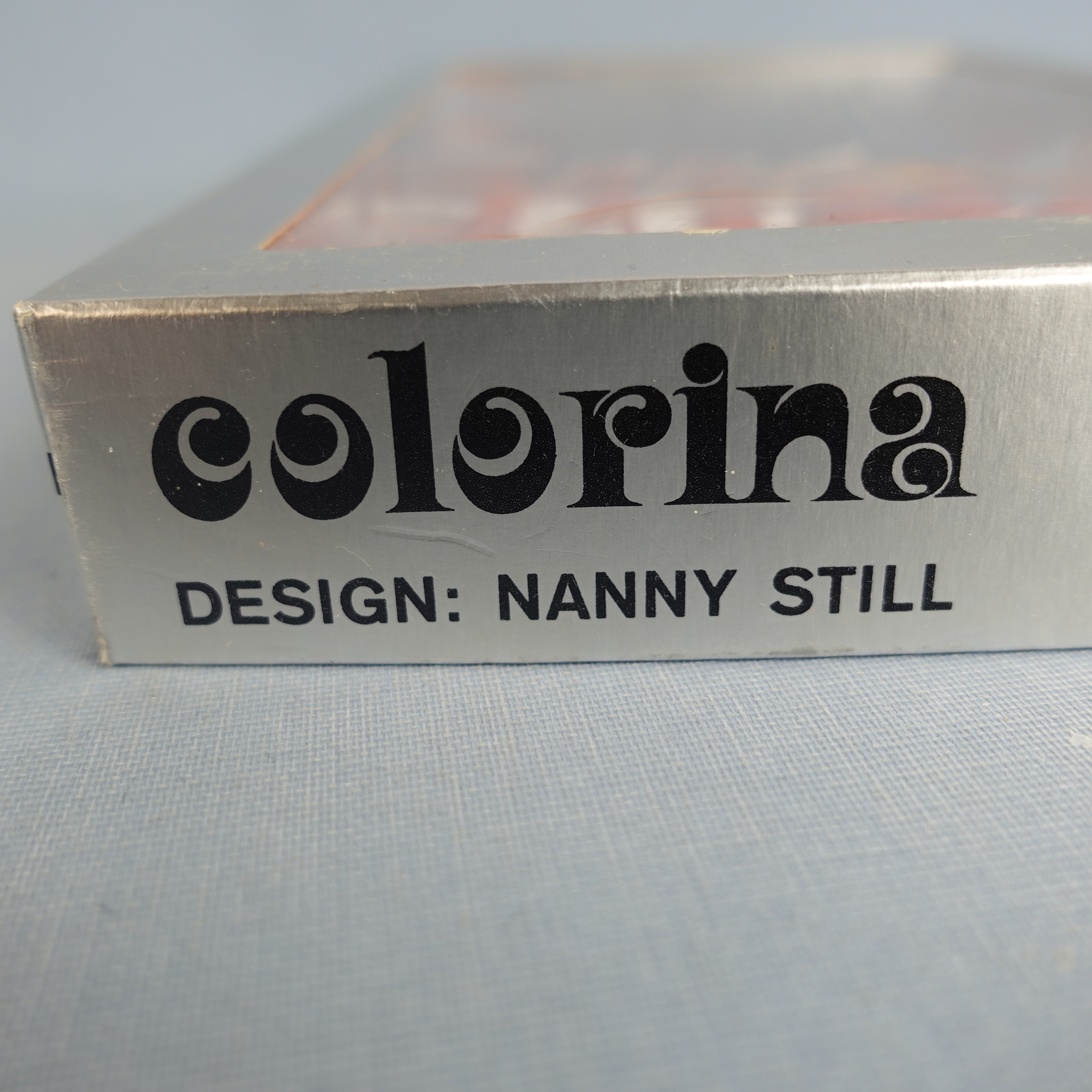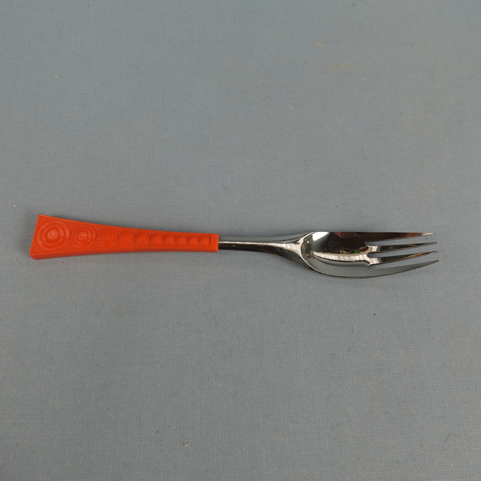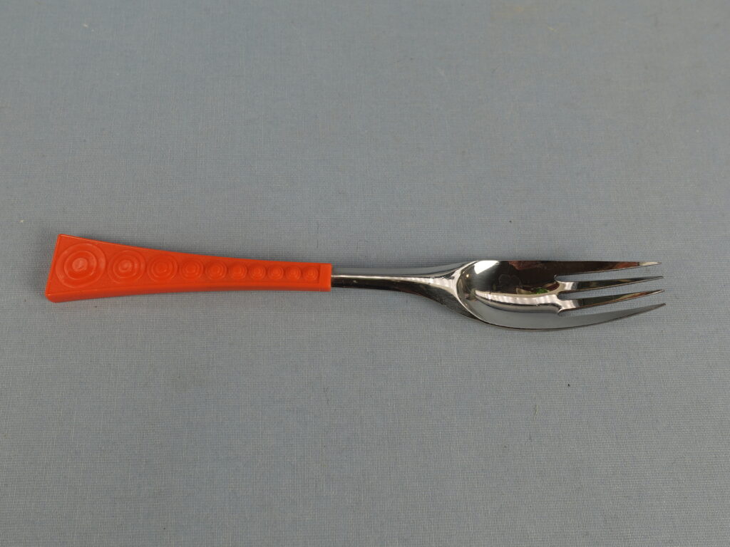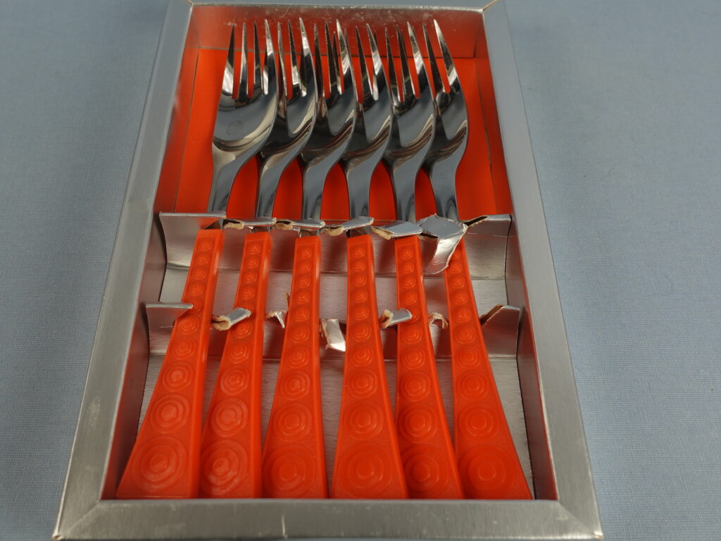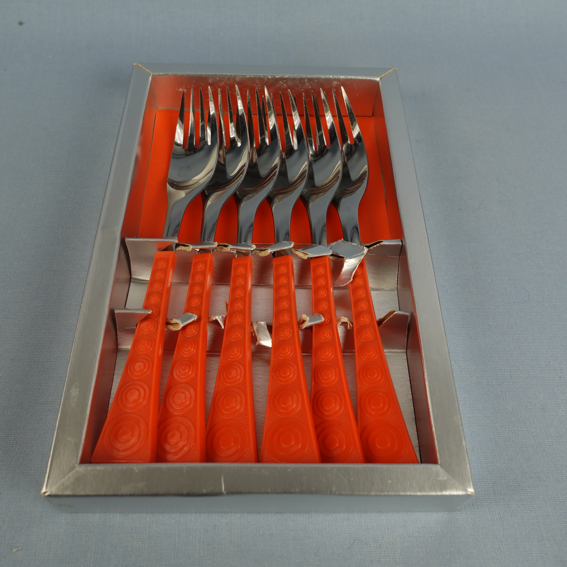 Orange dinner forks from the Colorina series designed by Nanny Still for Hackman. The series was produced in 1970-73 and was also produced in red, green and blue. The cutlery handles are made of decorative plastic and the rest is made of stainless steel. The length of the dinner fork is 19.7 cm. The forks for sale are in their original packaging and are almost unused.