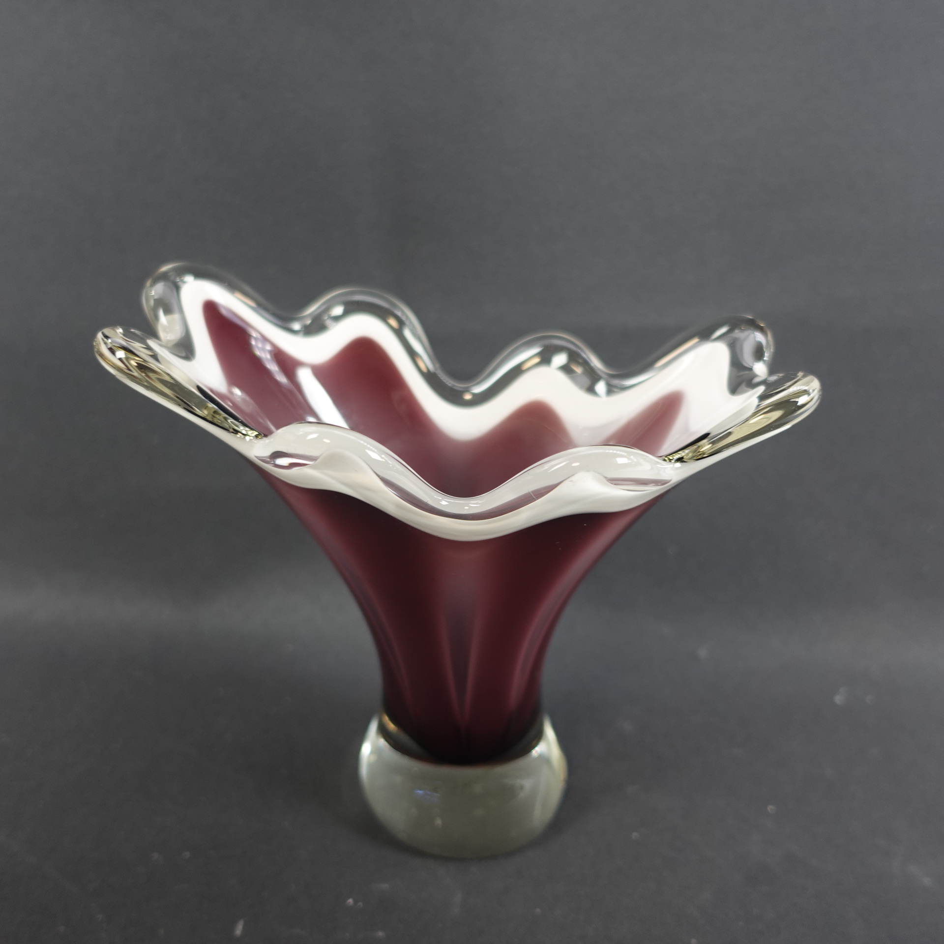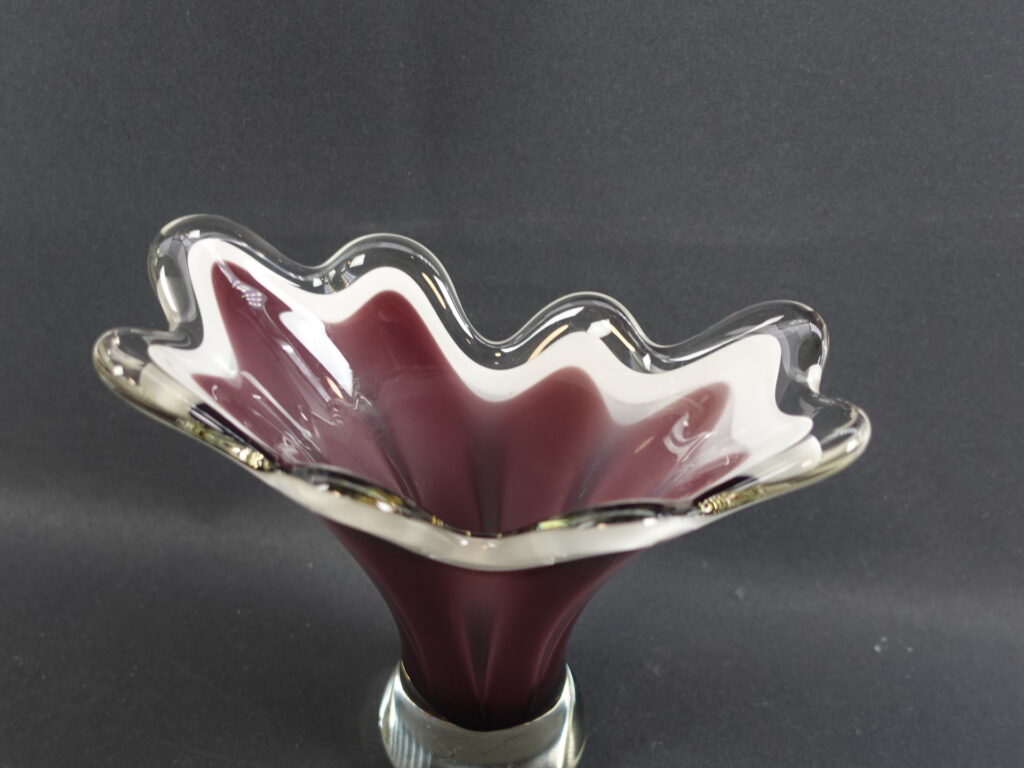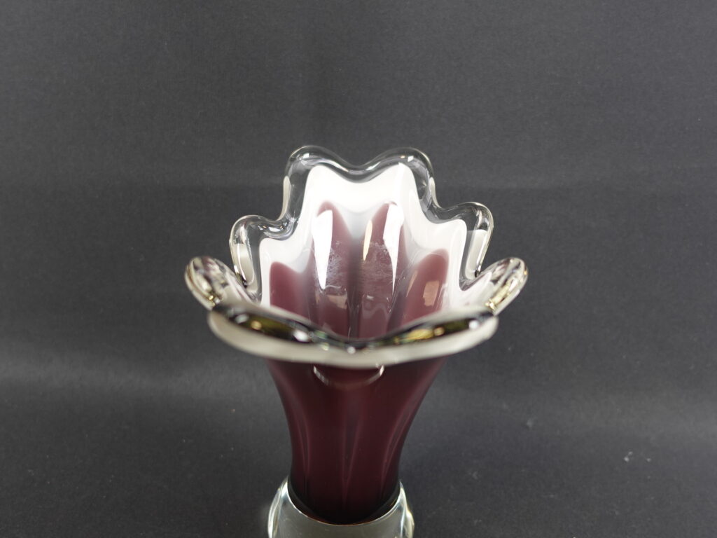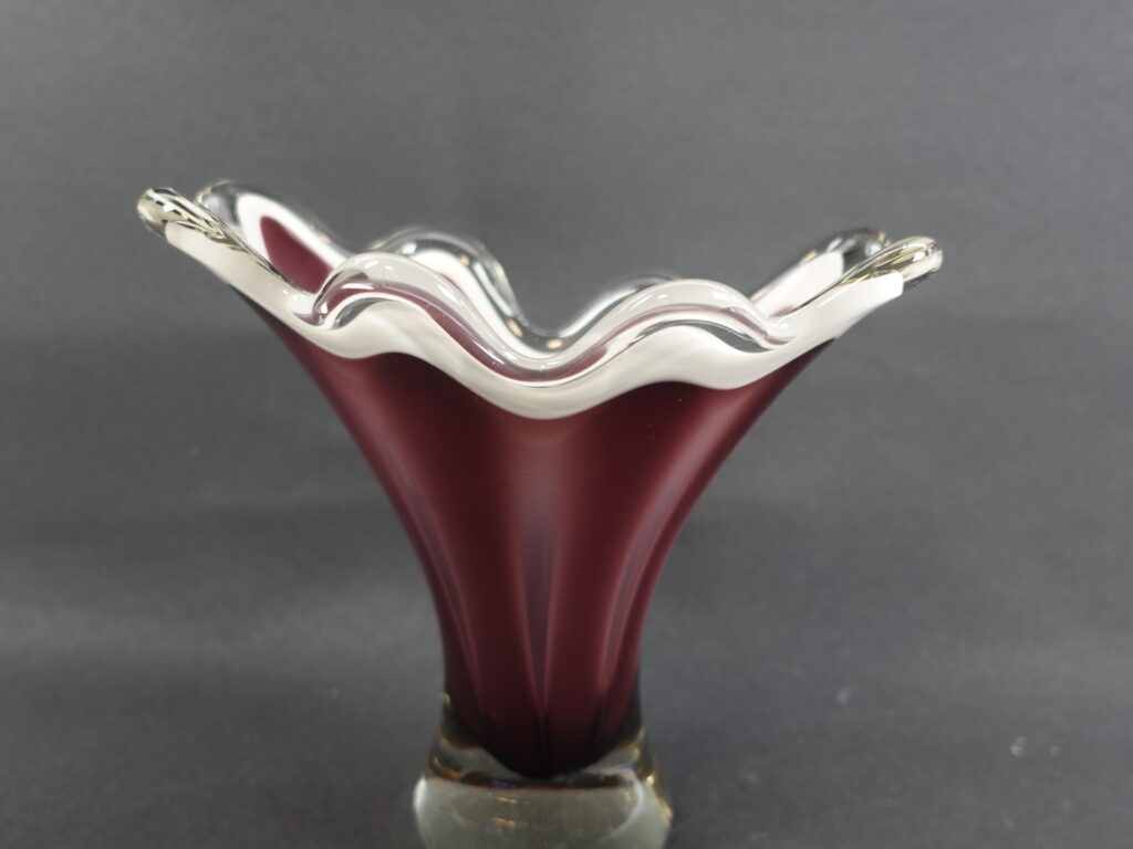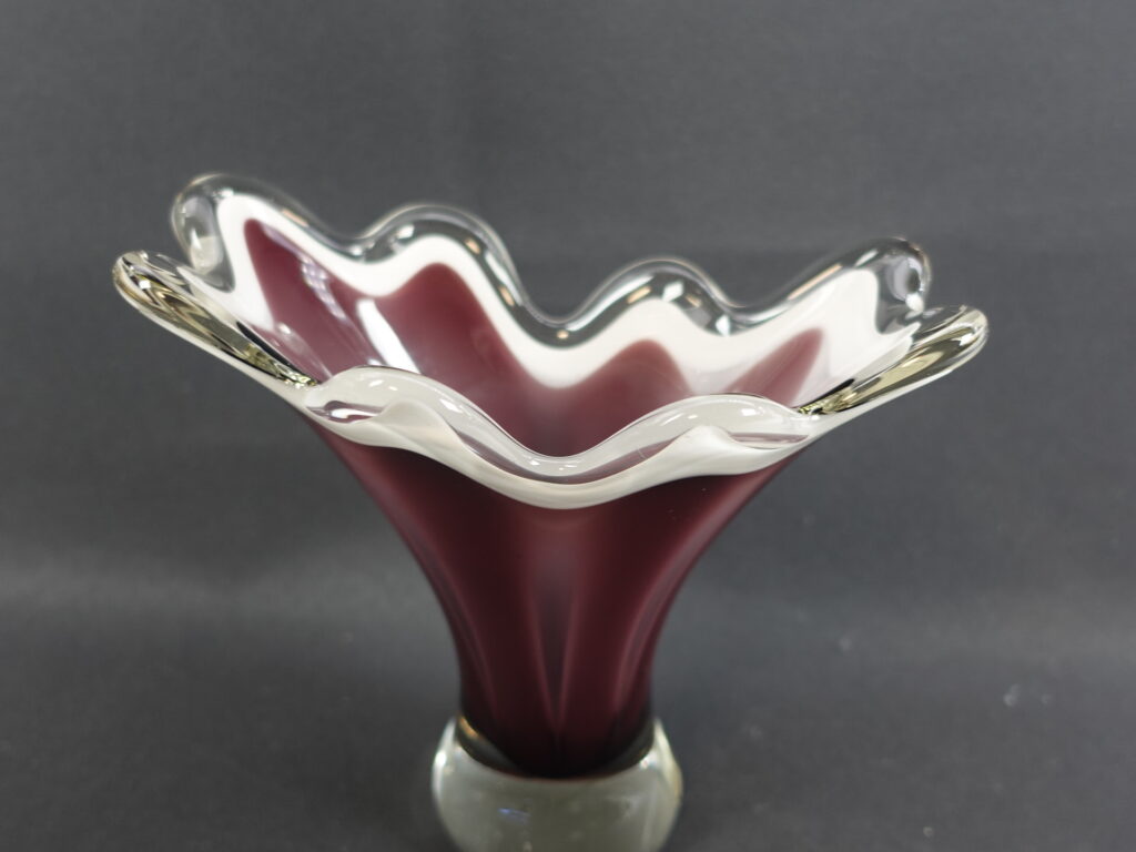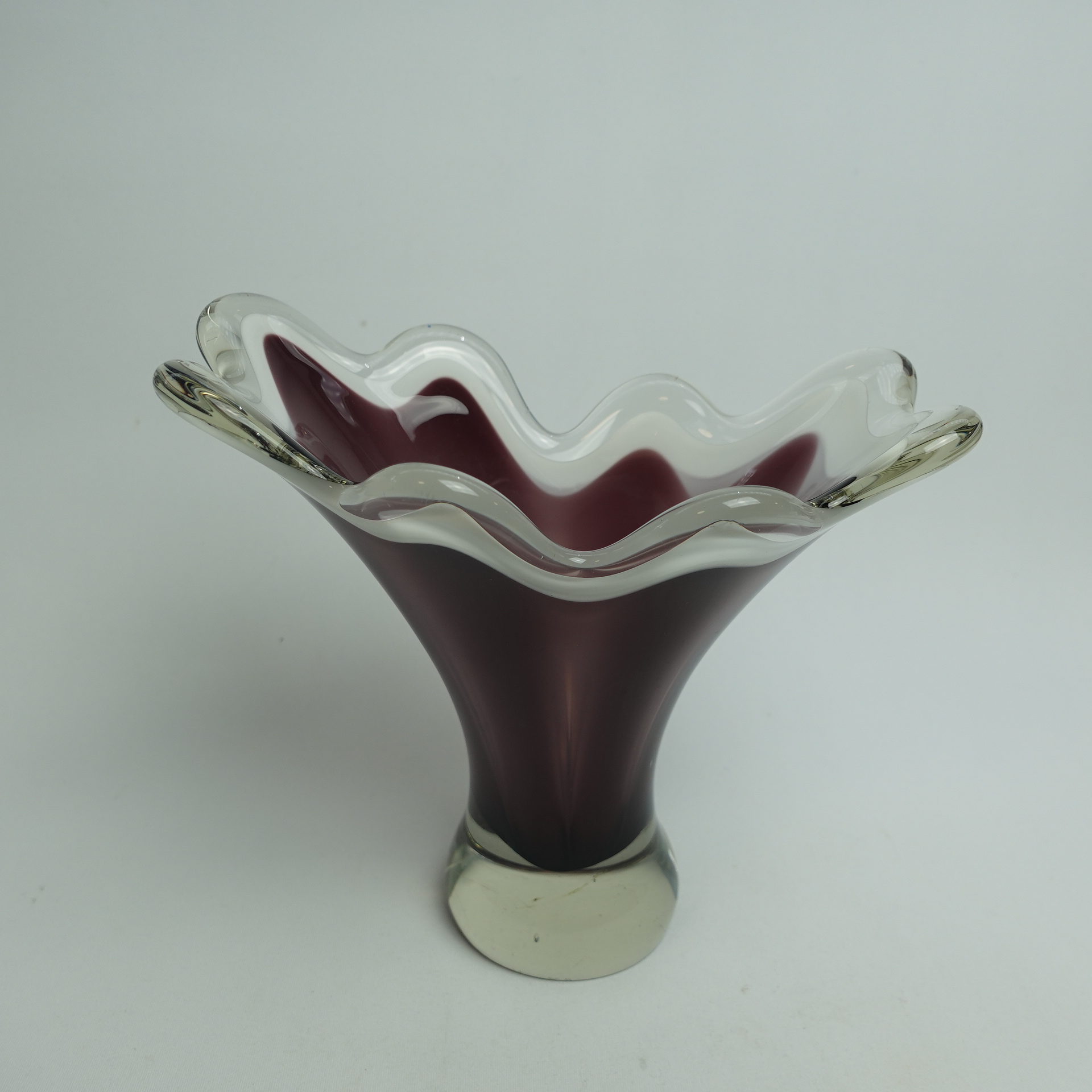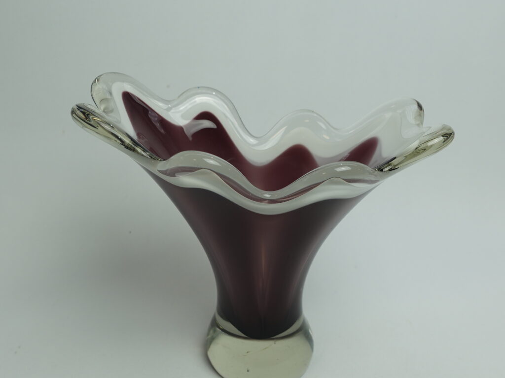 A purple/clear colored art glass bowl designed by Sulo Grönberg for Kumela Glass. The bowl was produced in the 1960s. The bowl is 17 cm high and 19 x 10 cm in diameter. The bowl is signed: Oy Kumela S.Grönberg. The bowl for sale is intact and in good condition, with only scratches on the bottom from being moved.