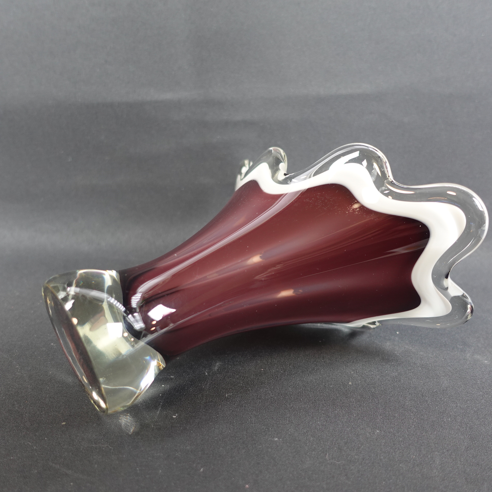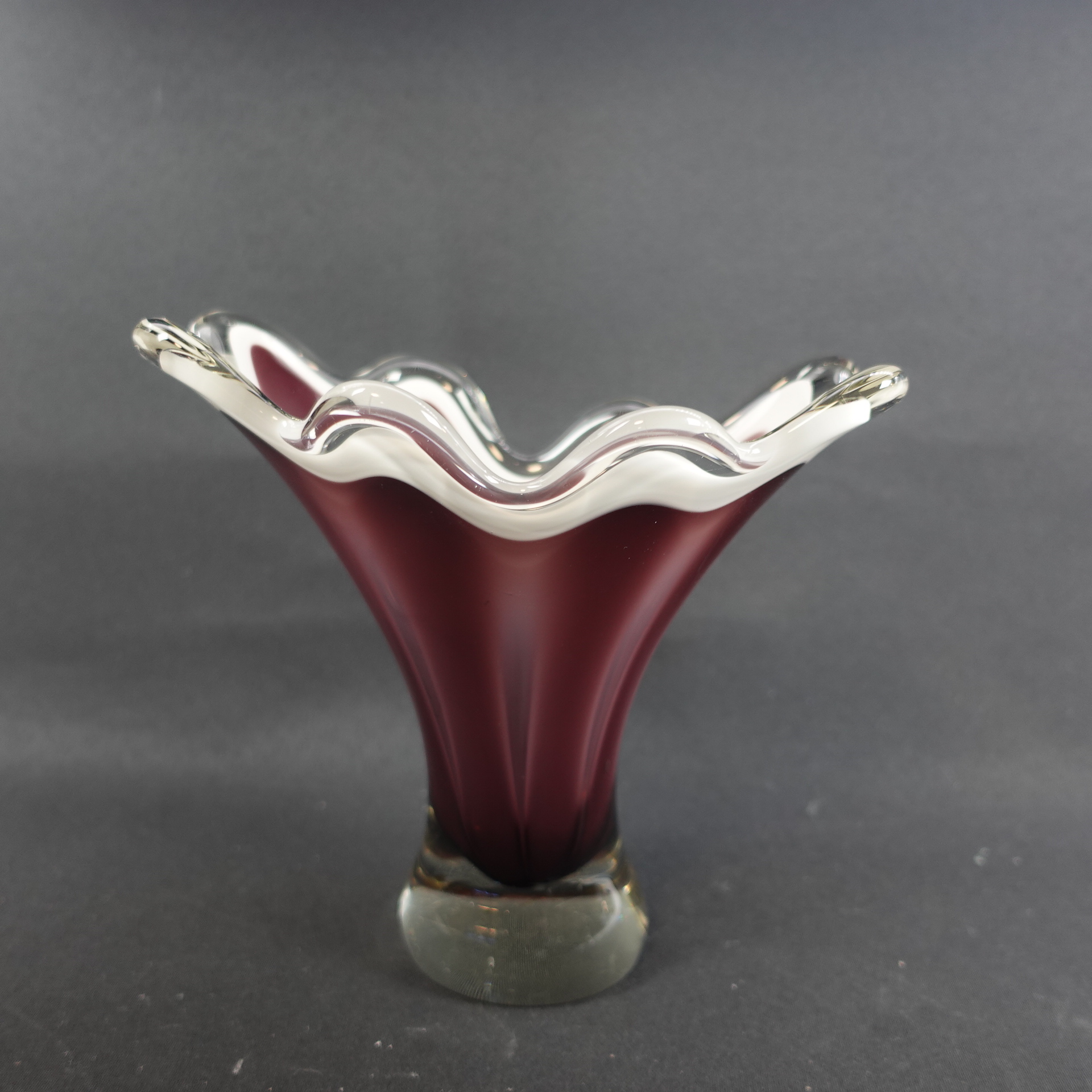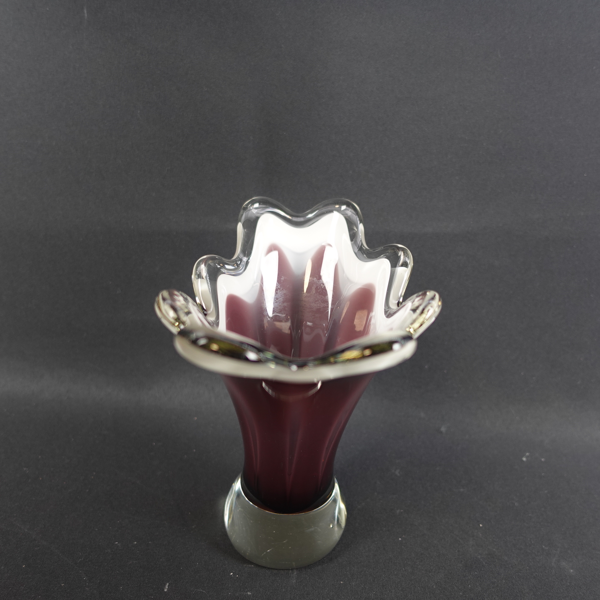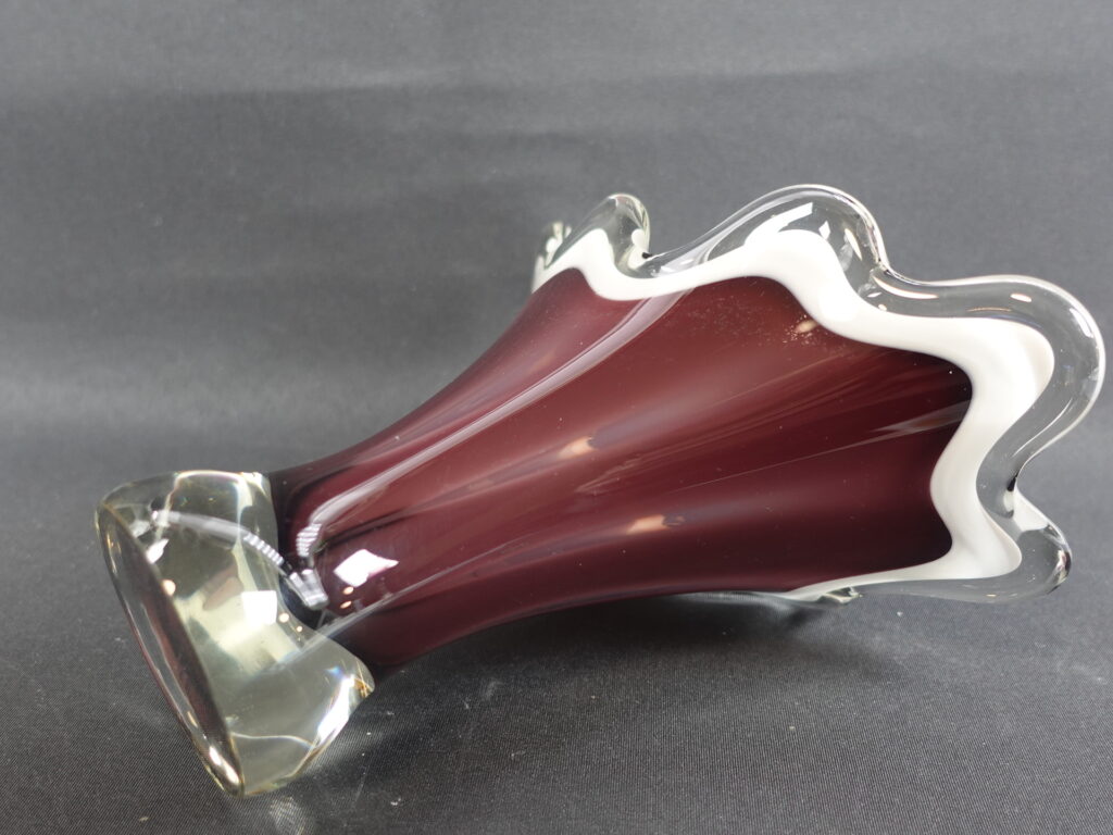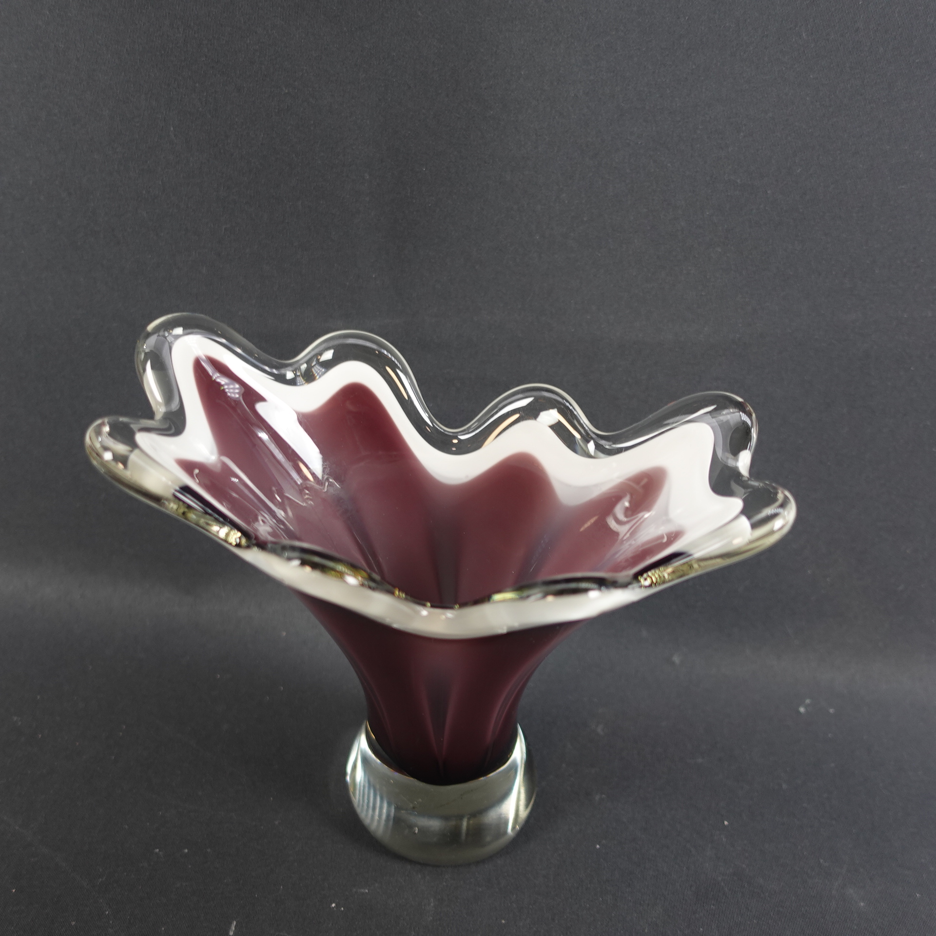 A purple/clear colored art glass bowl designed by Sulo Grönberg for Kumela Glass. The bowl was produced in the 1960s. The bowl is 17 cm high and 19 x 10 cm in diameter. The bowl is signed: Oy Kumela S.Grönberg. The bowl for sale is intact and in good condition, with only scratches on the bottom from being moved.
