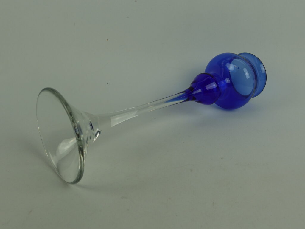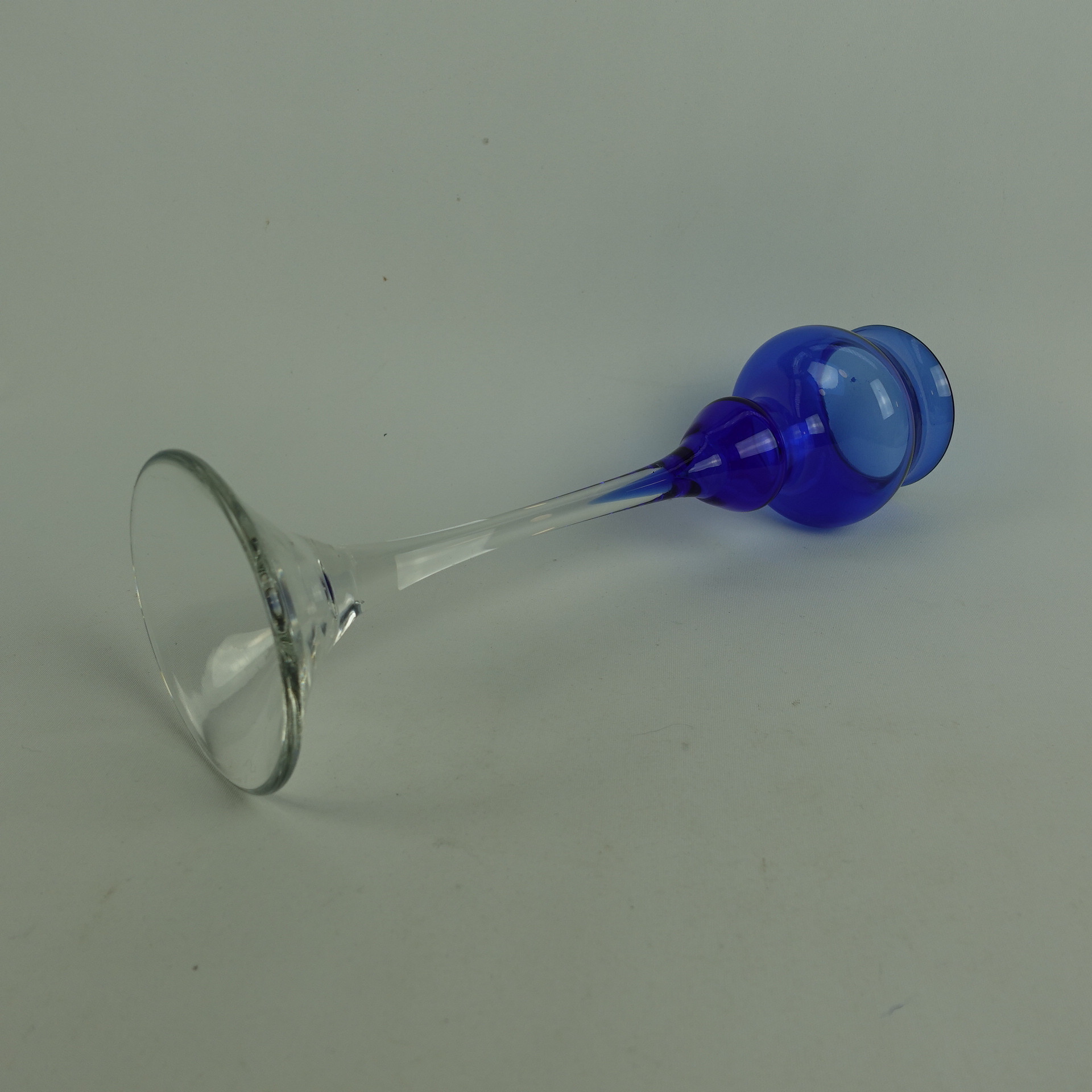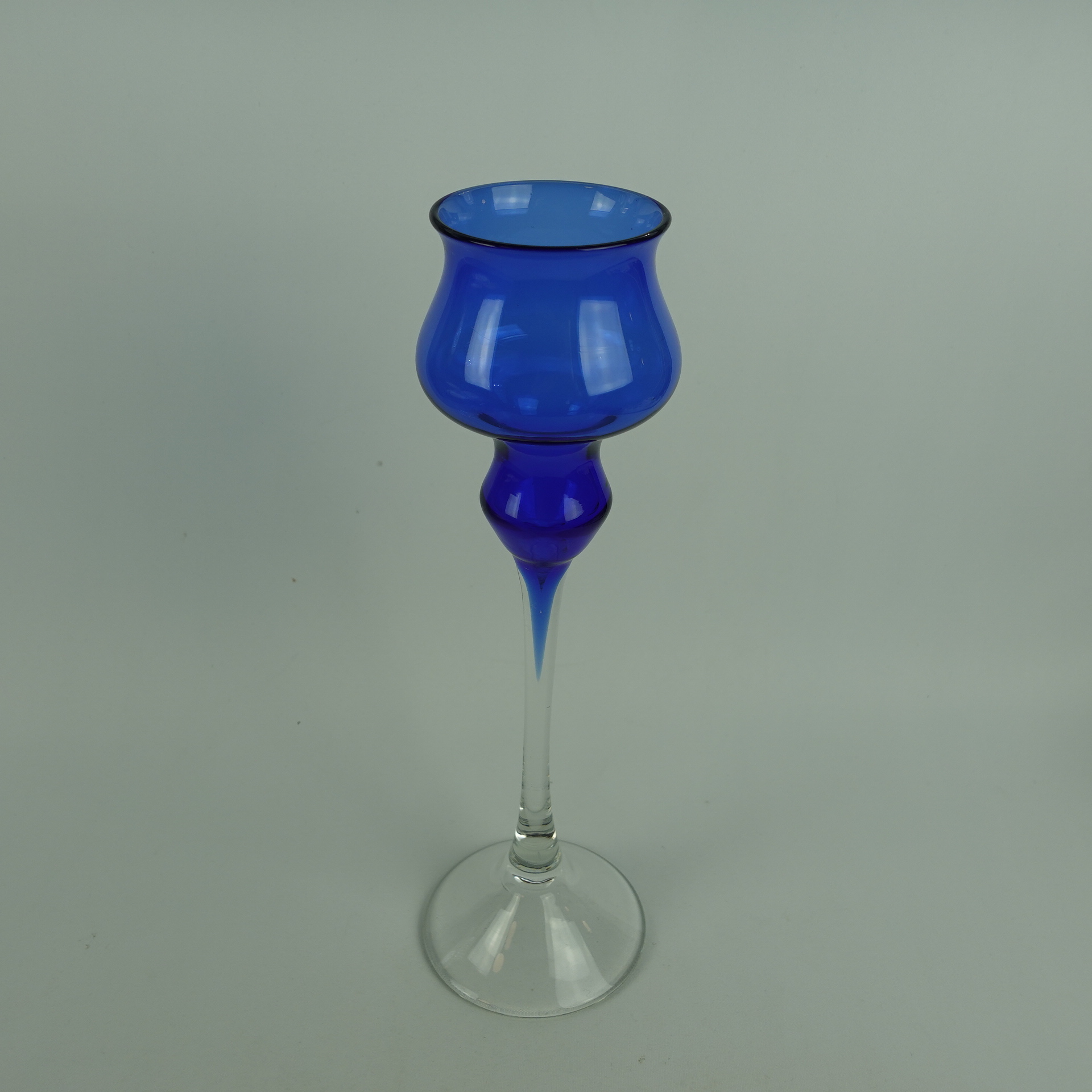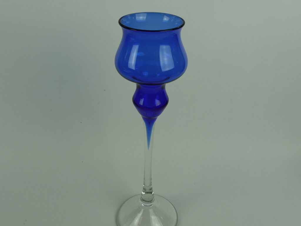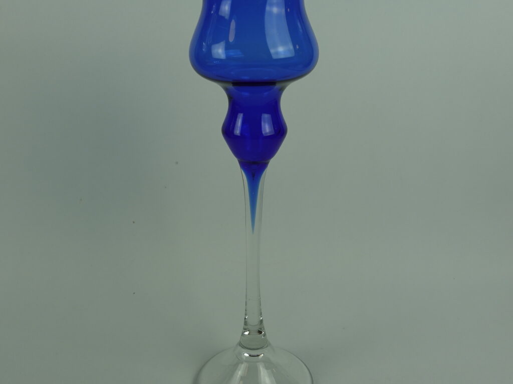 A blue / clear candlestick designed by Marjut Kumela for Kumela Oy. The candlestick was produced in the 1960s/70s. The height of the candlestick is 26.5 cm. The candlesticks for sale are intact and otherwise in good condition.