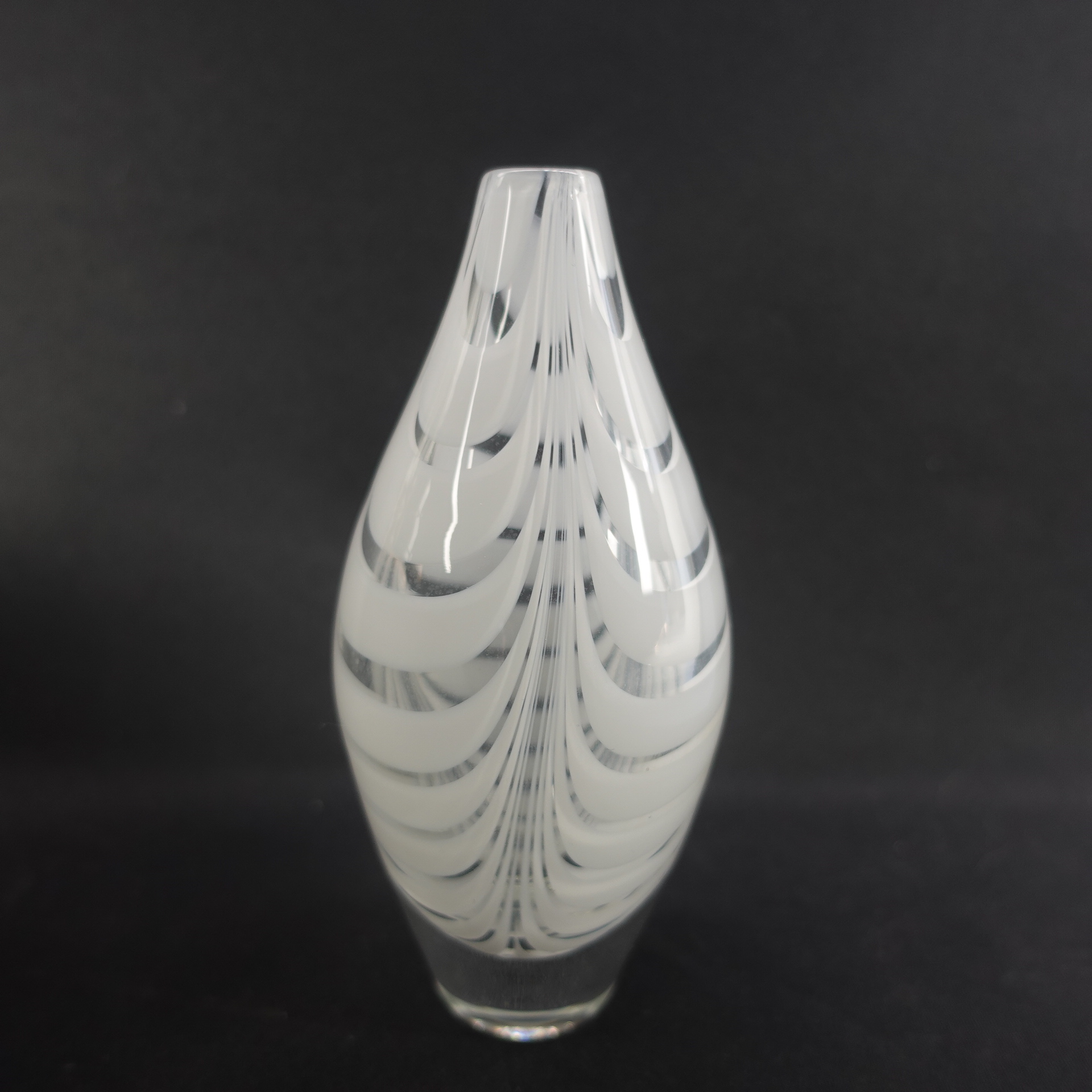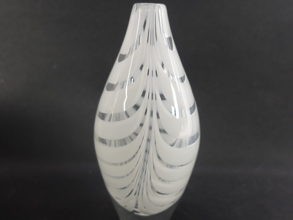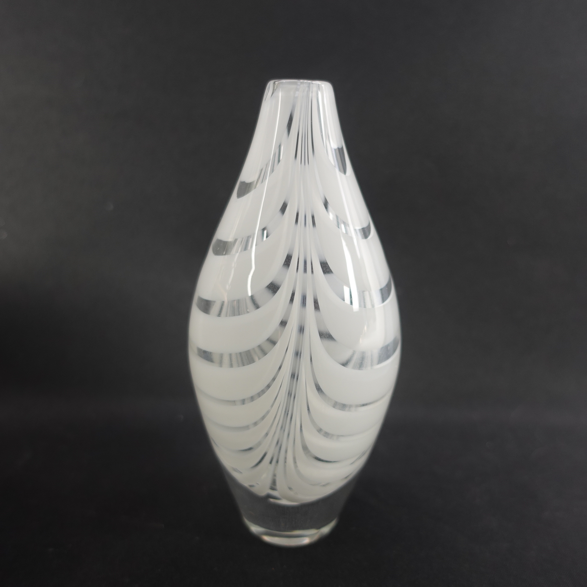 A Filigraani vase designed by Maija Carlson for Kumela glass, with a height of 14.5 cm and a diameter of approx. 7 cm. The vase was produced in 1955-66. The vase is signed: Kumela. The white-striped vase is intact and otherwise in good condition.