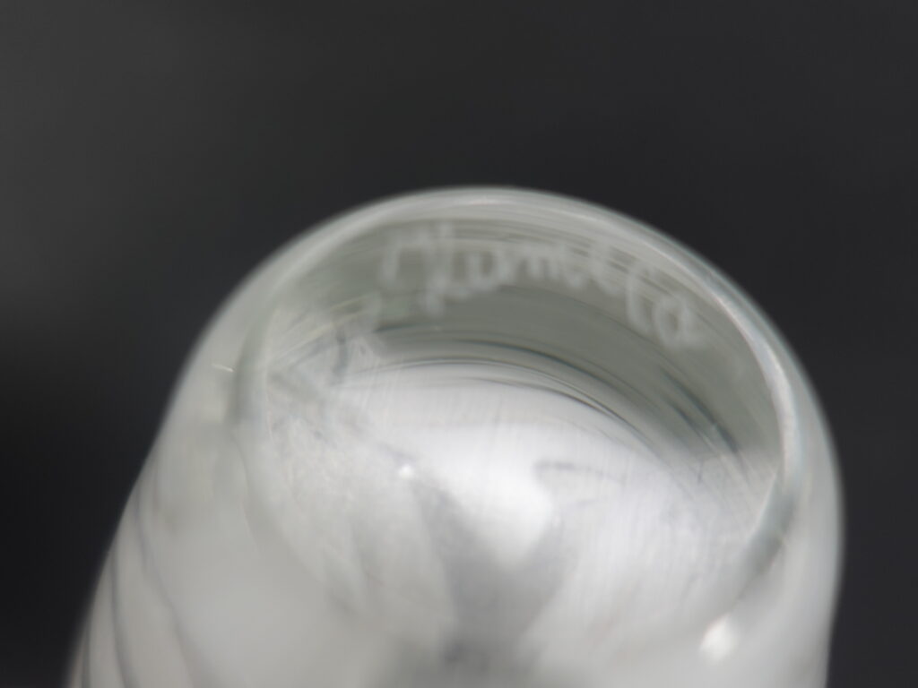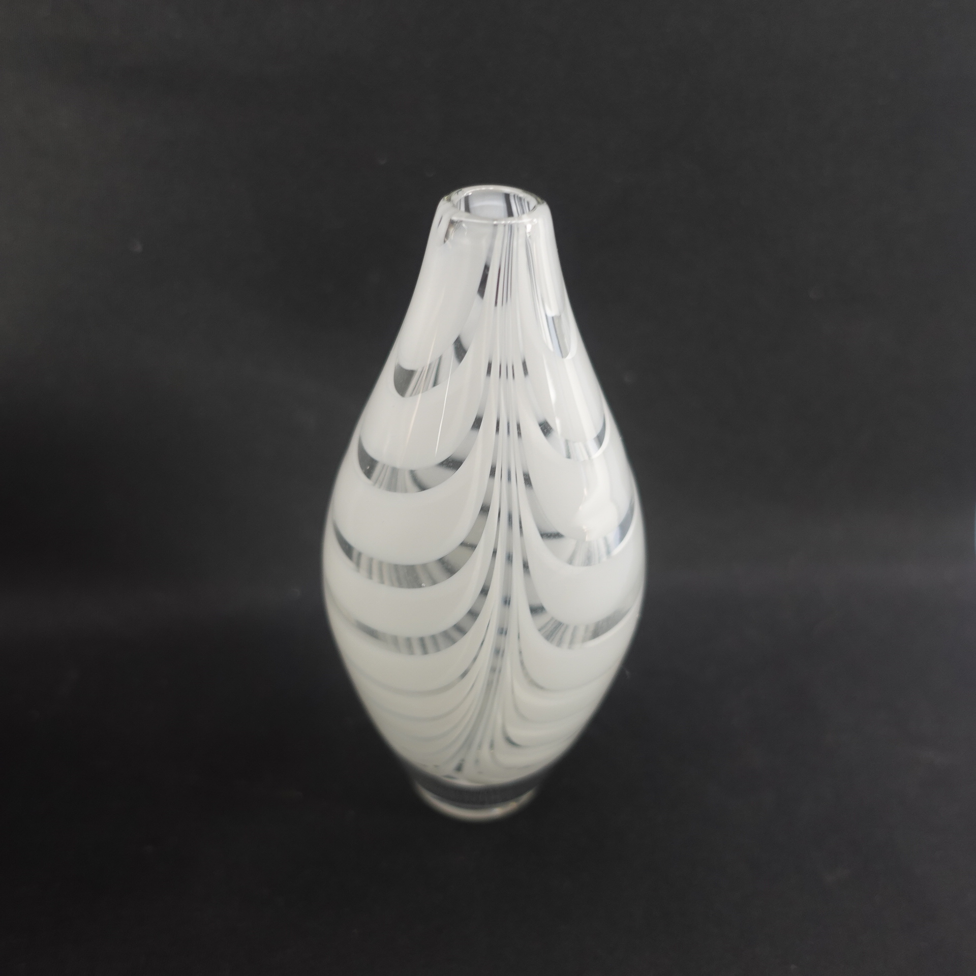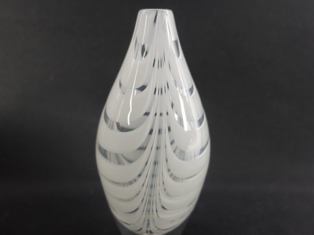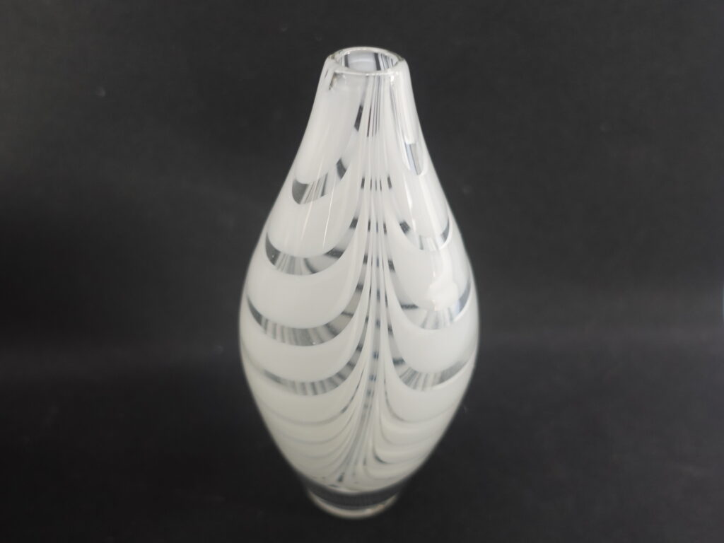 A Filigraani vase designed by Maija Carlson for Kumela glass, with a height of 14.5 cm and a diameter of approx. 7 cm. The vase was produced in 1955-66. The vase is signed: Kumela. The white-striped vase is intact and otherwise in good condition.