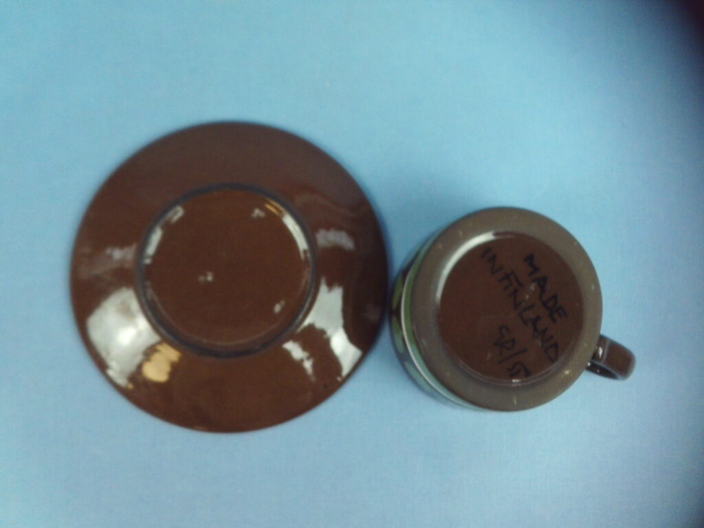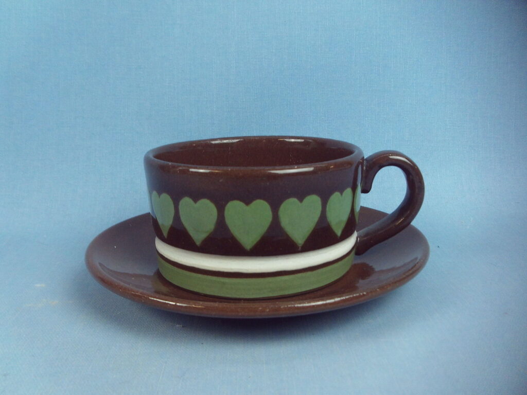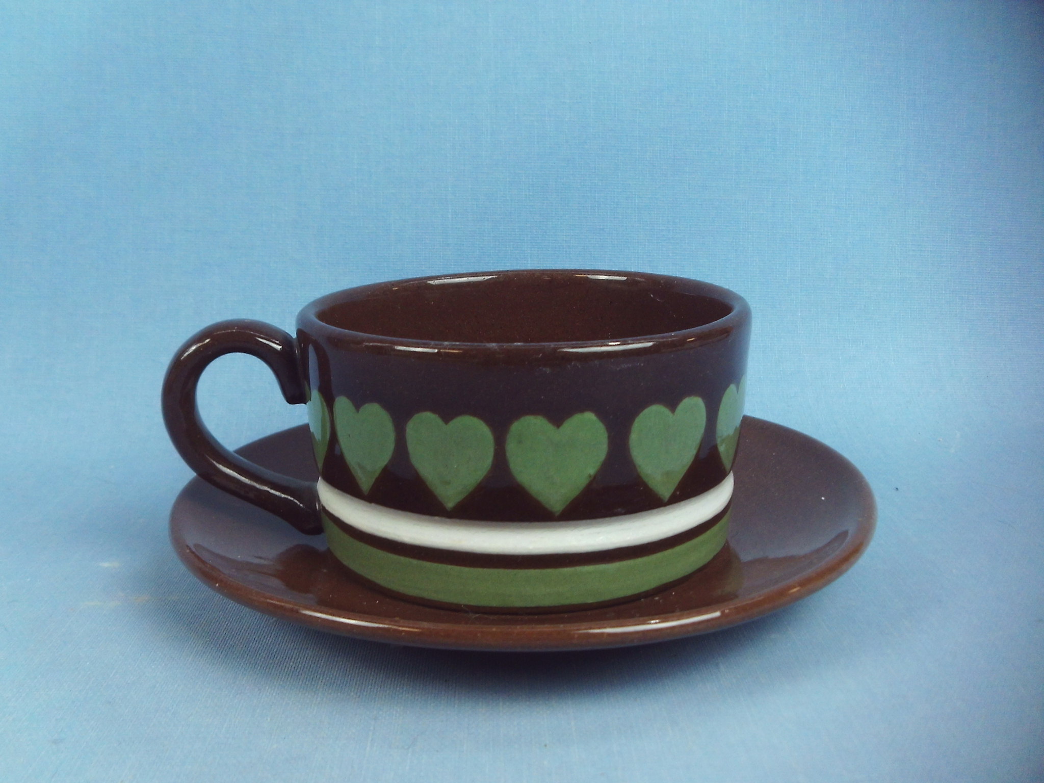 Brown coffee cup with green heart decoration designed by Gunrud Raunio for Kupittaan Save. The cup is 4.5 cm high, 8.5 cm in diameter and has a capacity of 18 cl. The saucer is 13.8 cm in diameter and 2 cm high. The cups and saucers for sale are intact and otherwise in good condition, almost scratch-free.