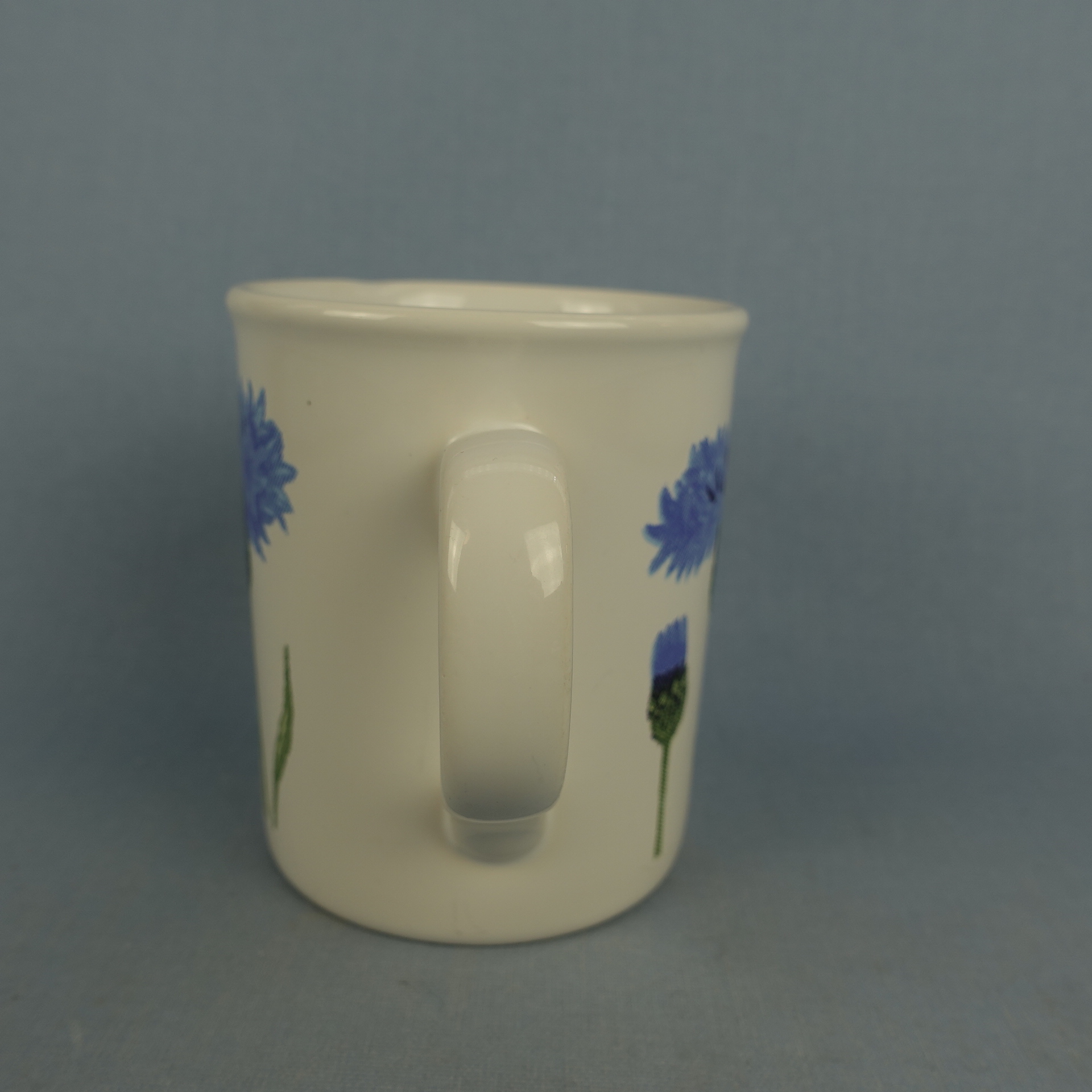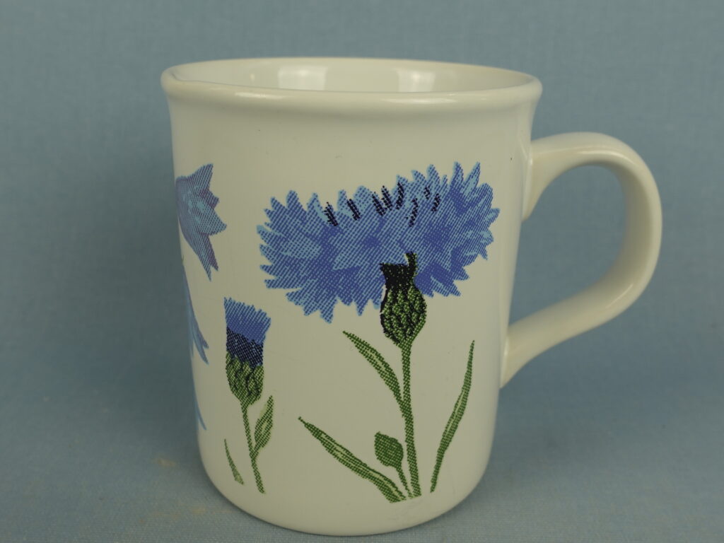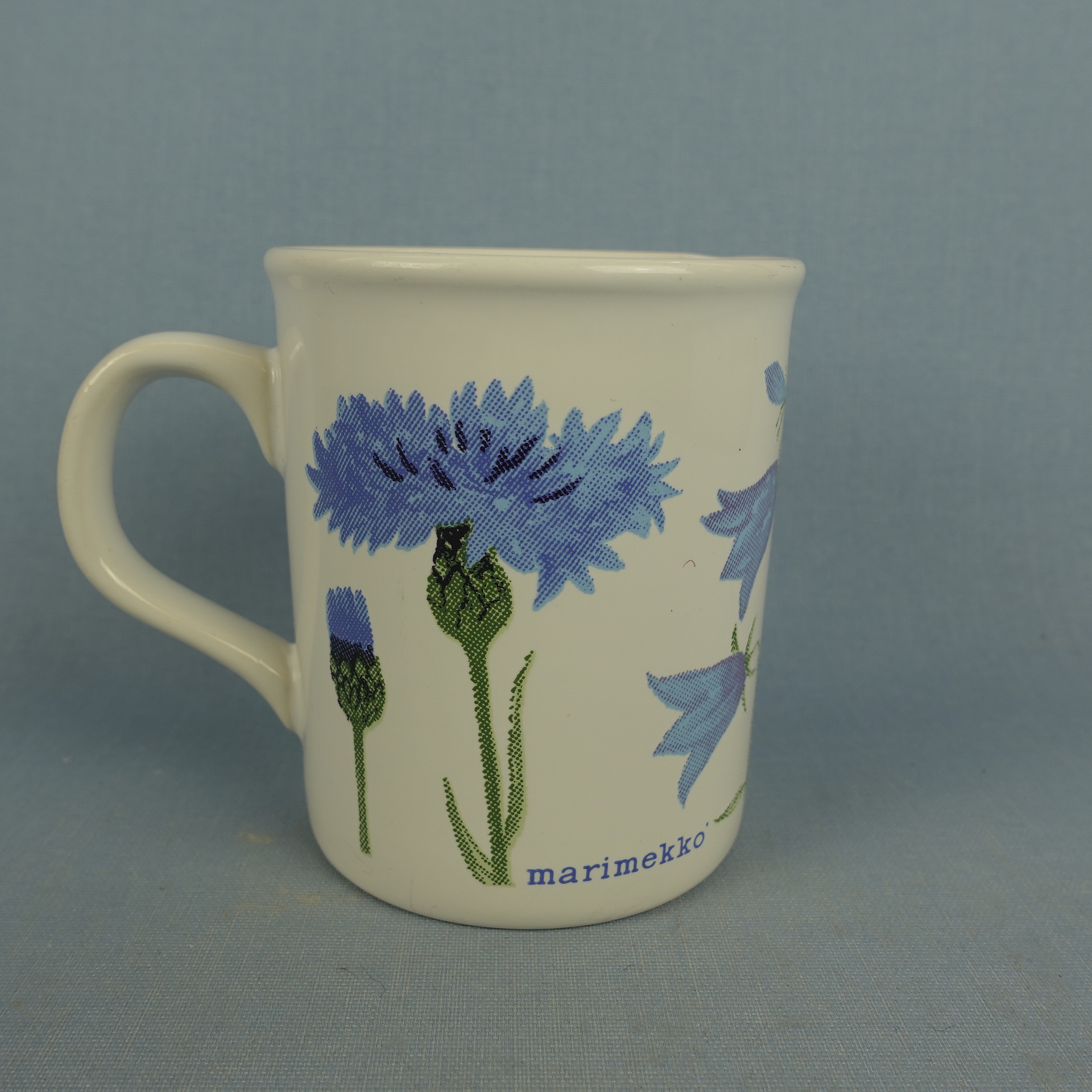 A mug from the Cornflower (= Ruiskukka) series designed by Kristiina Isola for Marimekko from the 1990s. The mug is made in England. The mug is decorated with both cornflowers and bluebells. The mug is 9.6 cm high, 8 cm in diameter and has a capacity of 30 cl. The mugs for sale are intact and otherwise in good condition.