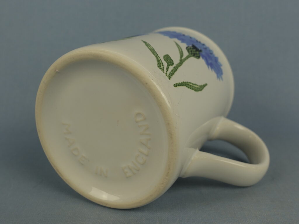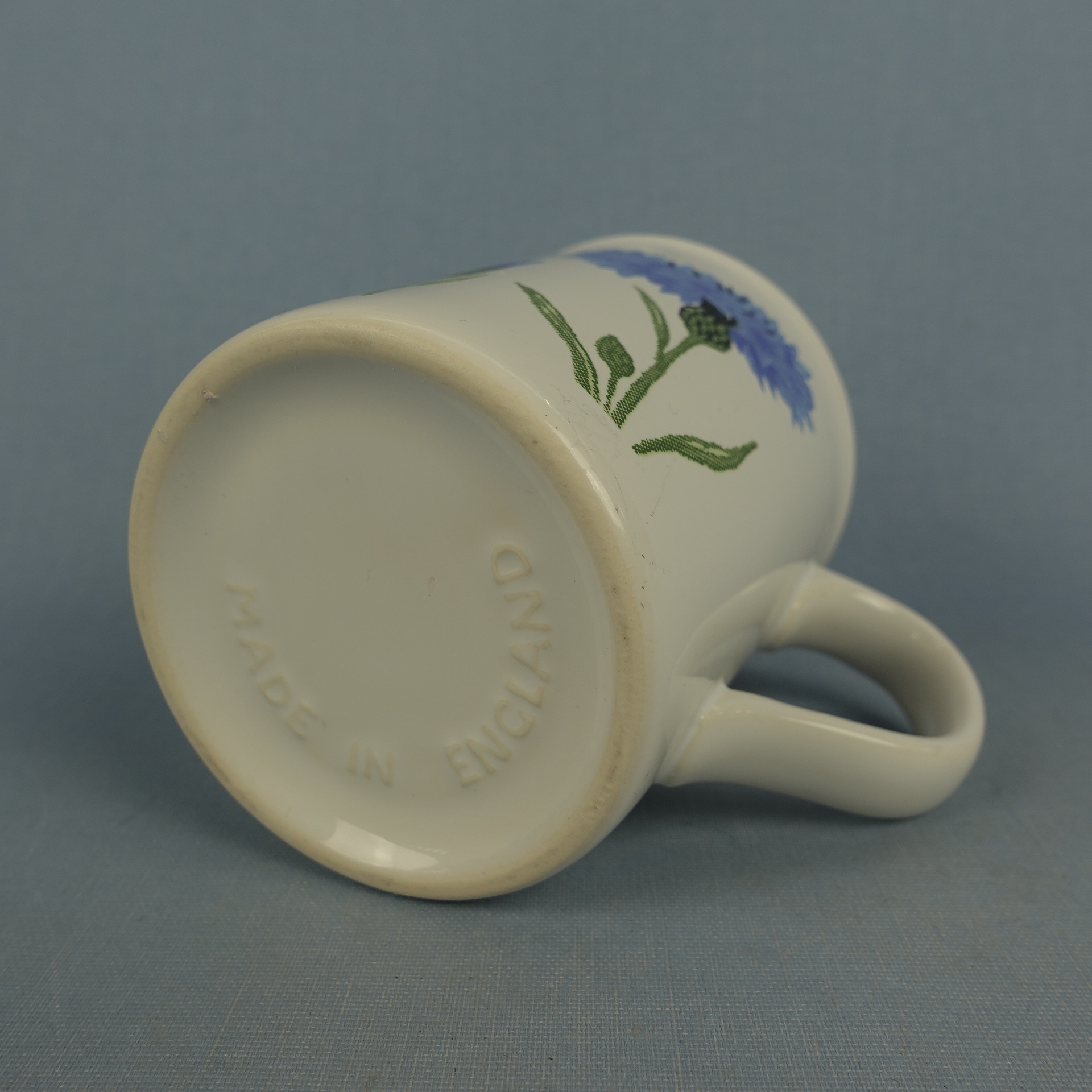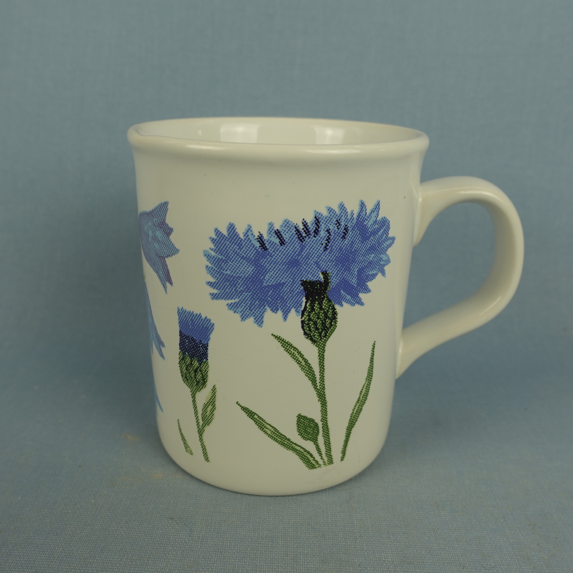 A mug from the Cornflower (= Ruiskukka) series designed by Kristiina Isola for Marimekko from the 1990s. The mug is made in England. The mug is decorated with both cornflowers and bluebells. The mug is 9.6 cm high, 8 cm in diameter and has a capacity of 30 cl. The mugs for sale are intact and otherwise in good condition.