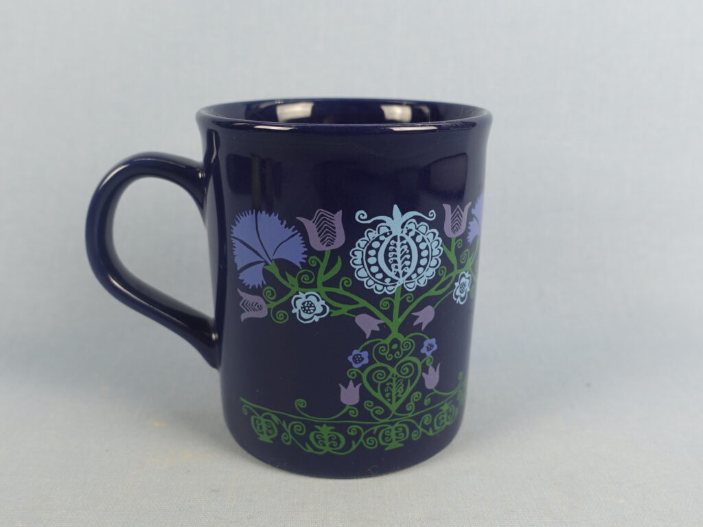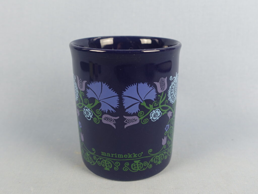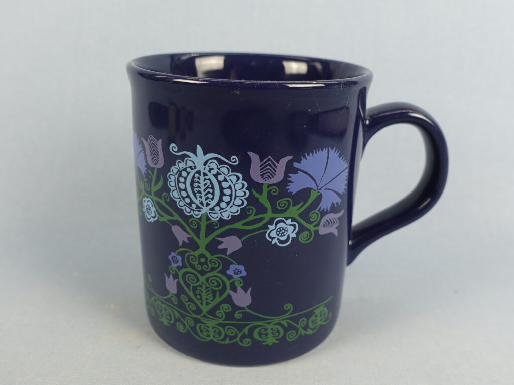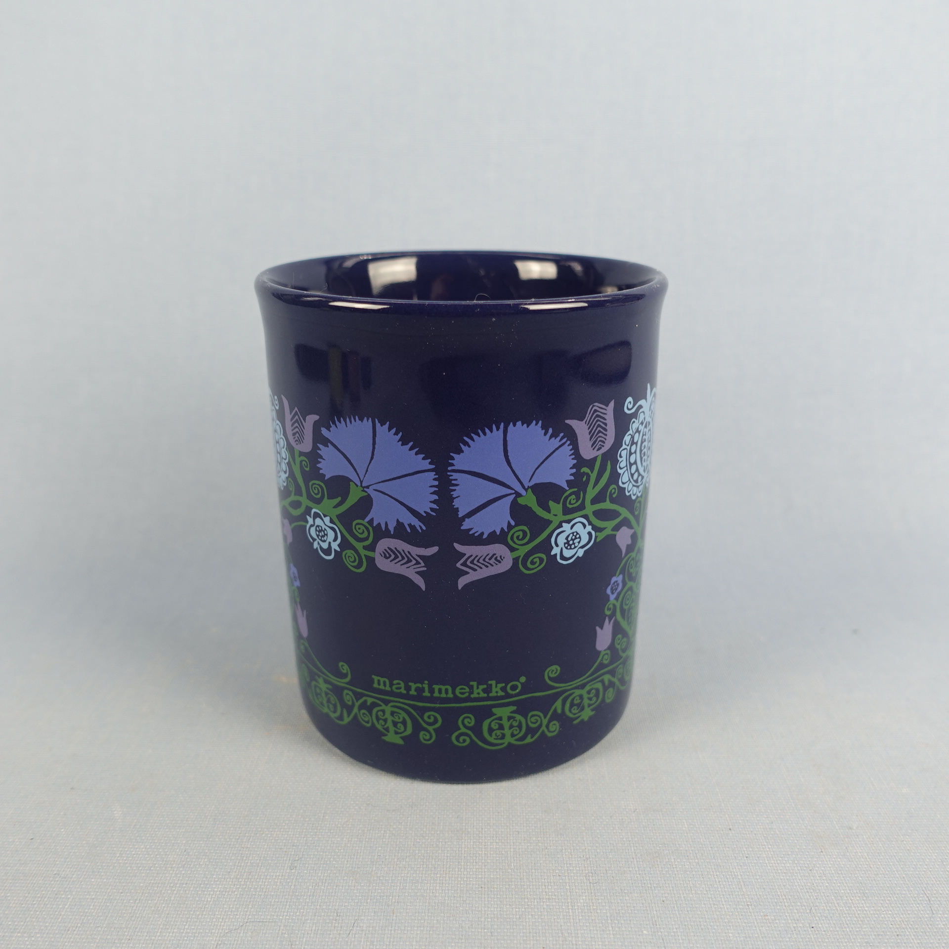 Blue Pomegranate mug designed by Maija Isola for Marimekko from the 1990s. The mug is made in England. The mug is 9.6 cm high, 8 cm in diameter and has a capacity of 30 cl. The mug for sale is intact and in good condition.