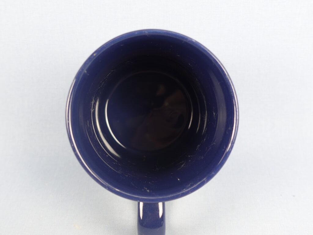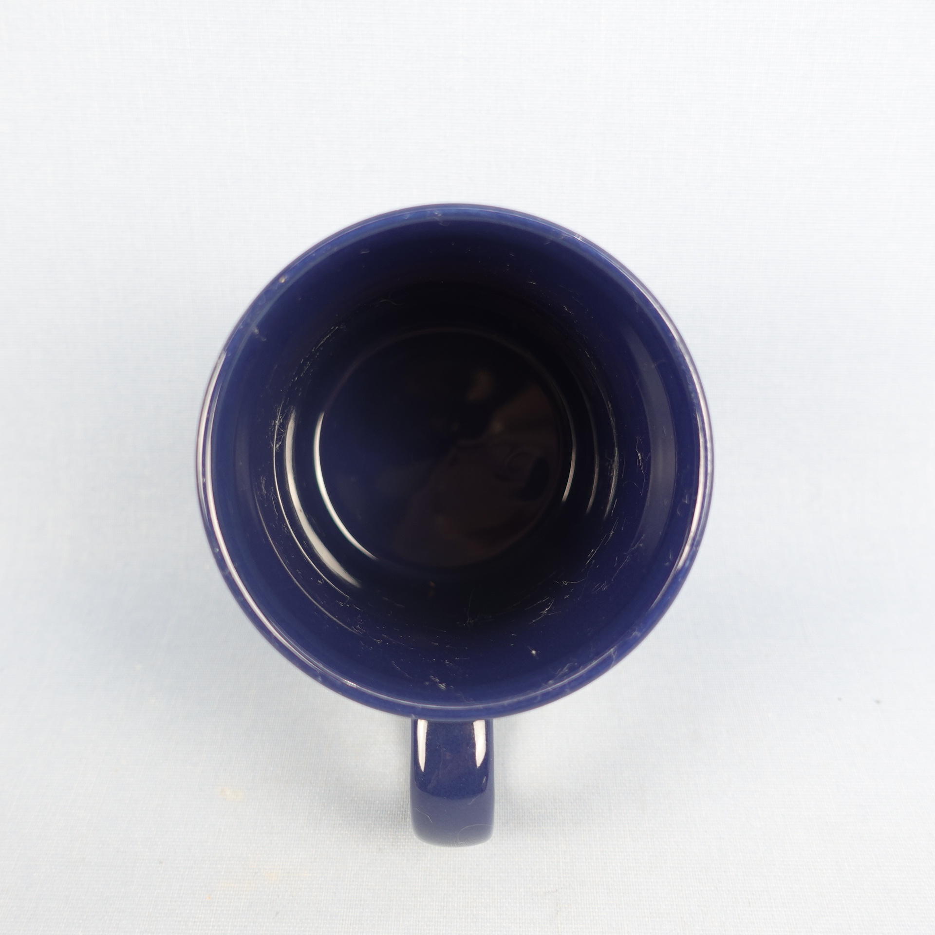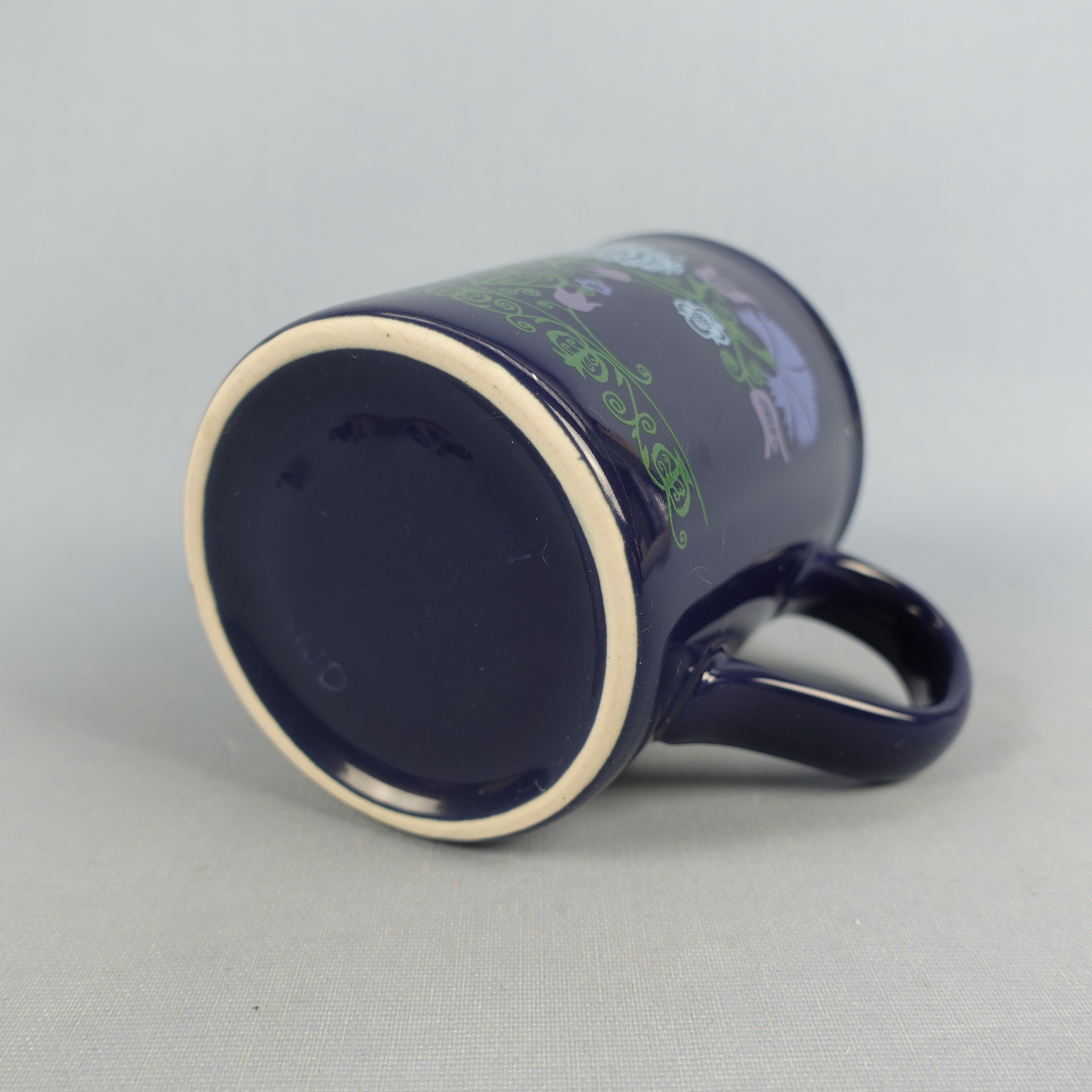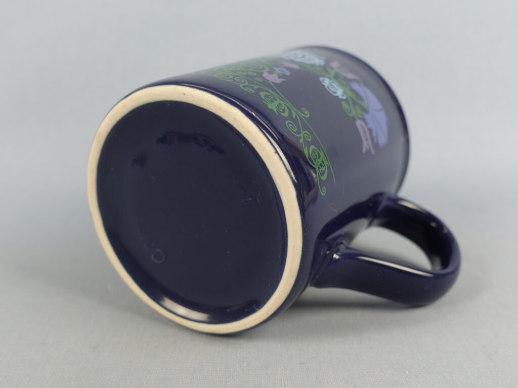Blue Pomegranate mug designed by Maija Isola for Marimekko from the 1990s. The mug is made in England. The mug is 9.6 cm high, 8 cm in diameter and has a capacity of 30 cl. The mug for sale is intact and in good condition.