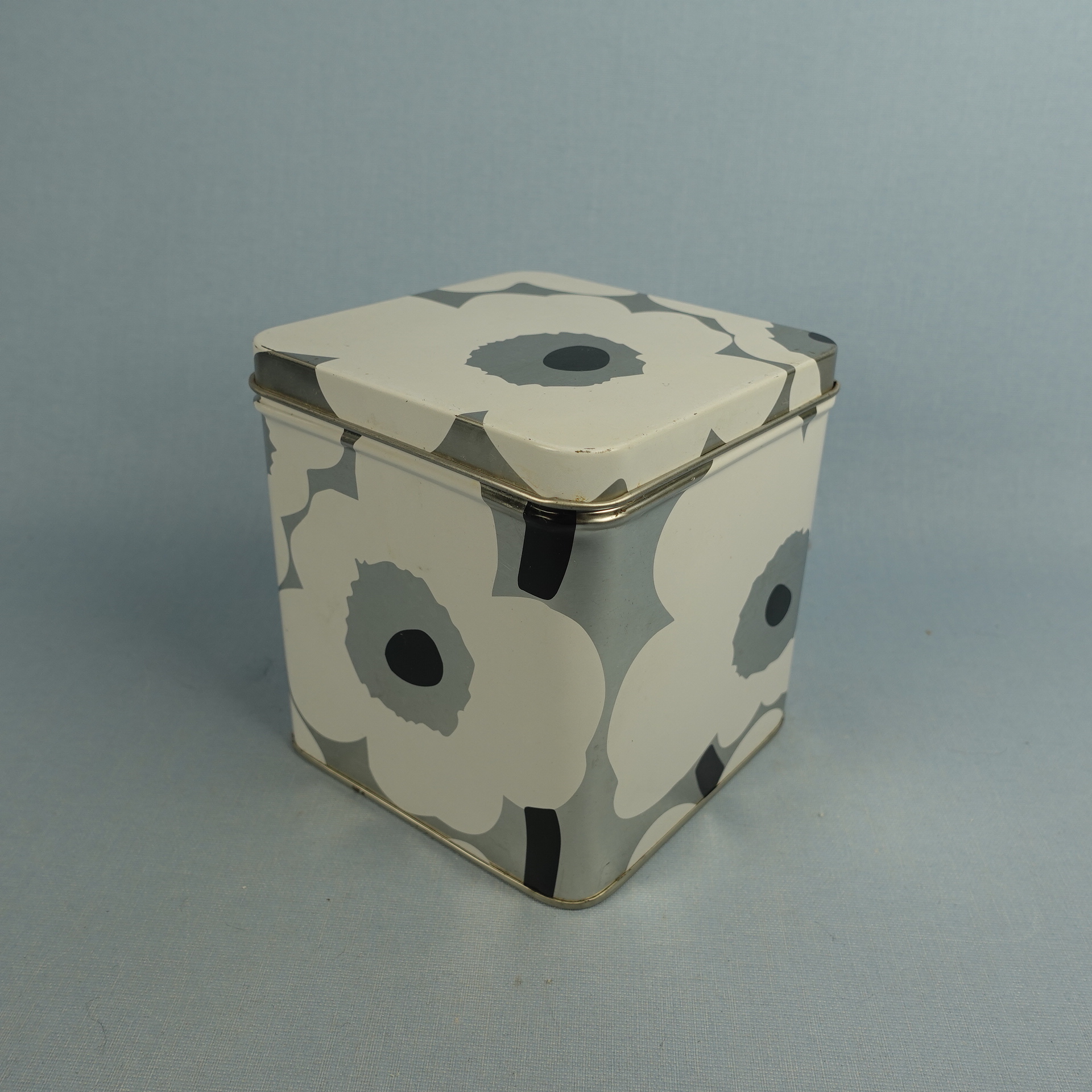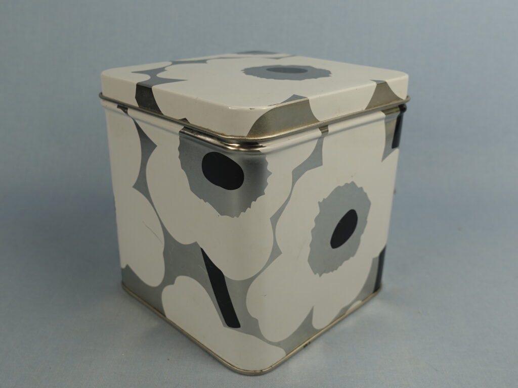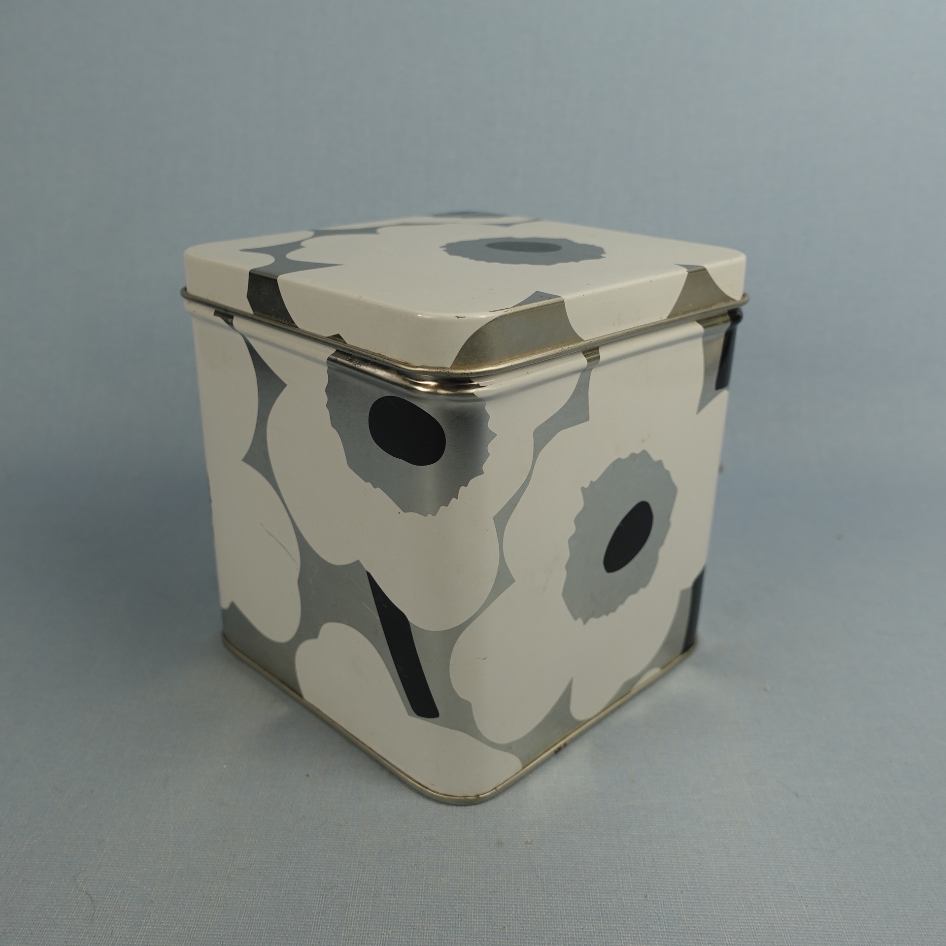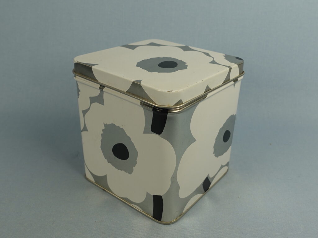 A white Unikko-series tin box with lid designed by Maija Isola for Marimekko. The box’s lid is hinged. The box’s height is 11.5 cm and its diameter 10.5 cm. The boxess for sale are used , but in good condition.