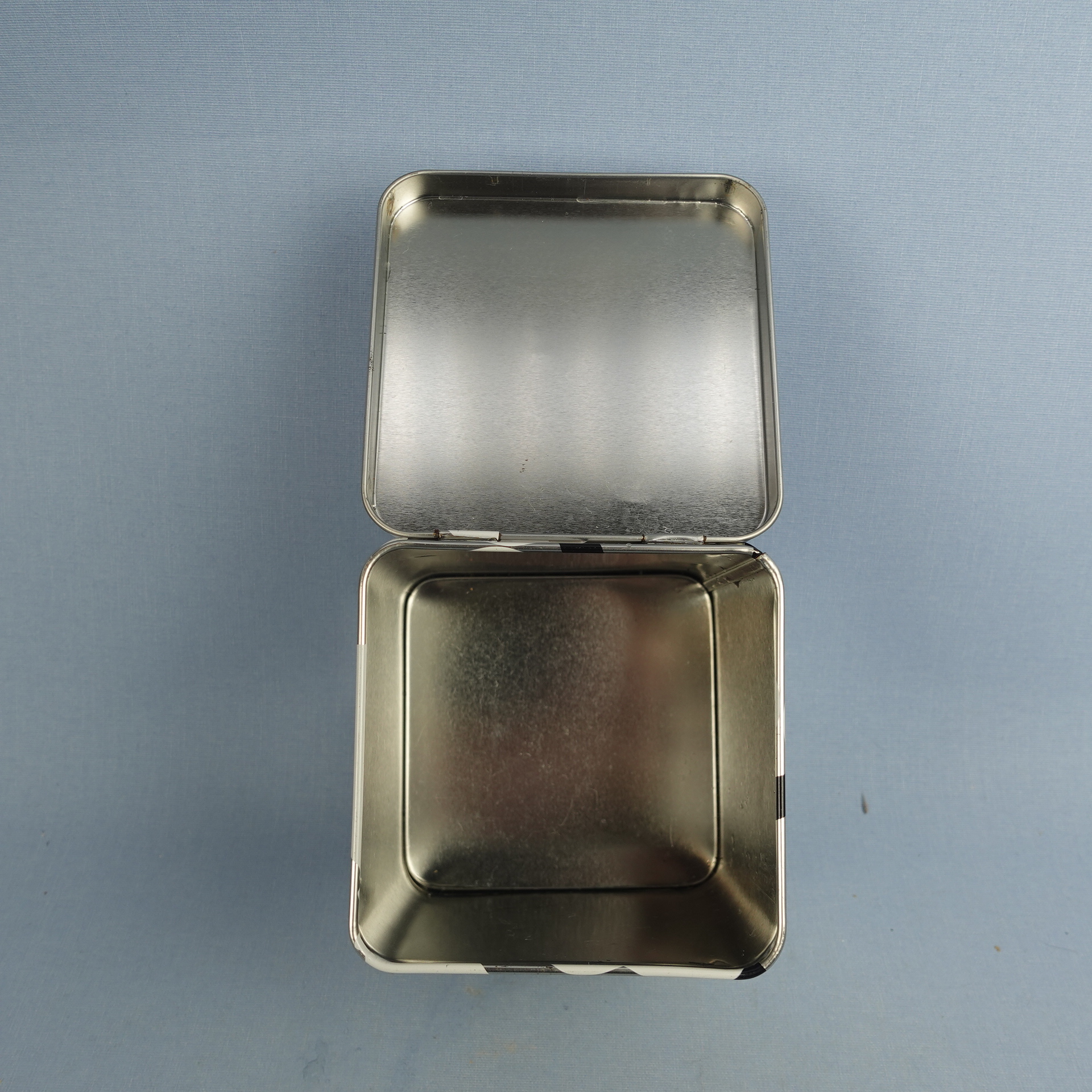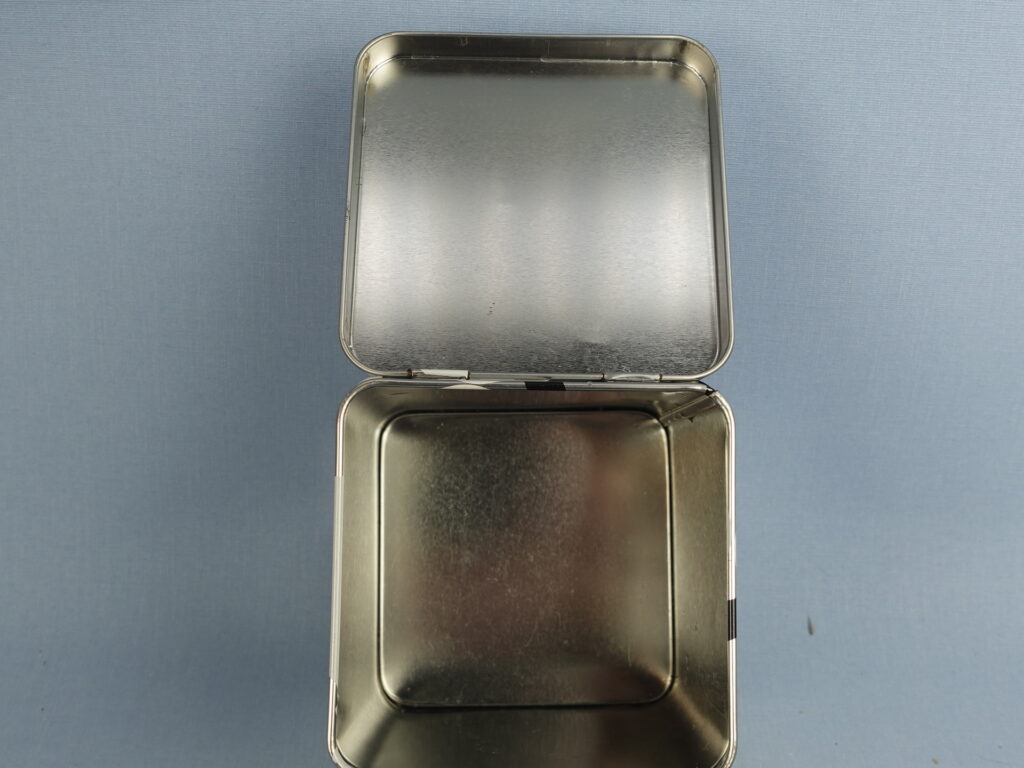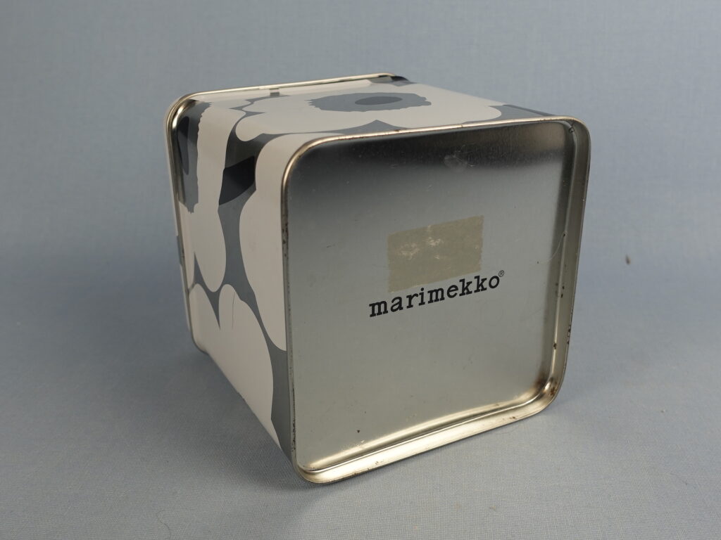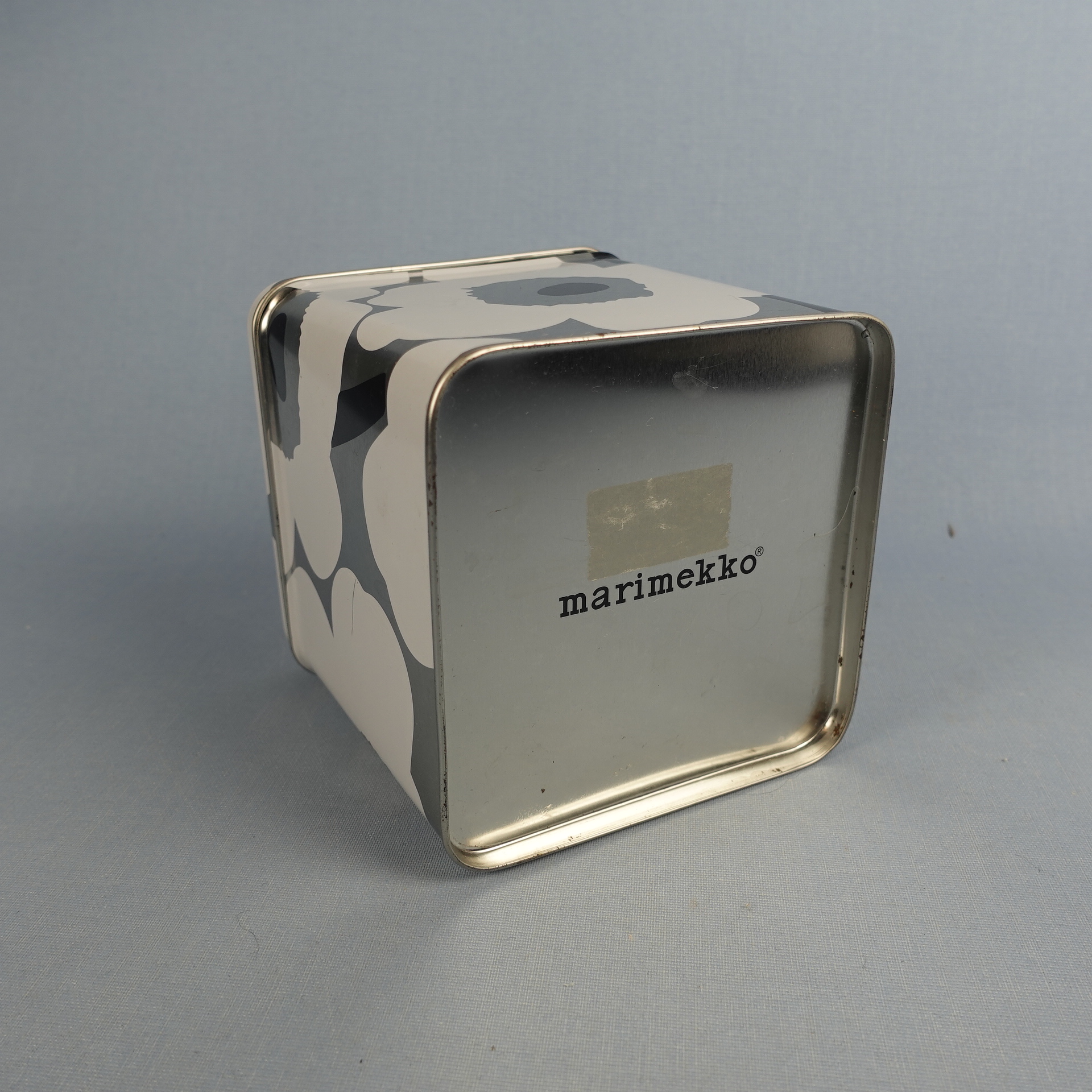 A white Unikko-series tin box with lid designed by Maija Isola for Marimekko. The box’s lid is hinged. The box’s height is 11.5 cm and its diameter 10.5 cm. The boxess for sale are used , but in good condition.