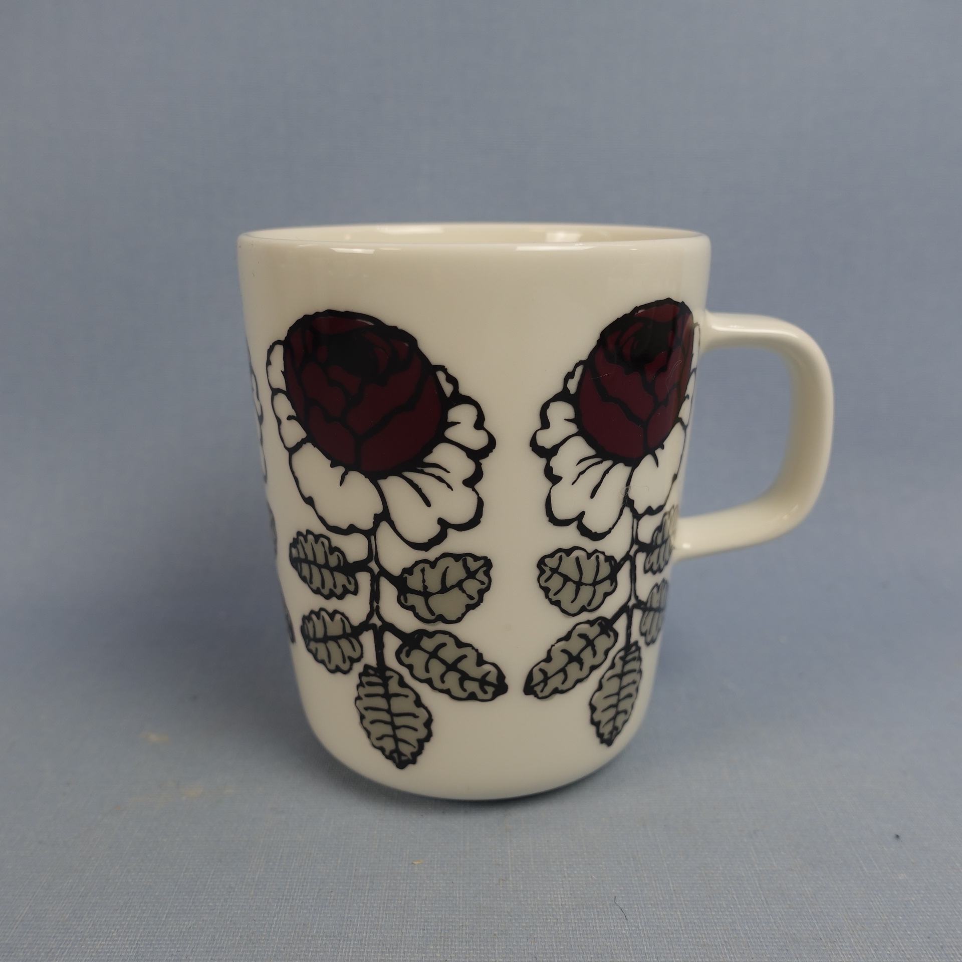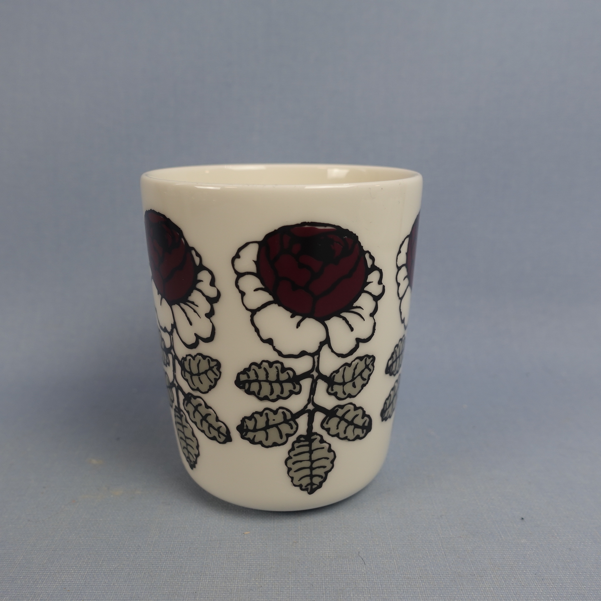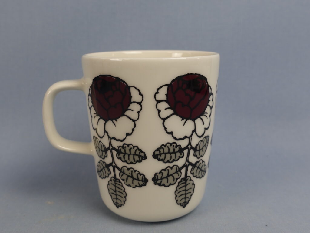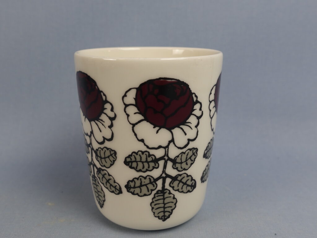 A red mug from the Wedding Rose series designed by Maija Isola for Marimekko. The mug is 9.5 cm high, 7.8 cm in diameter and has a capacity of 25 cl. The mugs for sale are intact and otherwise in good condition.