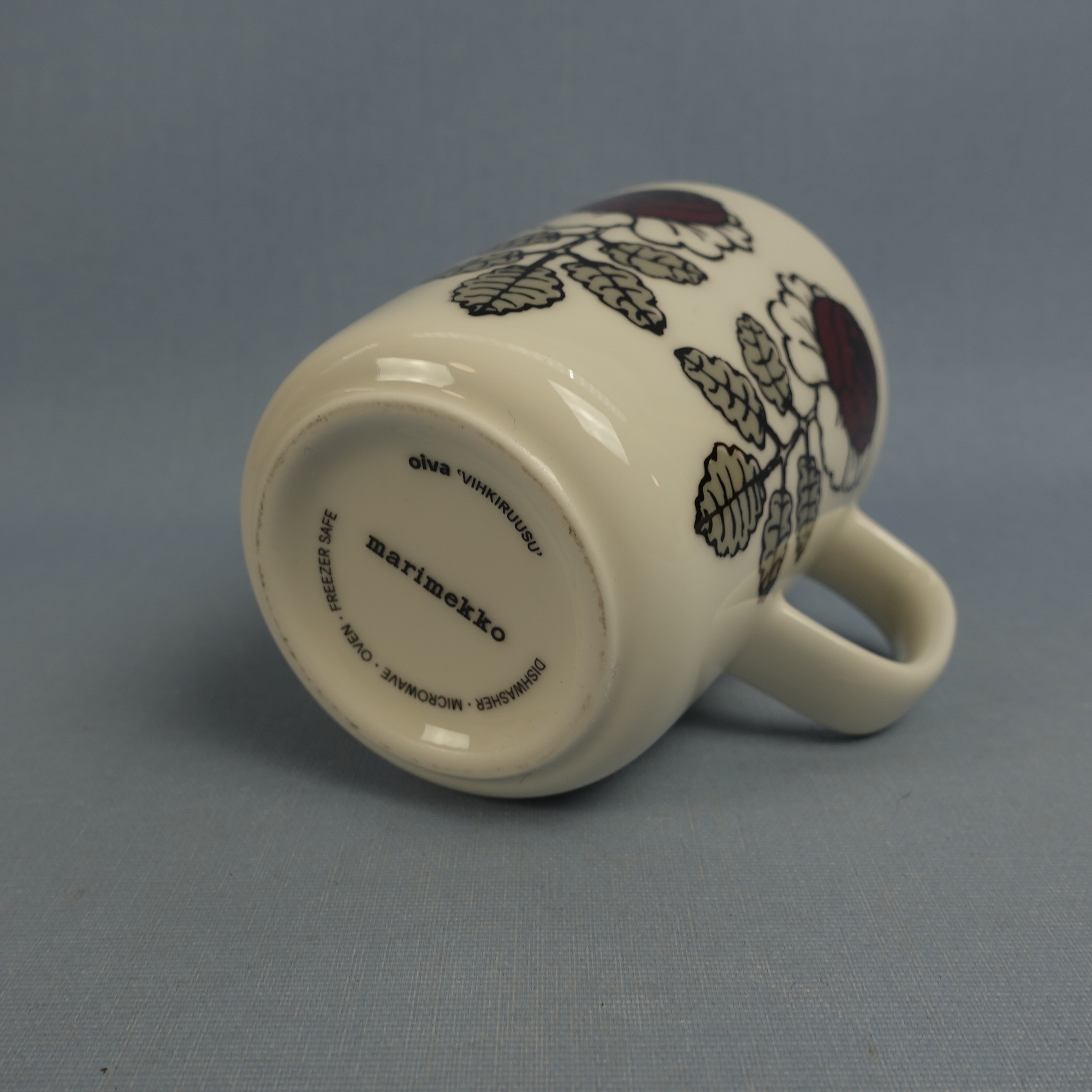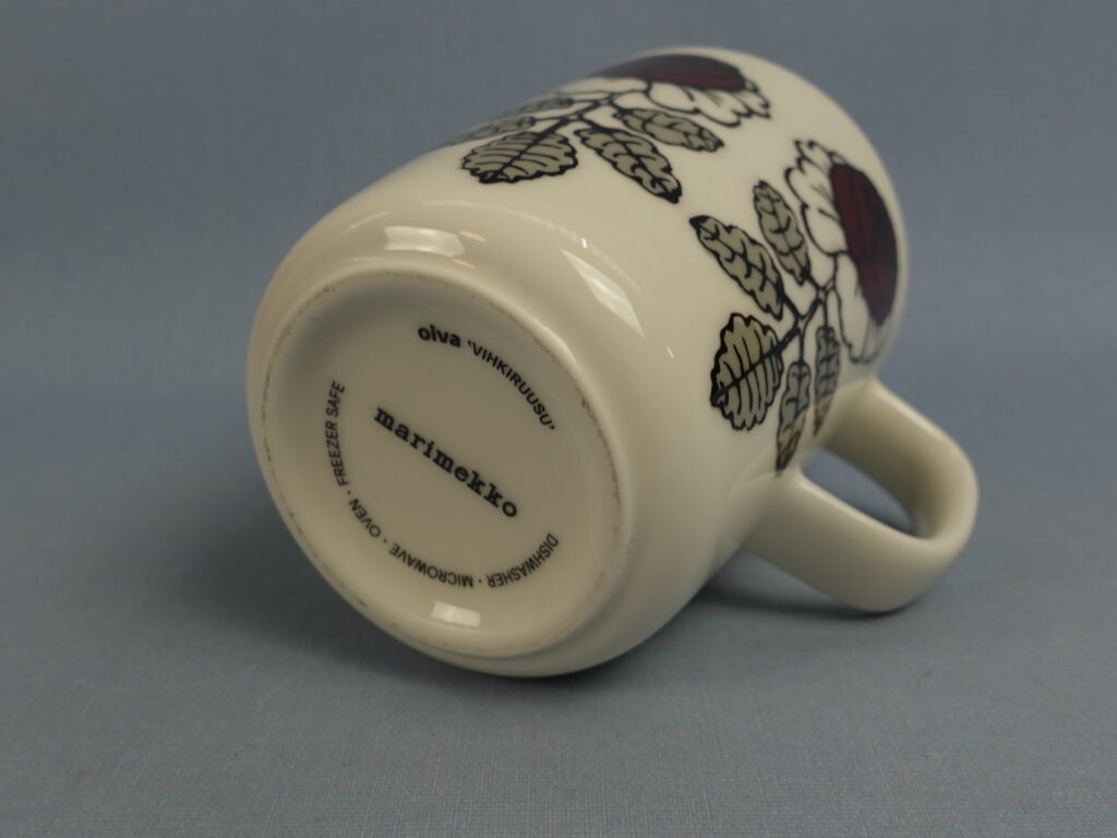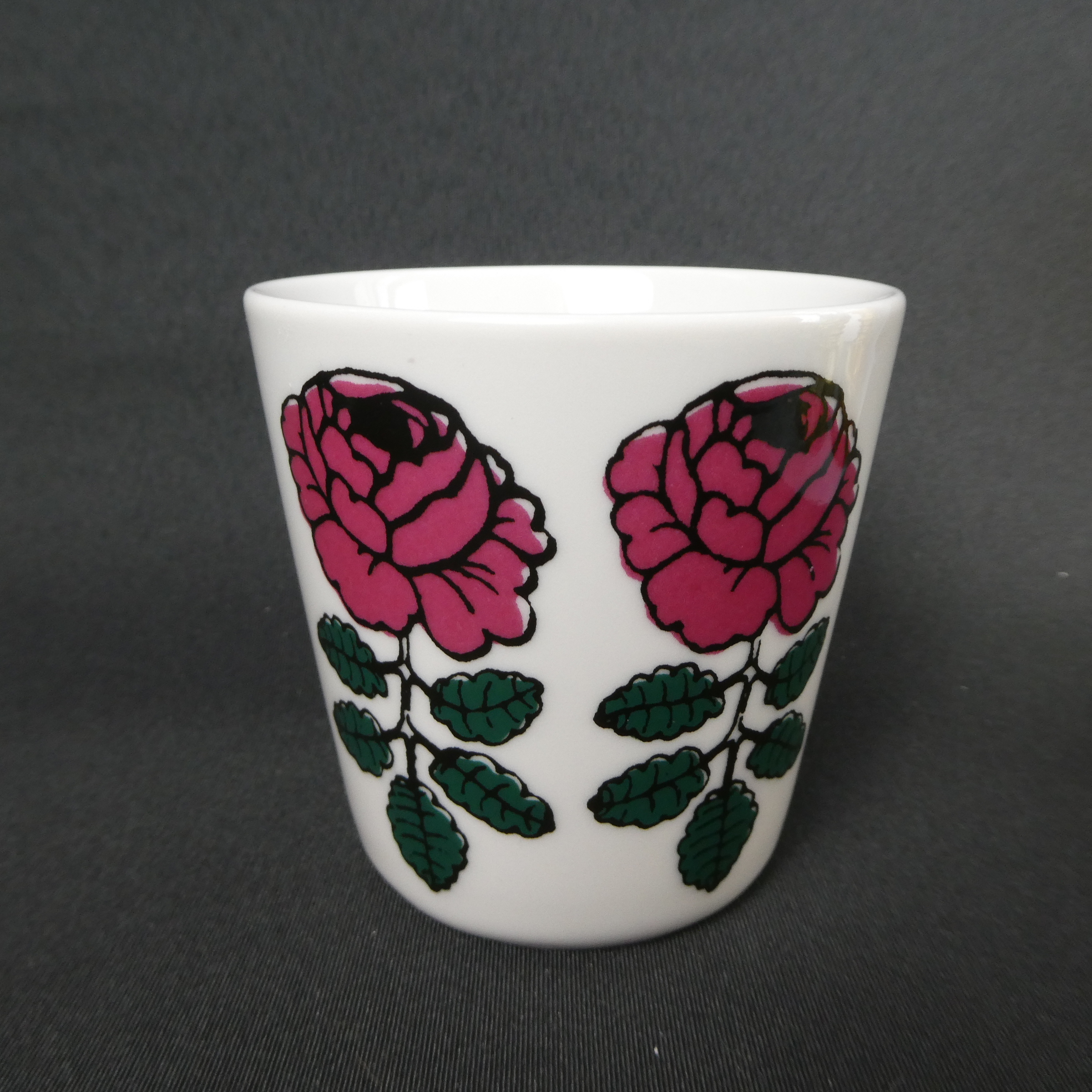 A red mug from the Wedding Rose series designed by Maija Isola for Marimekko. The mug is 9.5 cm high, 7.8 cm in diameter and has a capacity of 25 cl. The mugs for sale are intact and otherwise in good condition.