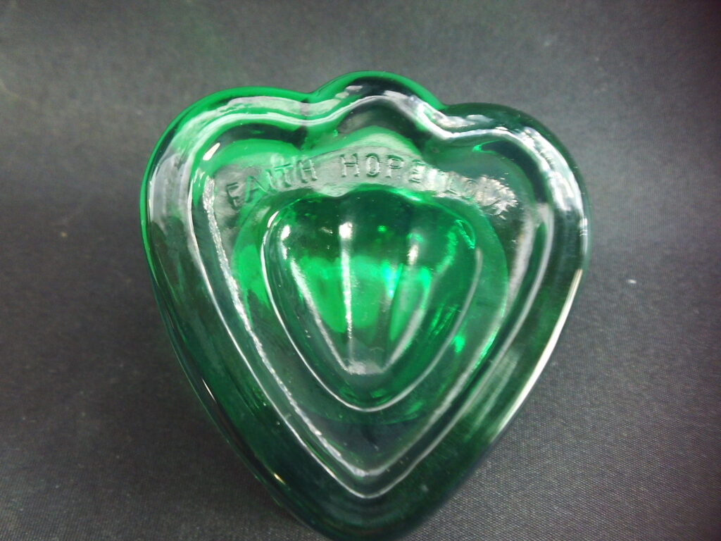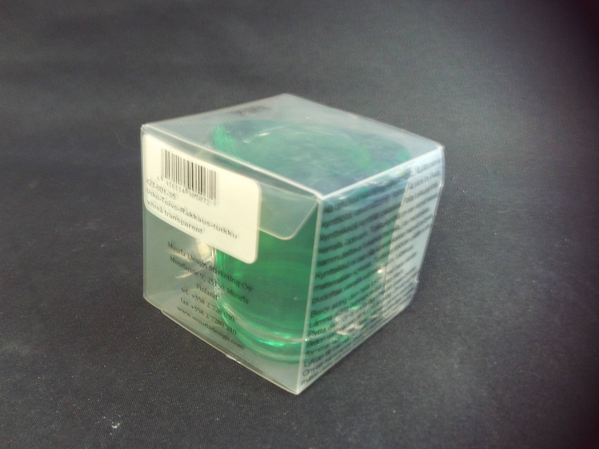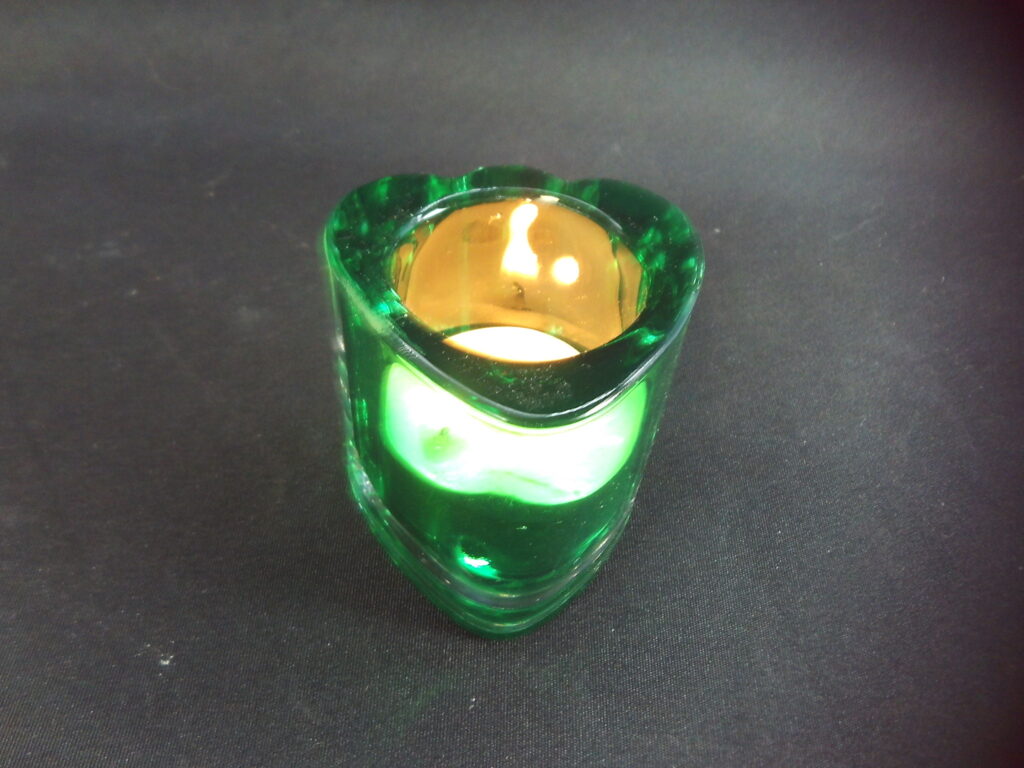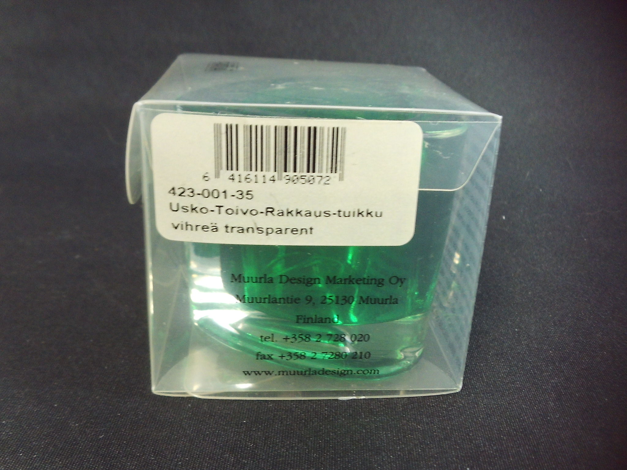 Green Faith Hope Love tealight holder designed by Ristomatti Ratia for Muurla. The height of the candle lantern is 6 cm and the diameter is approx. 6.5 cm. The lantern for sale is unused and in its original packaging.