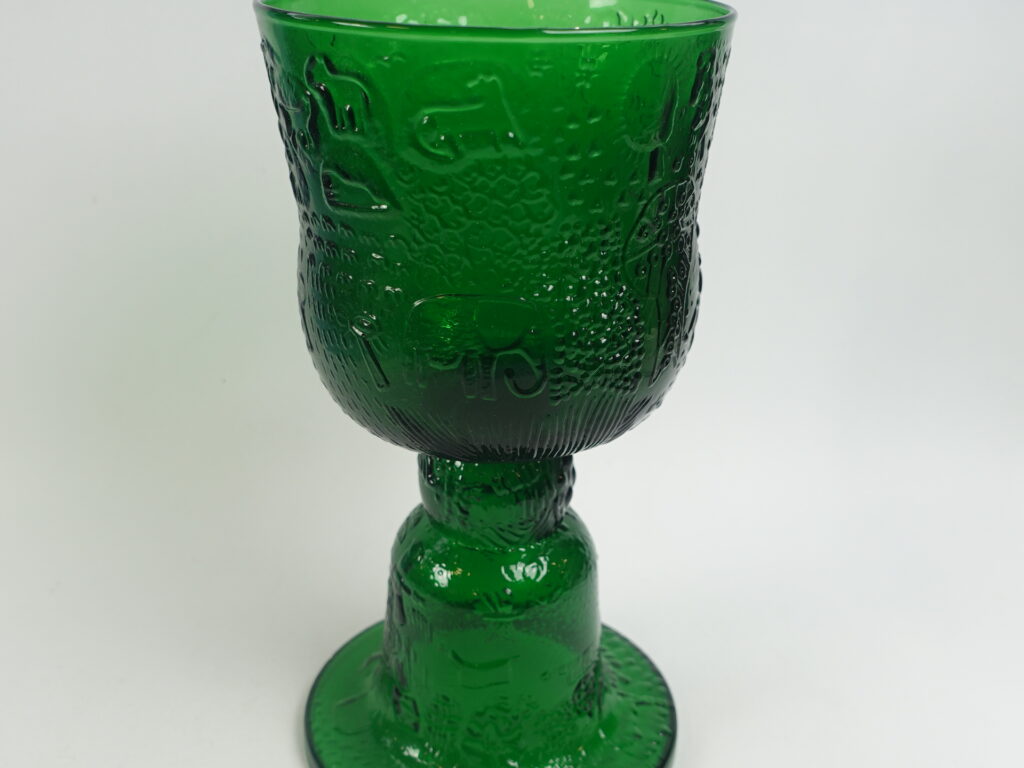 A slightly rarer green trophy/footed bowl from the Fauna series designed by Oiva Toikka for Nuutajärvi glass. The trophy was produced in 1972-75. The trophy is 25 cm high, the bowl has a diameter of 13 cm, the base has a diameter of 13 cm and a volume of 1.1 ltr. The bowl for sale is intact and otherwise in good condition.