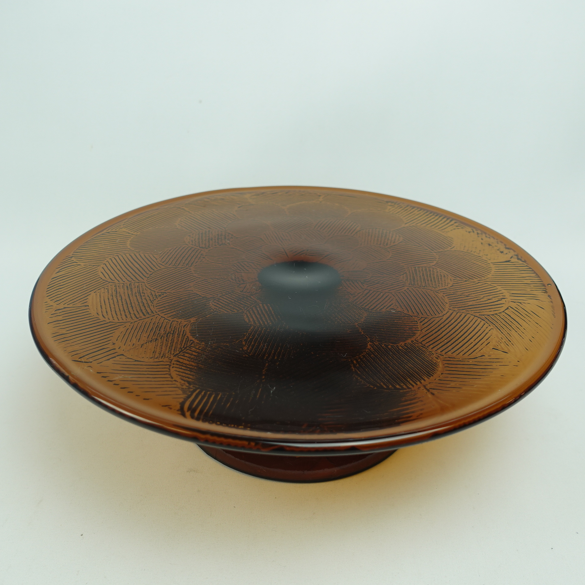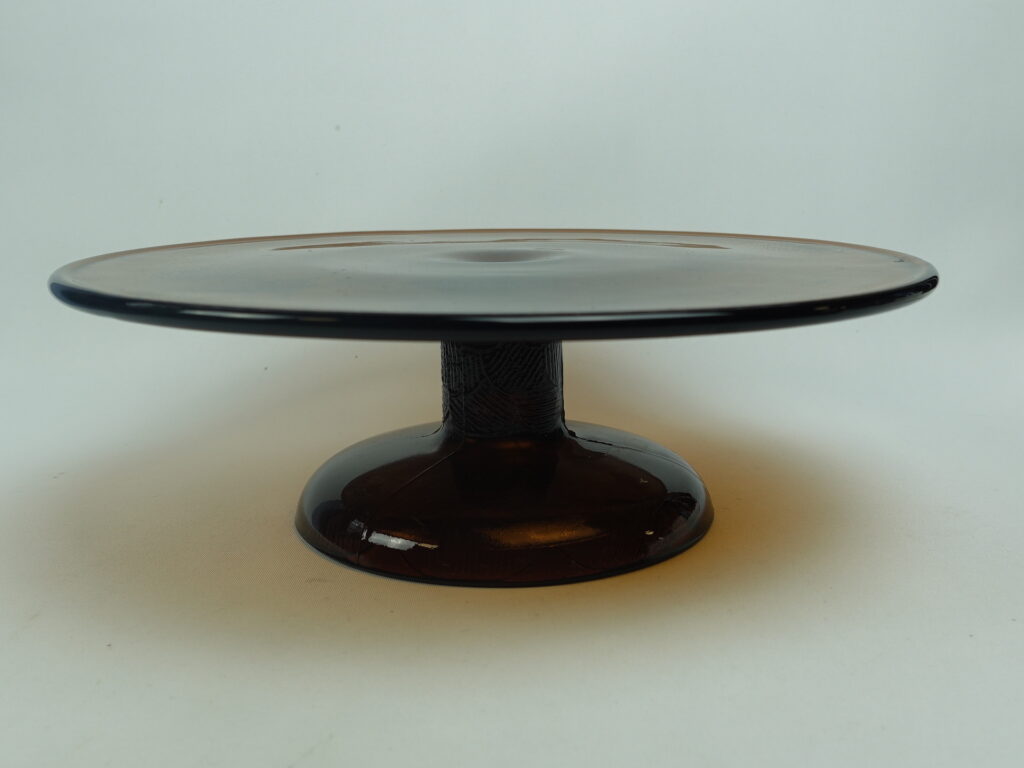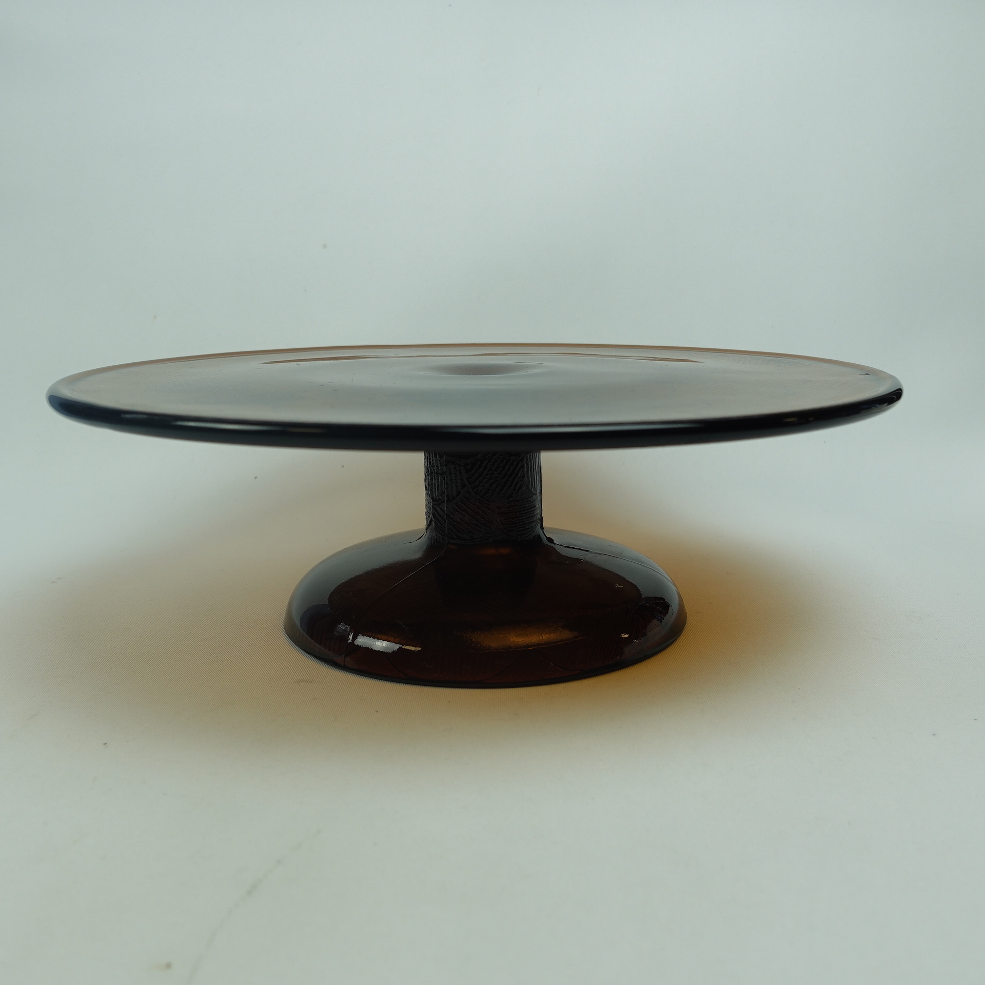 A brown cake plate with a foot from the Miranda series designed by Heikki Orvola for Nuutajärvi Glass. The color was in production from 1973-77. The height of the plate is 8.5 cm and the diameter is 26 cm. The cake plate with a foot is intact and in good condition.