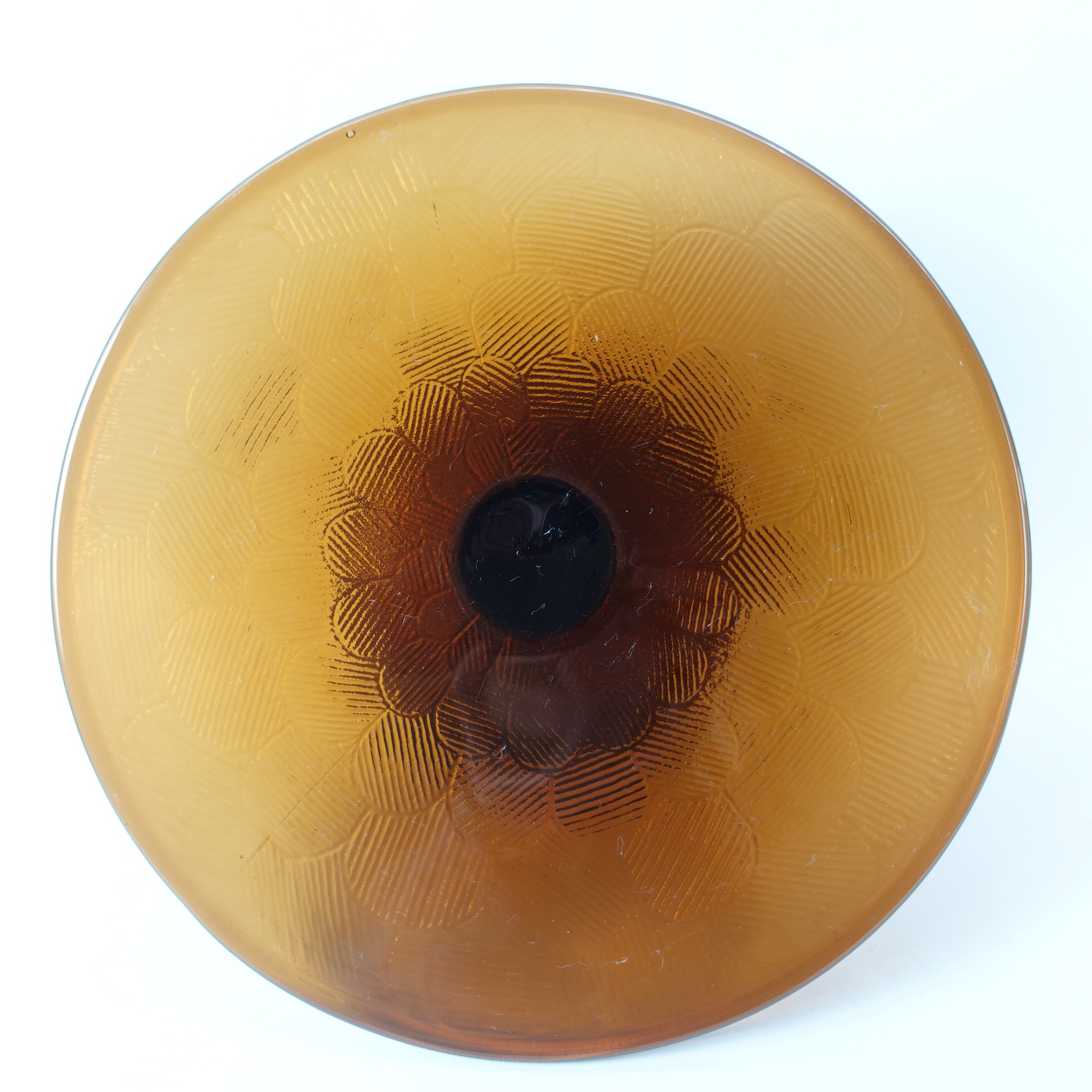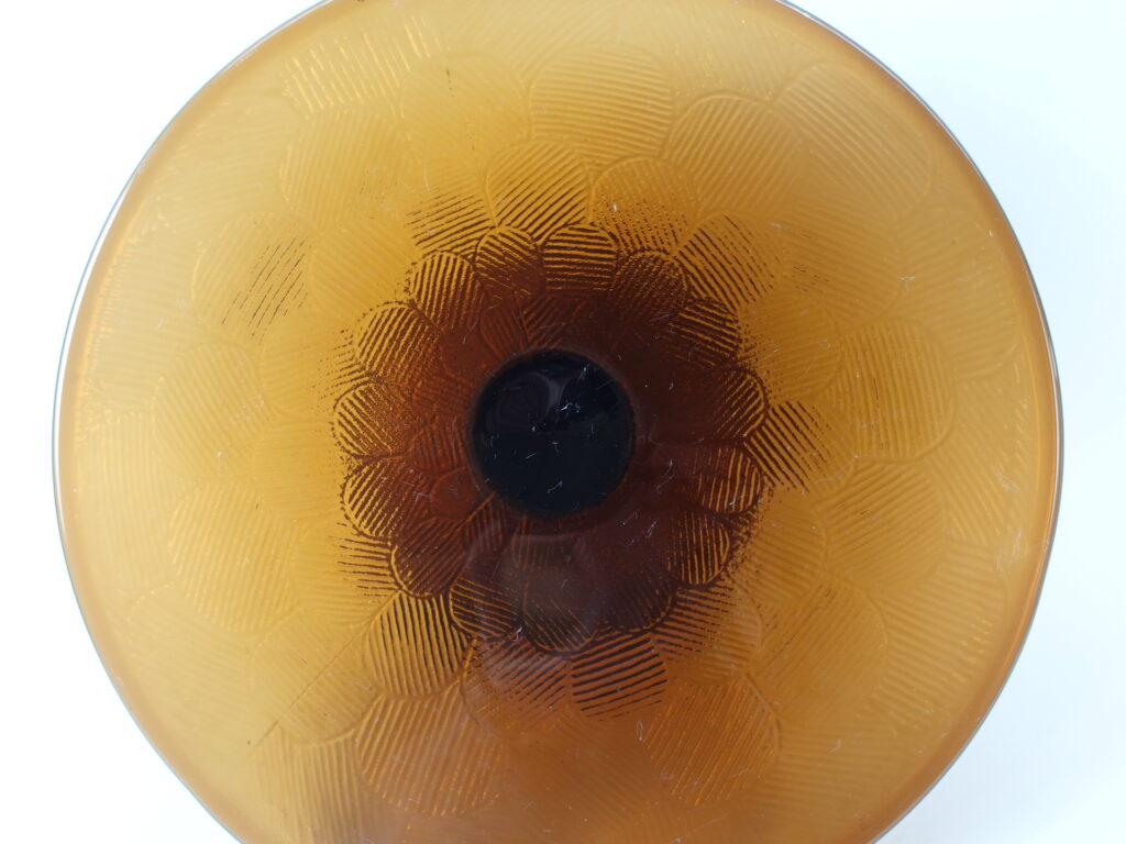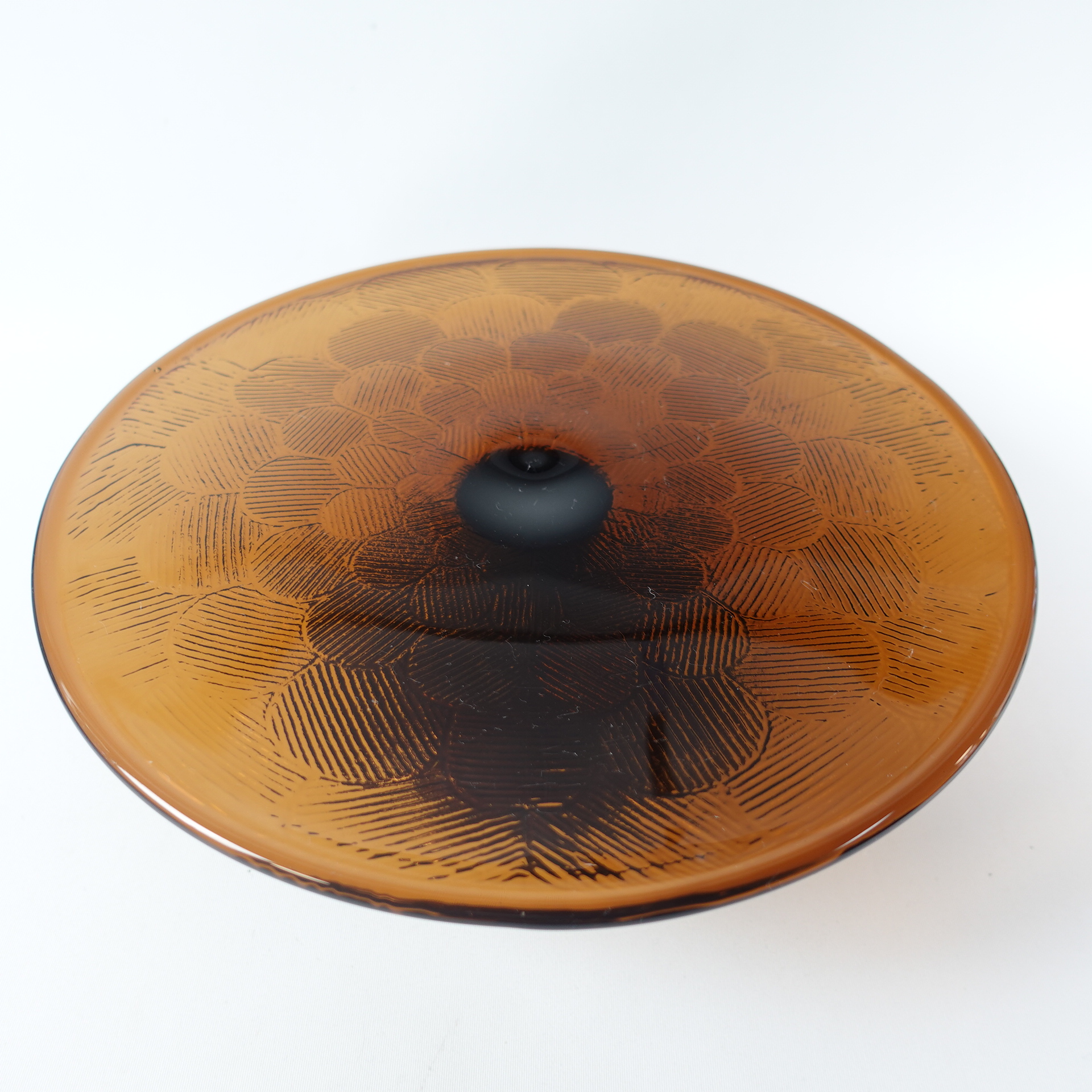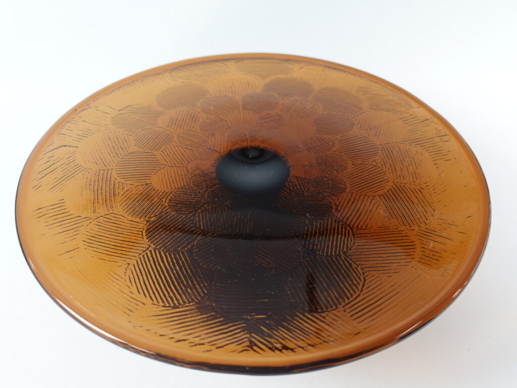 A brown cake plate with a foot from the Miranda series designed by Heikki Orvola for Nuutajärvi Glass. The color was in production from 1973-77. The height of the plate is 8.5 cm and the diameter is 26 cm. The cake plate with a foot is intact and in good condition.