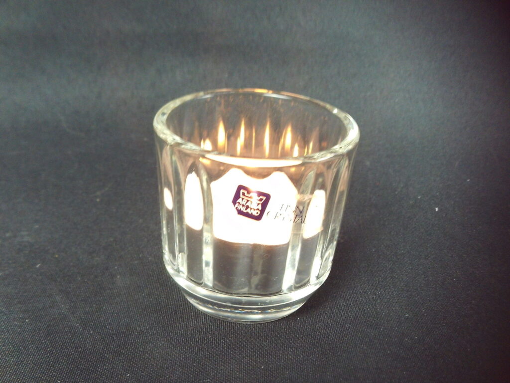Säde tealight holder designed by Kerttu Nurminen for Nuutajärvi glass. The holder was designed in 1984. The holder is 55 mm high and 55 mm in diameter. The holder for sale is intact and otherwise in good condition, almost unused.