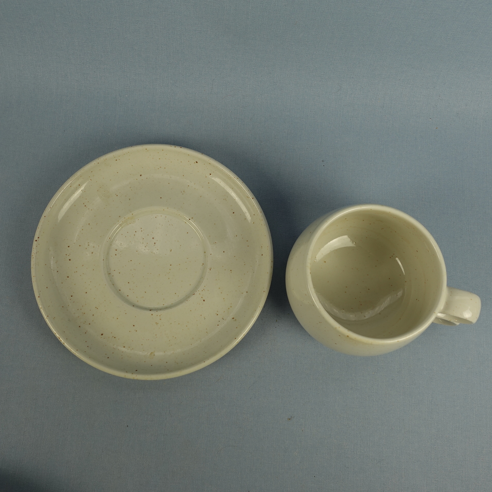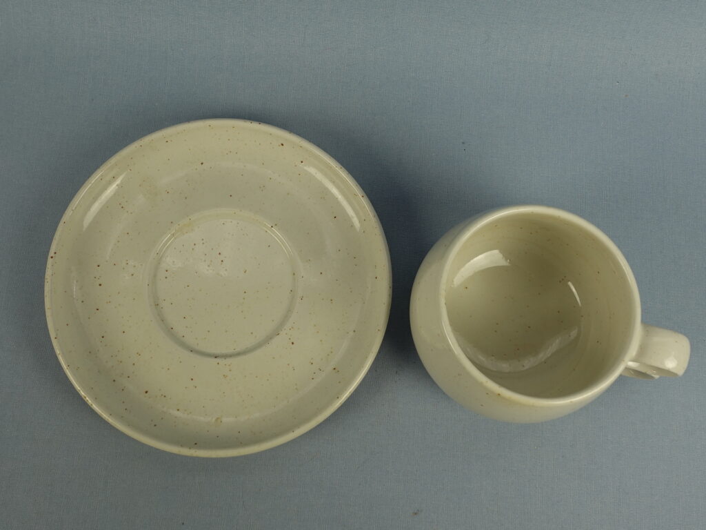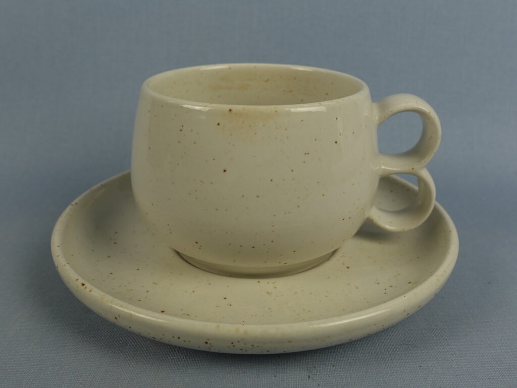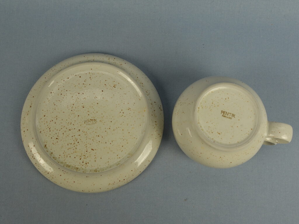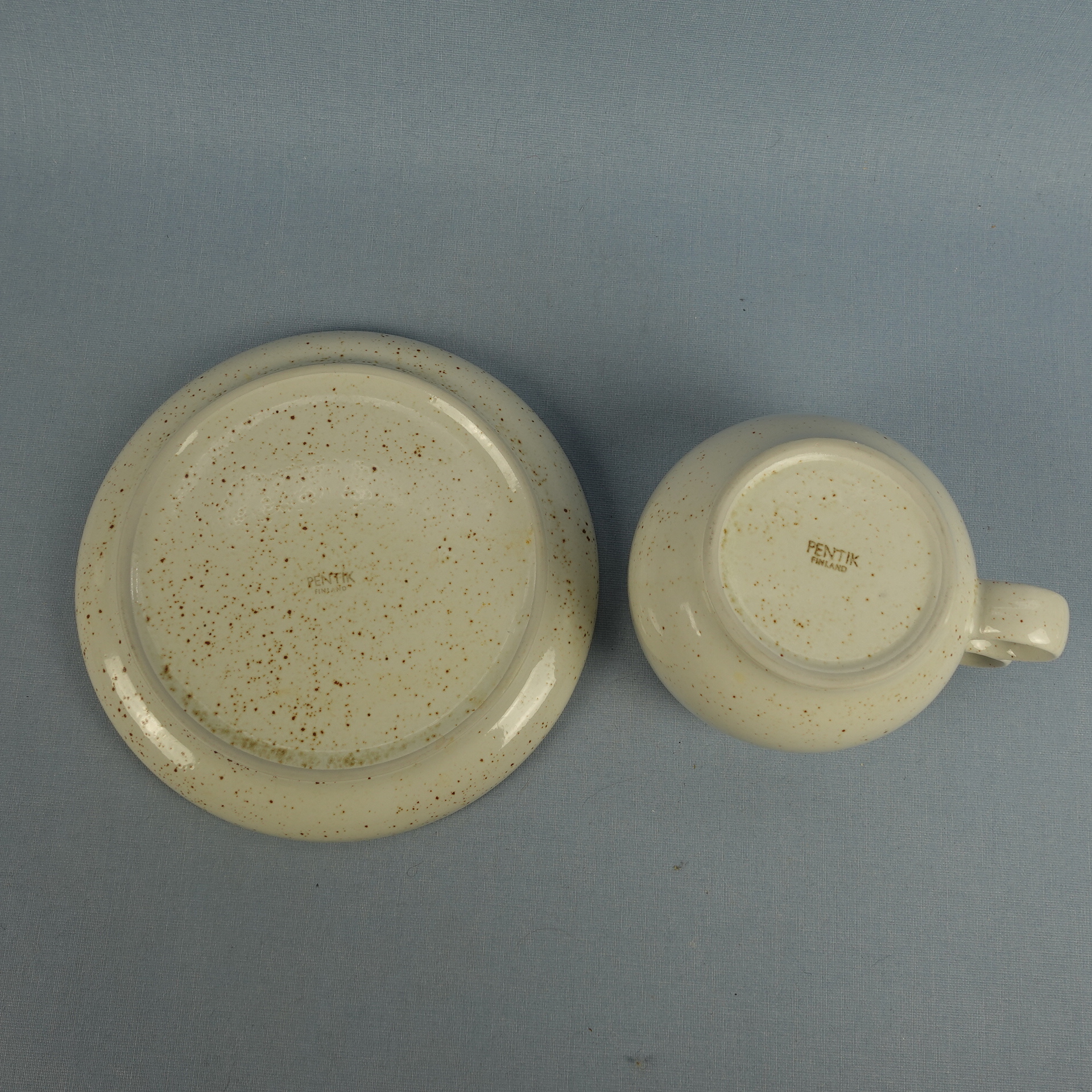 A teacup from the Halla series designed by Peter Winquist for Pentik. The series was produced in the 1970s and 80s. The height of the cup is 7 cm, the diameter is 8.5 cm and the volume is 28 cl. The diameter of the saucer is 16.3 cm and the height is 2.3 cm. The cups for sale are intact and otherwise in good condition.