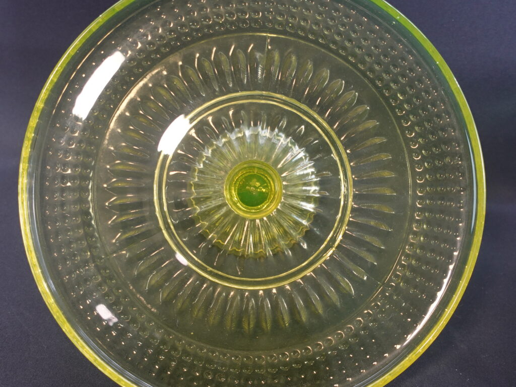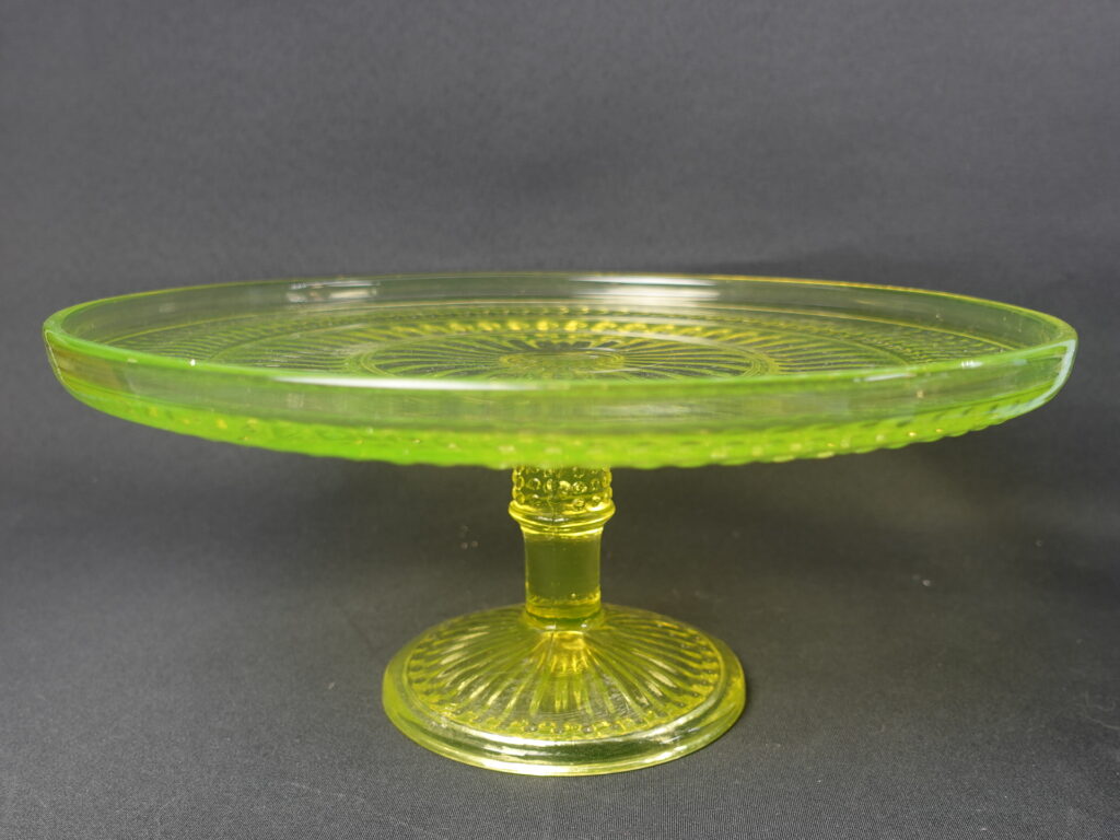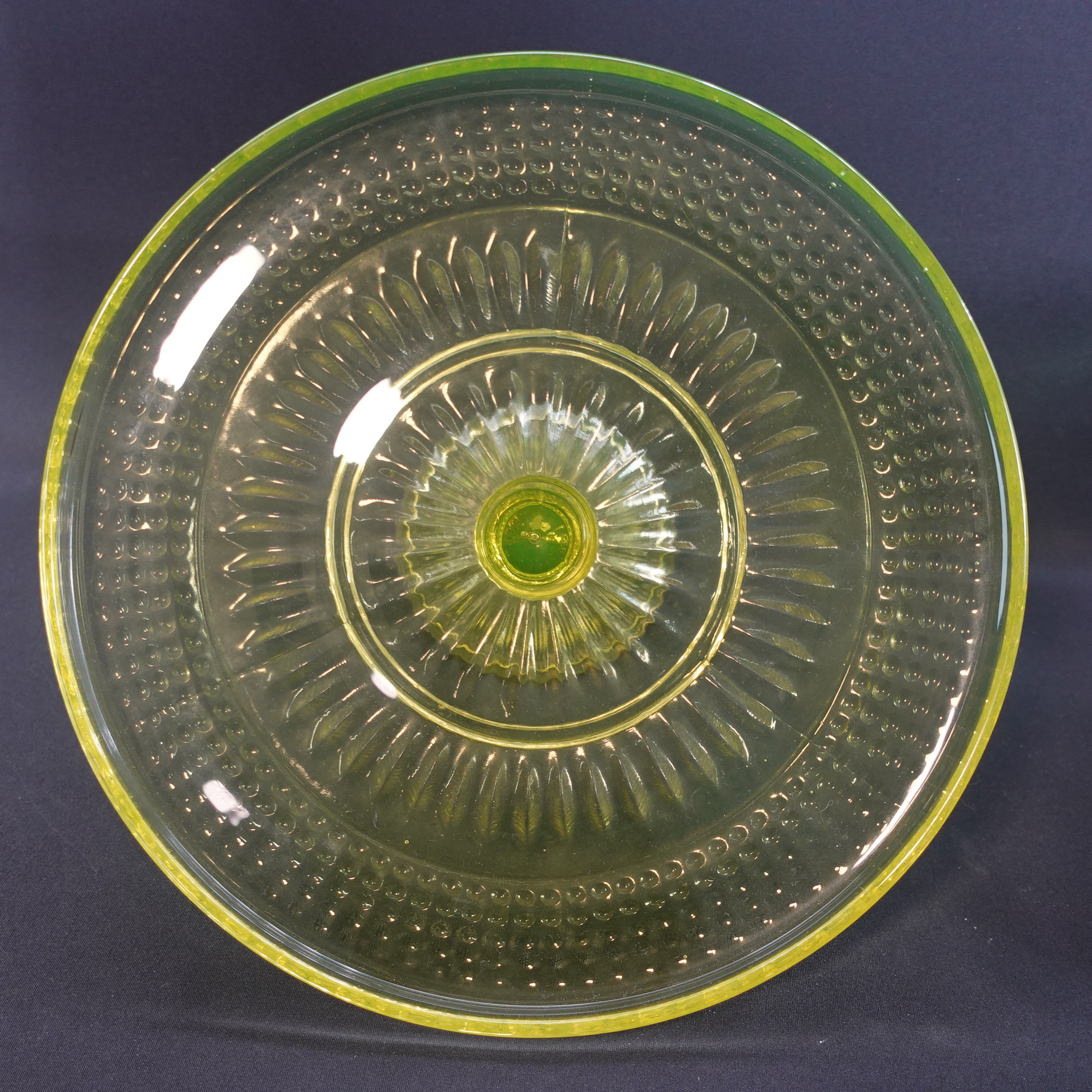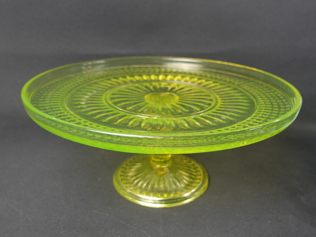 The yellow Barokki serving platter with a foot, manufactured by Riihimäki Glass, is part of the pressed glass series designed by Erkkitapio Siiroinen, which was produced in 1967-69. In addition to the serving platter, the glassware also includes a drinking glass, a jug, a dessert bowl with a foot, a serving bowl, a serving bowl with a foot, a serving bowl, a beer glass, a saucer, a sugar bowl and a creamer. In addition to yellow, the dishes in the series were also produced in clear, brown (amber), violet (neodymium), blue and green. The diameter of the serving platter for sale is 28.5 cm and the height is 12.5 cm. The serving platter is intact and otherwise in good condition.