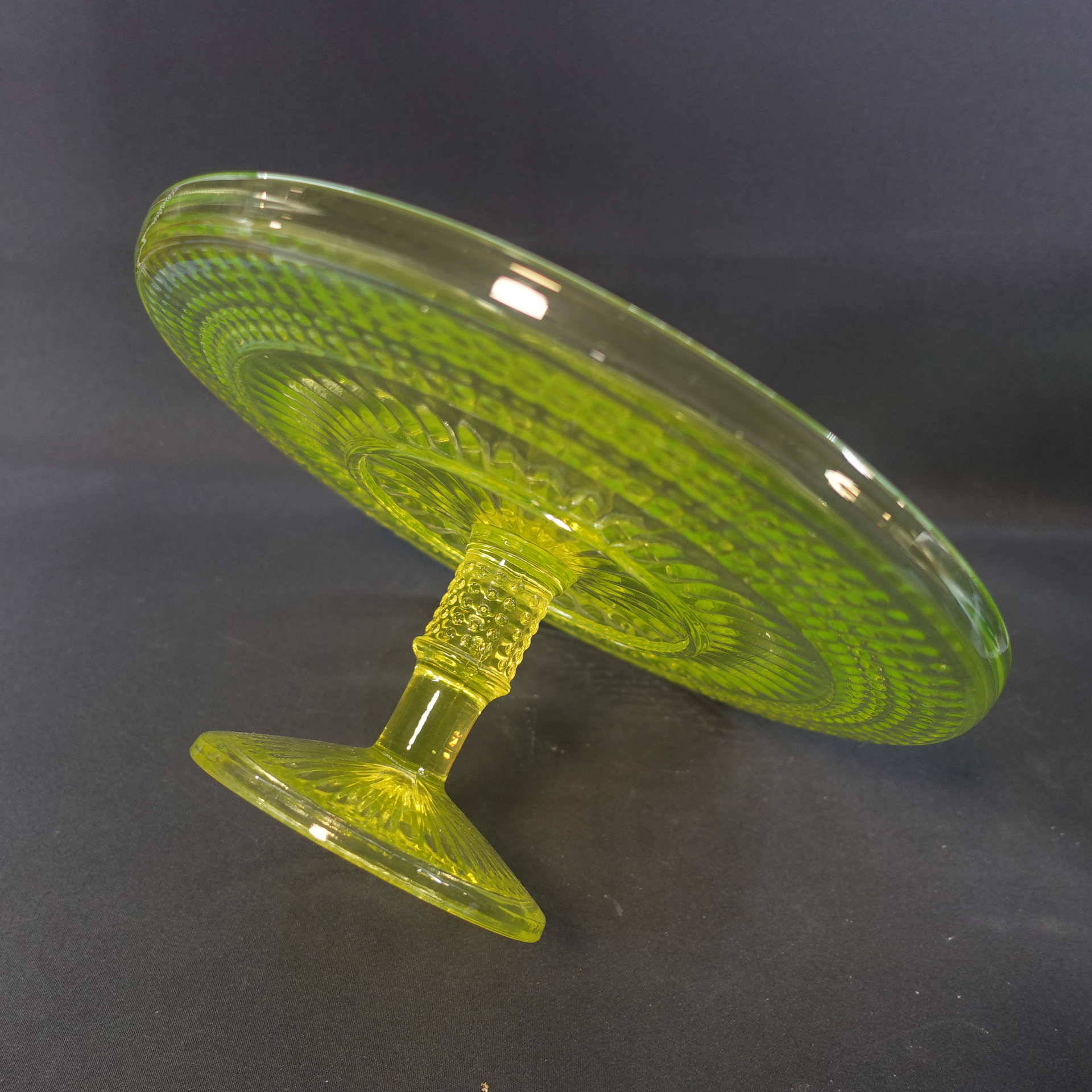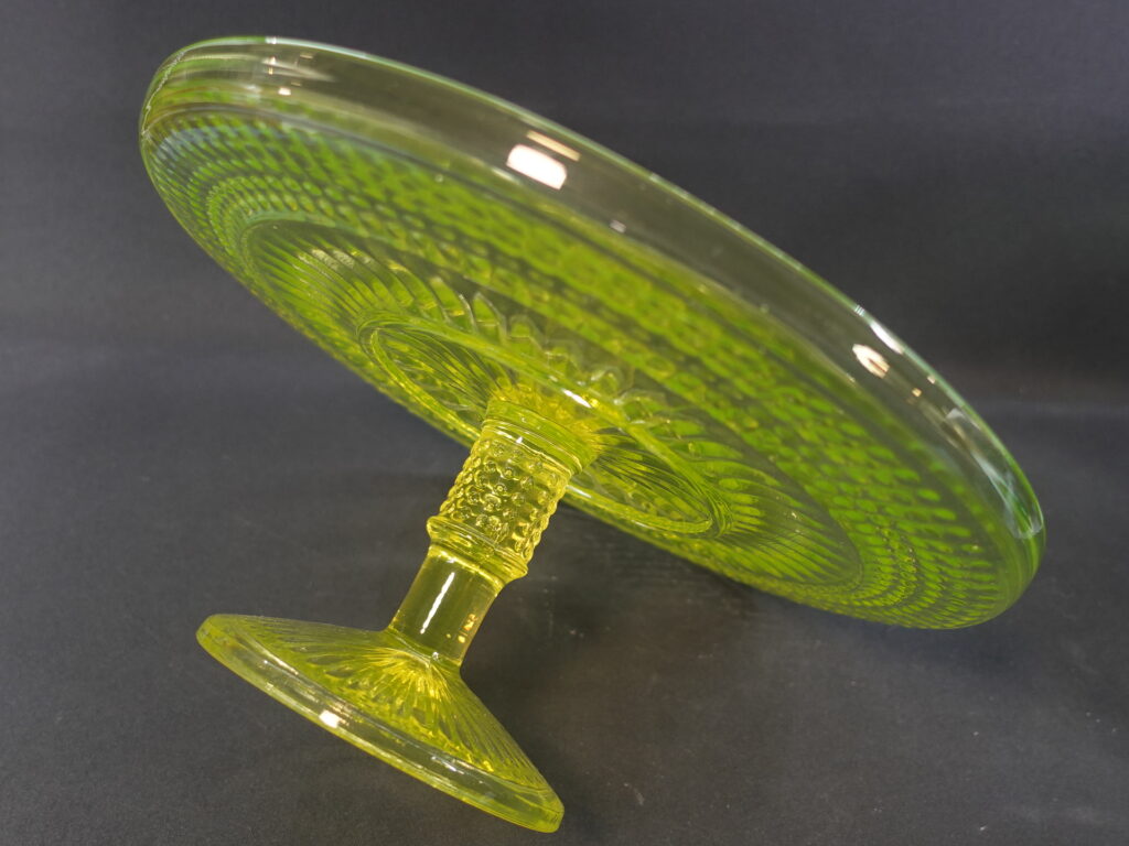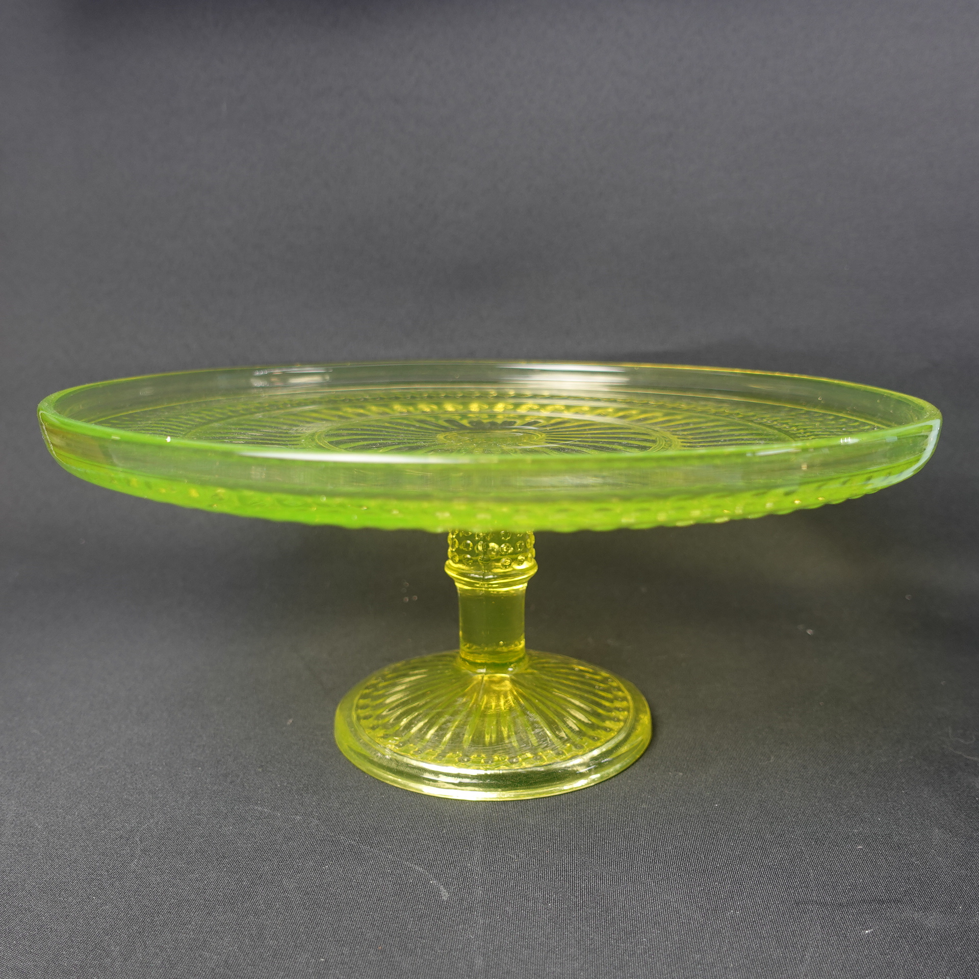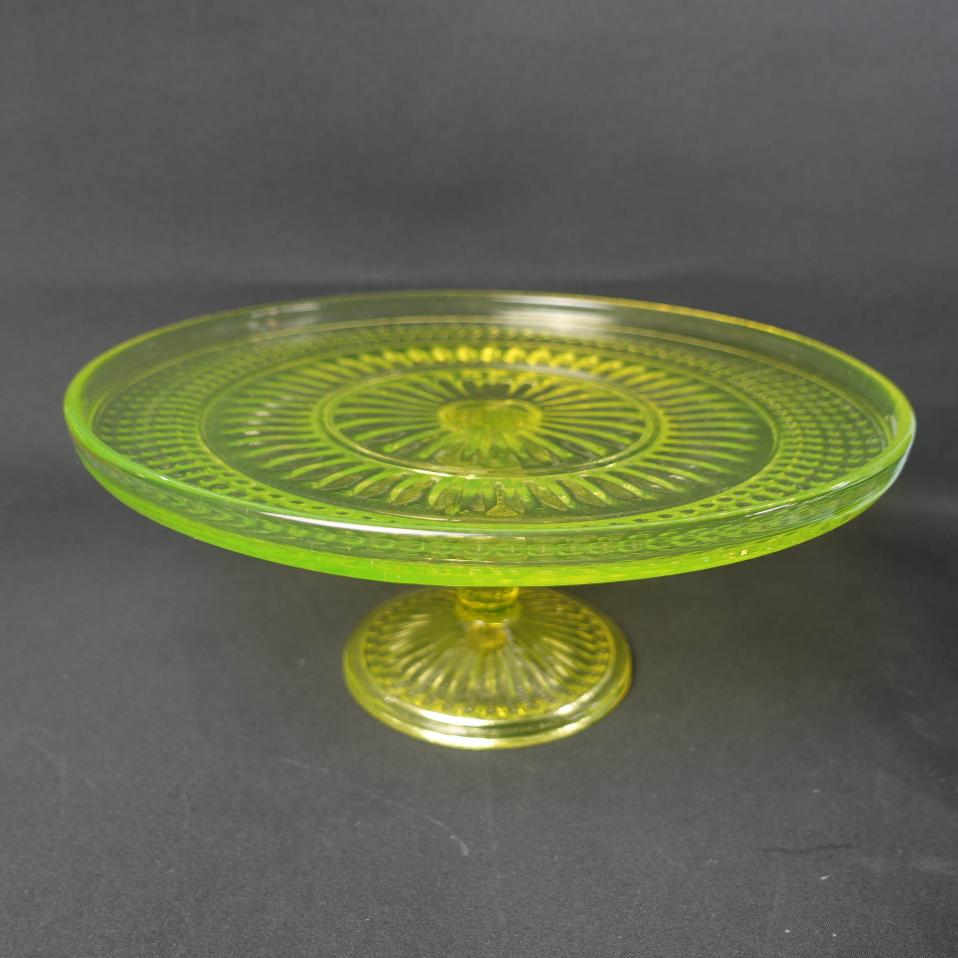 The yellow Barokki serving platter with a foot, manufactured by Riihimäki Glass, is part of the pressed glass series designed by Erkkitapio Siiroinen, which was produced in 1967-69. In addition to the serving platter, the glassware also includes a drinking glass, a jug, a dessert bowl with a foot, a serving bowl, a serving bowl with a foot, a serving bowl, a beer glass, a saucer, a sugar bowl and a creamer. In addition to yellow, the dishes in the series were also produced in clear, brown (amber), violet (neodymium), blue and green. The diameter of the serving platter for sale is 28.5 cm and the height is 12.5 cm. The serving platter is intact and otherwise in good condition.