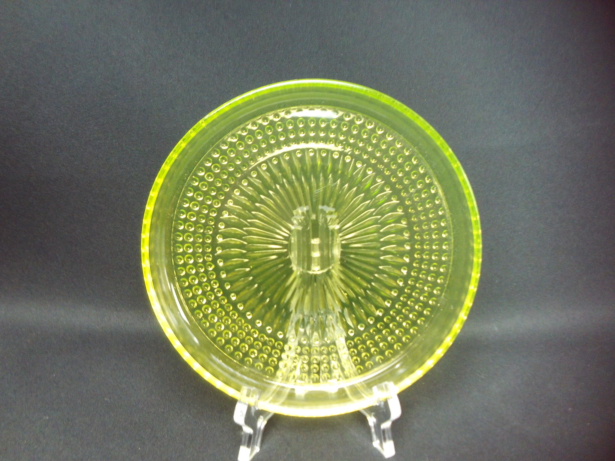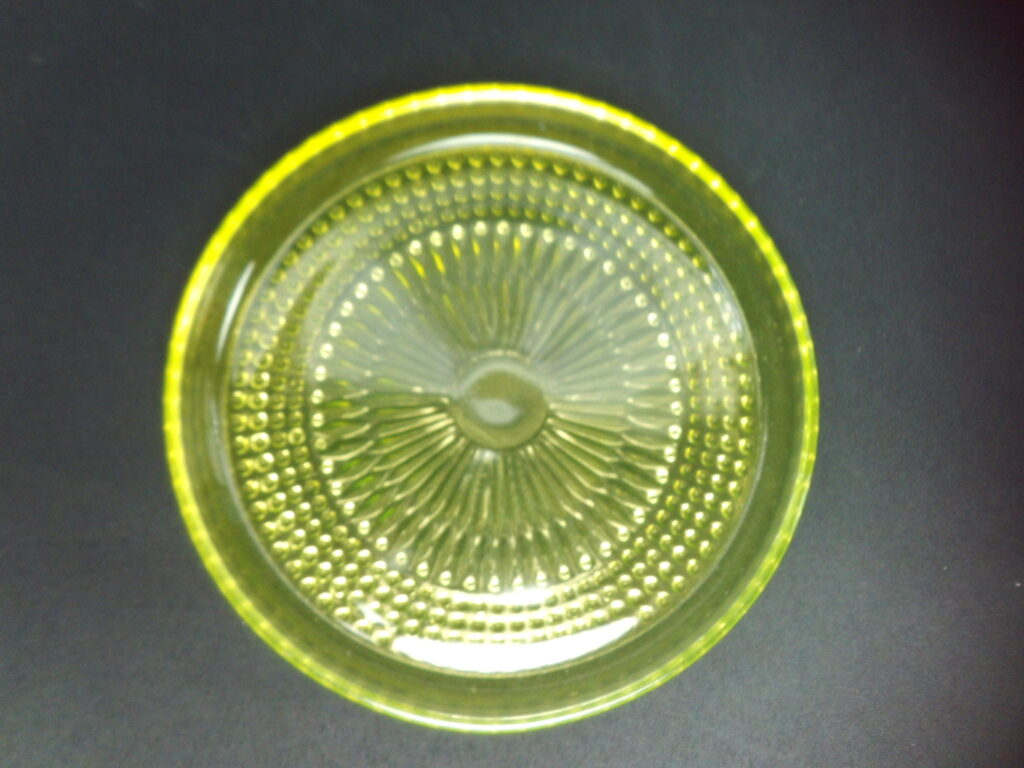 The yellow Barokki plate made by Riihimäki Glass belongs to the pressed glass series designed by Erkkitapio Siiroinen, which was in production in 1967-69. The glassware includes, among others, a drinking glass, a decanter, a serving bowl, a serving bowl with a foot, a serving bowl, a beer glass, a sugar bowl and a creamer. In addition to yellow, the dishes in the series were also made in clear, brown (amber), violet (neodymium), blue and green. The plates for sale are intact and otherwise in good condition.