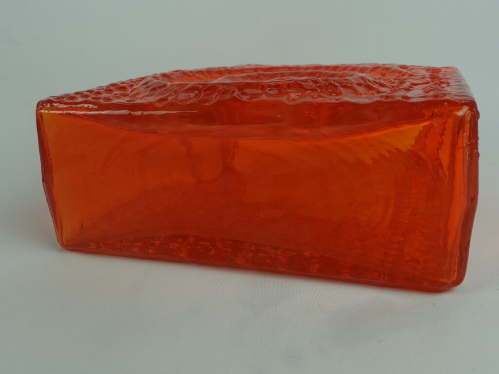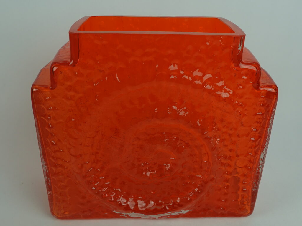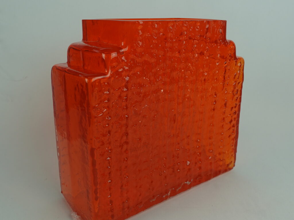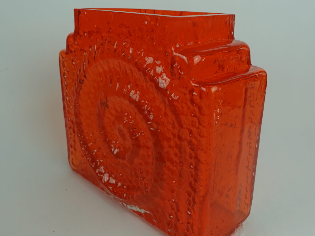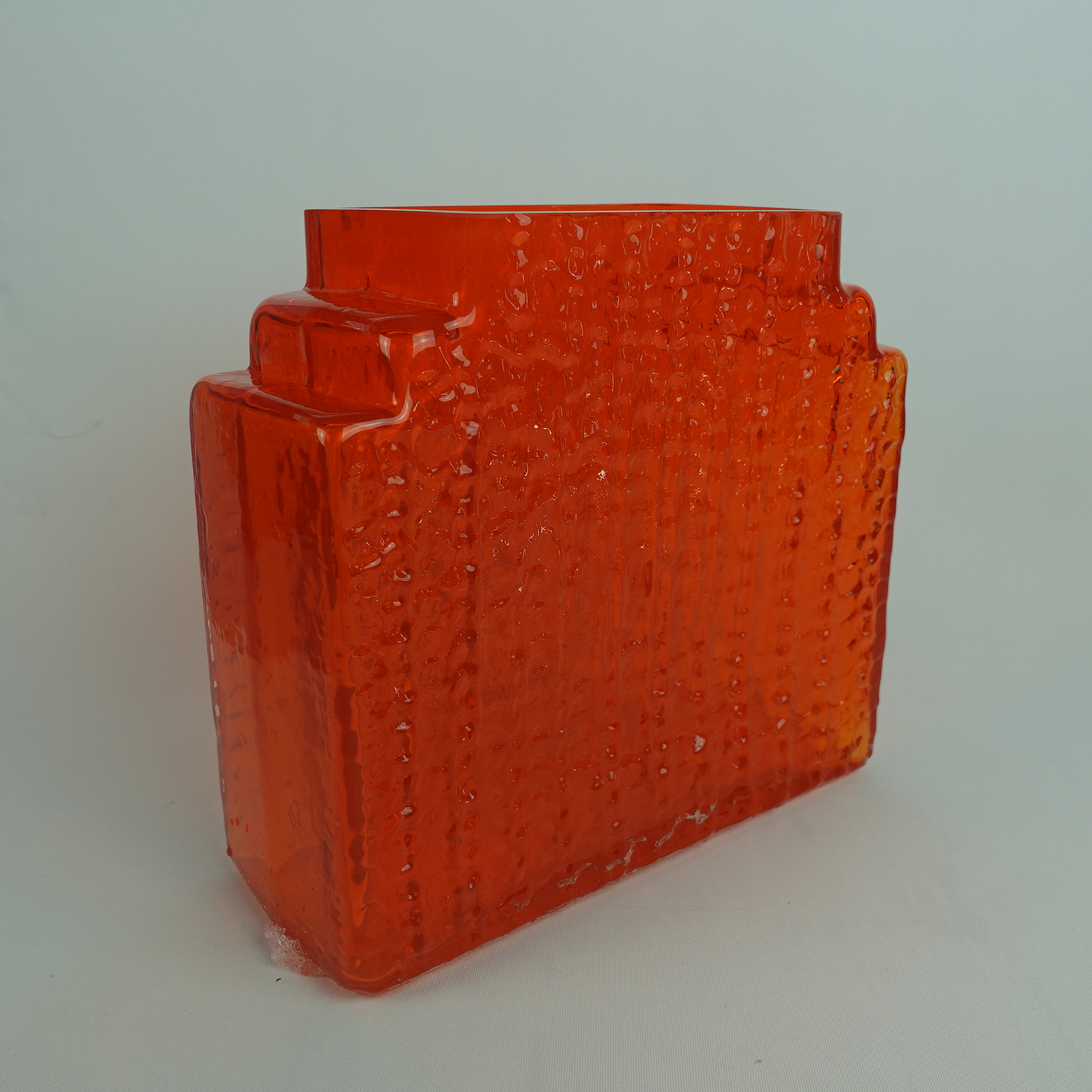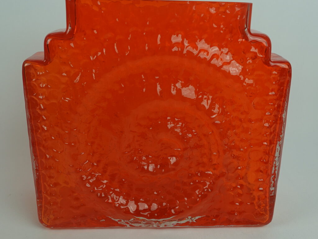 Orange Kometti vase designed by Nanny Still for Riihimäki Glass. The vase is numbered 1414 and was produced in 1968-69. The vase is 18 cm high, 19 cm wide and 7.3 cm deep. The glowing orange one for sale is intact and otherwise in good condition, with only scratches on the outer base from being moved.