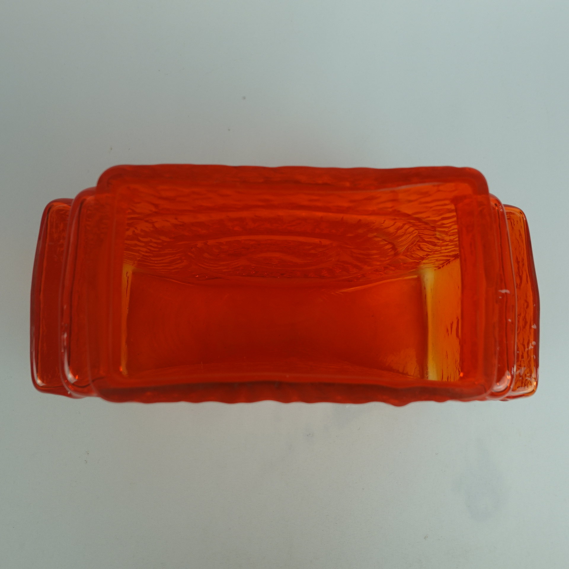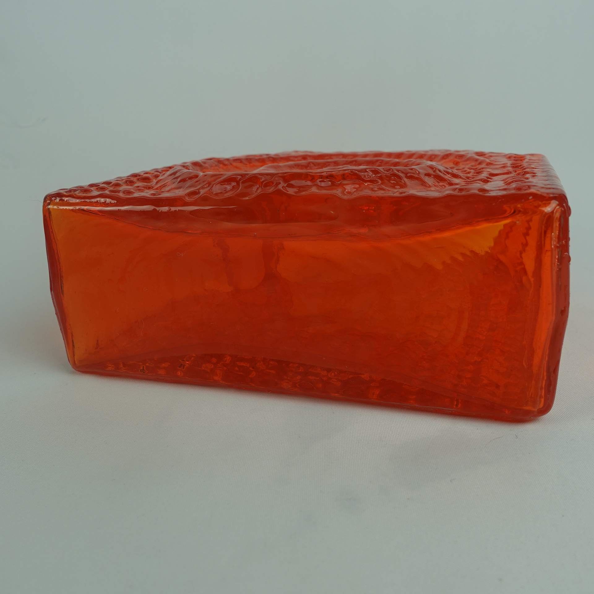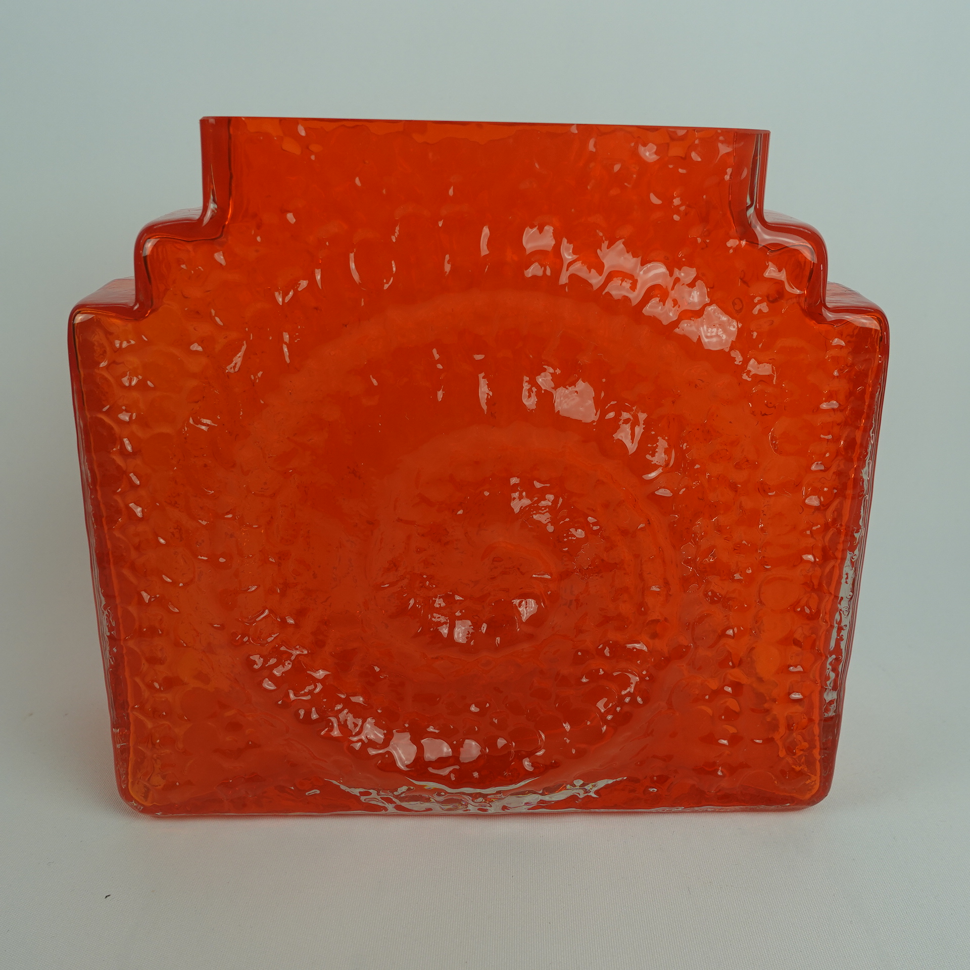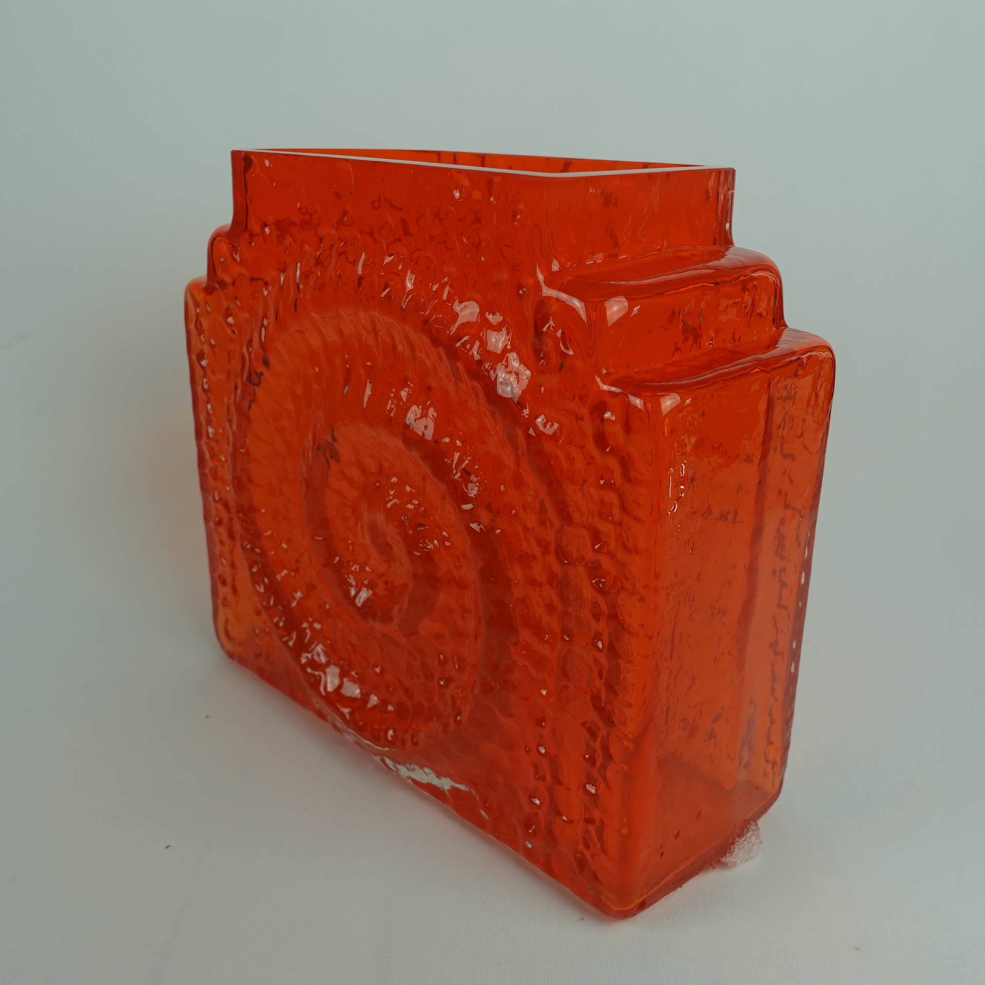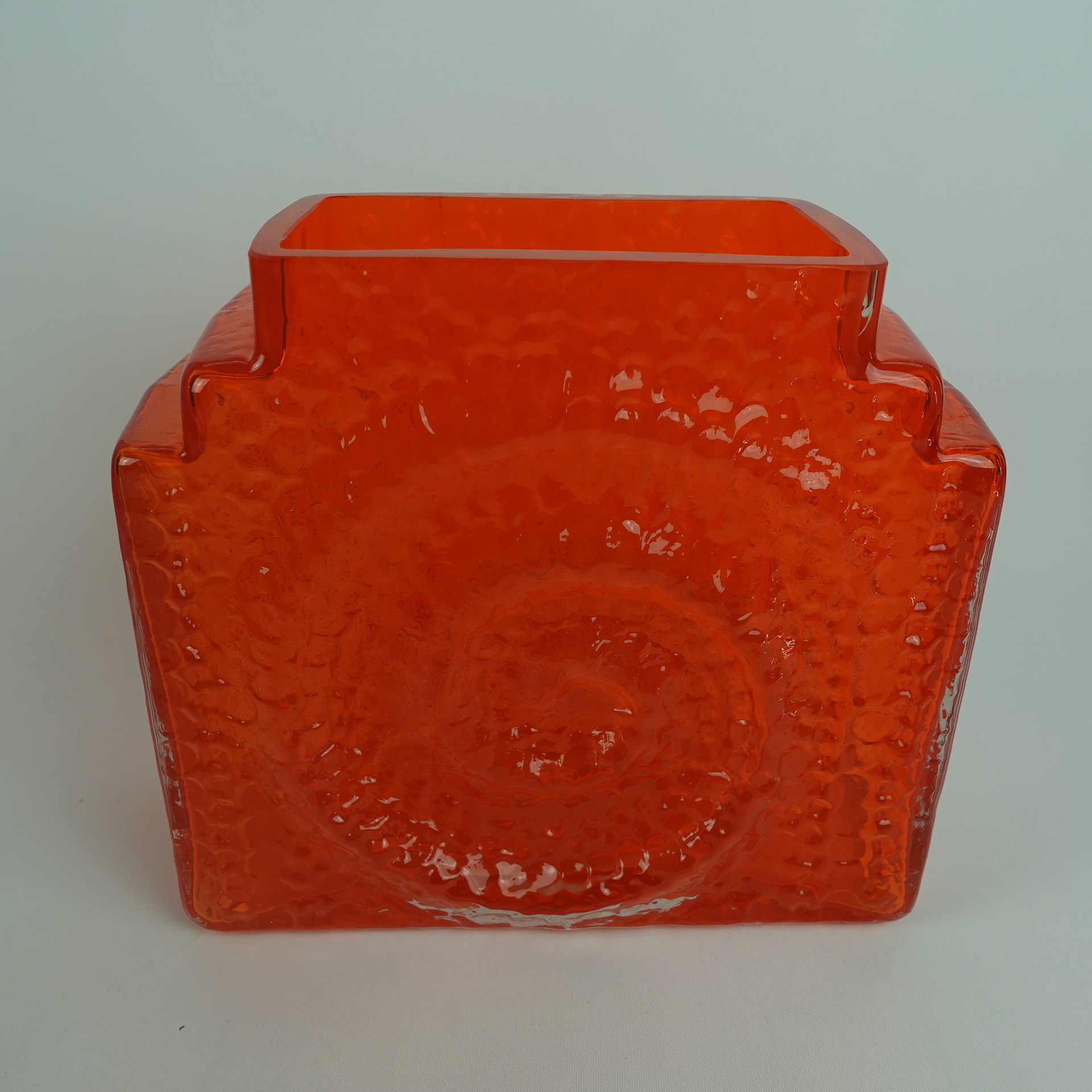 Orange Kometti vase designed by Nanny Still for Riihimäki Glass. The vase is numbered 1414 and was produced in 1968-69. The vase is 18 cm high, 19 cm wide and 7.3 cm deep. The glowing orange one for sale is intact and otherwise in good condition, with only scratches on the outer base from being moved.