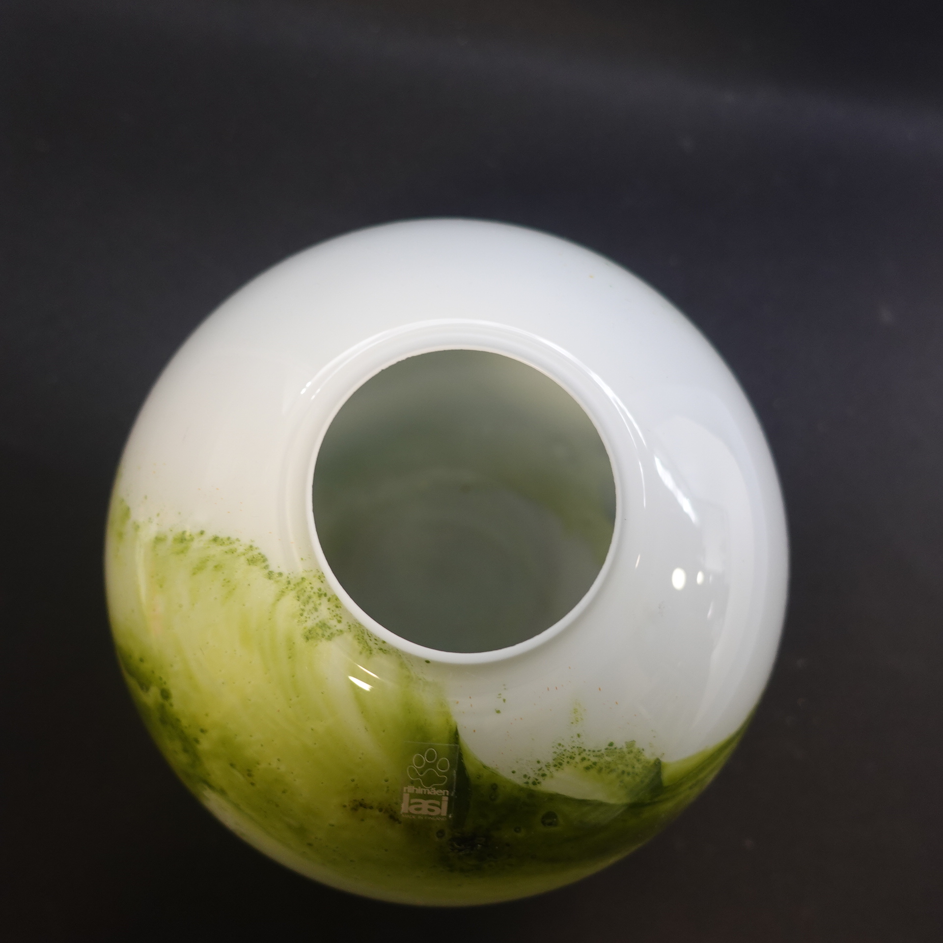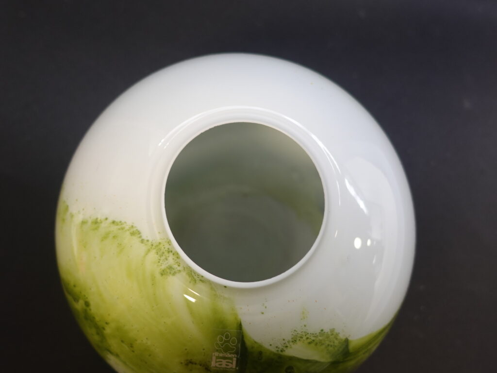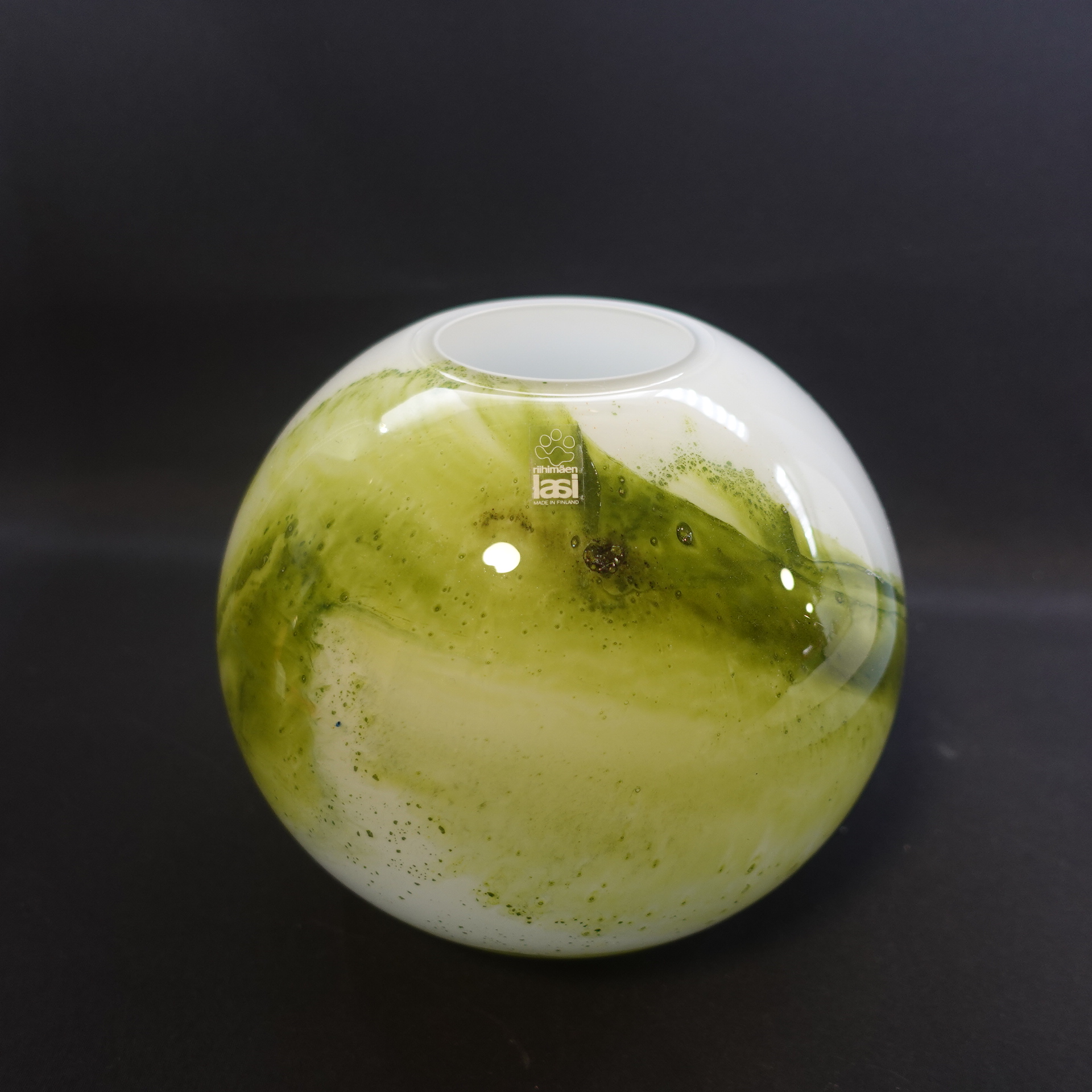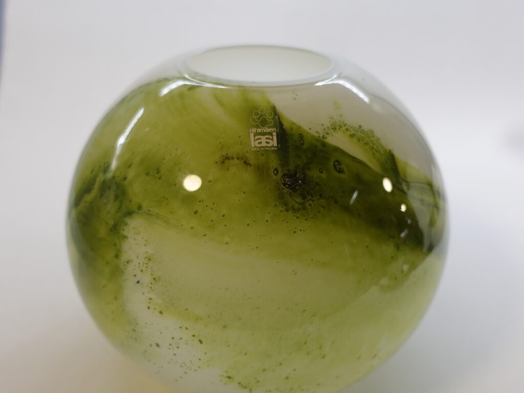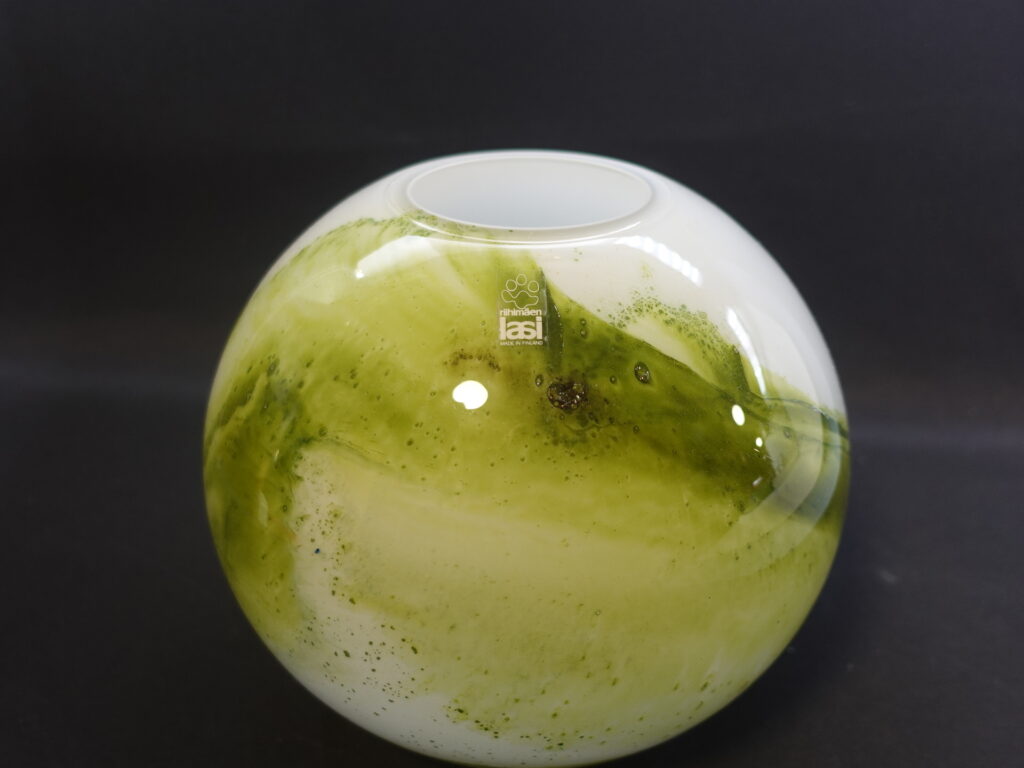 A green round vase from the Koralli series designed by Tamara Aladin for Riihimäki Glass. The series was produced in 1975-76 and was also produced in blue-green. The height of the vase is 16.5 cm and the diameter is 18 cm. The beautiful green vase for sale is intact and otherwise in very good condition.