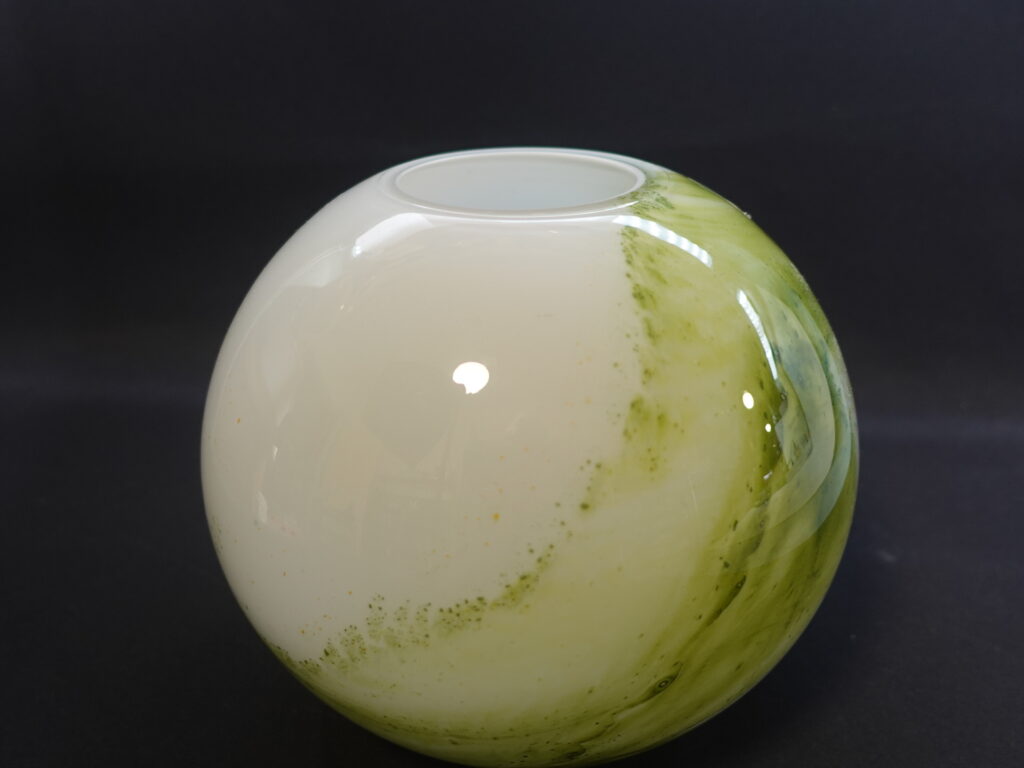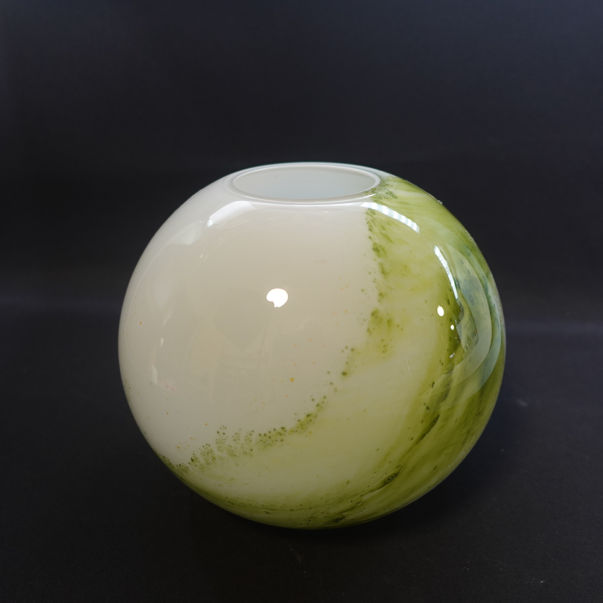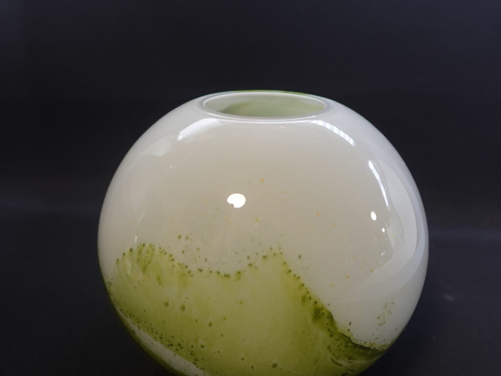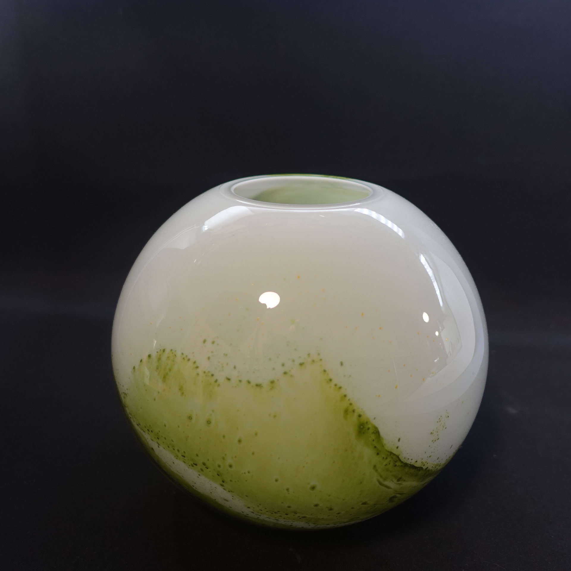 A green round vase from the Koralli series designed by Tamara Aladin for Riihimäki Glass. The series was produced in 1975-76 and was also produced in blue-green. The height of the vase is 16.5 cm and the diameter is 18 cm. The beautiful green vase for sale is intact and otherwise in very good condition.