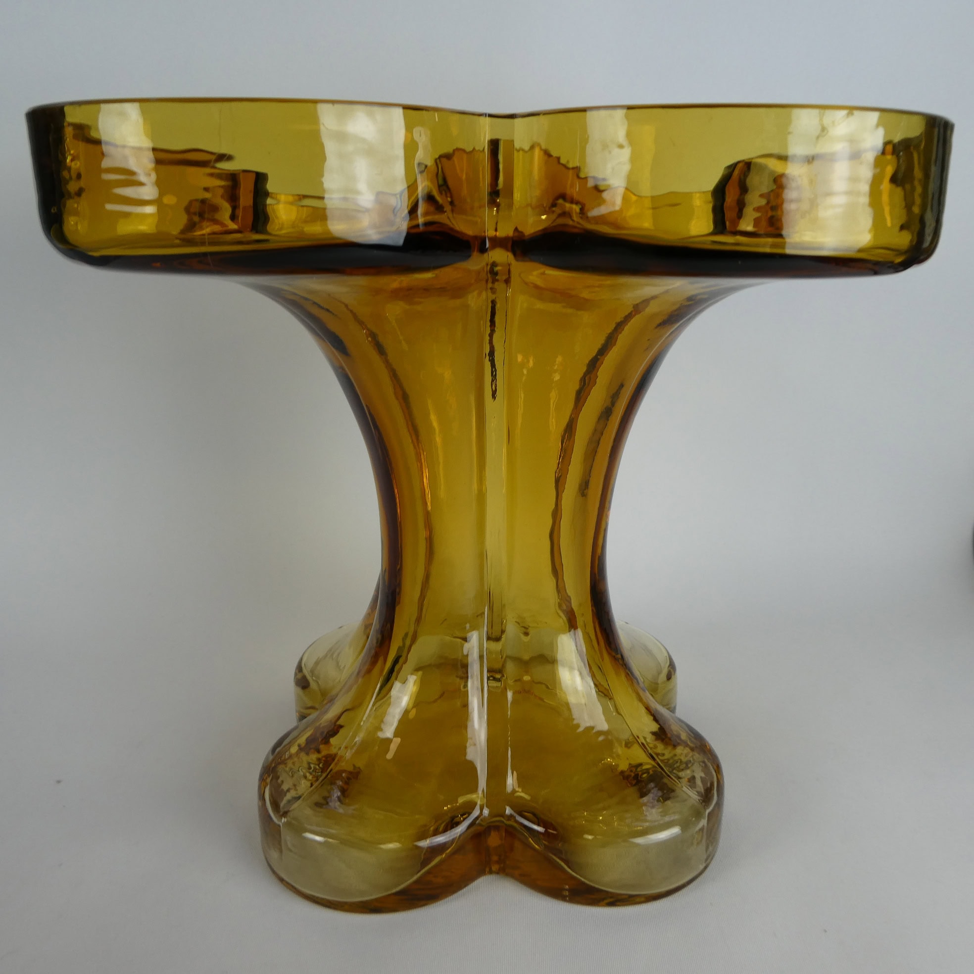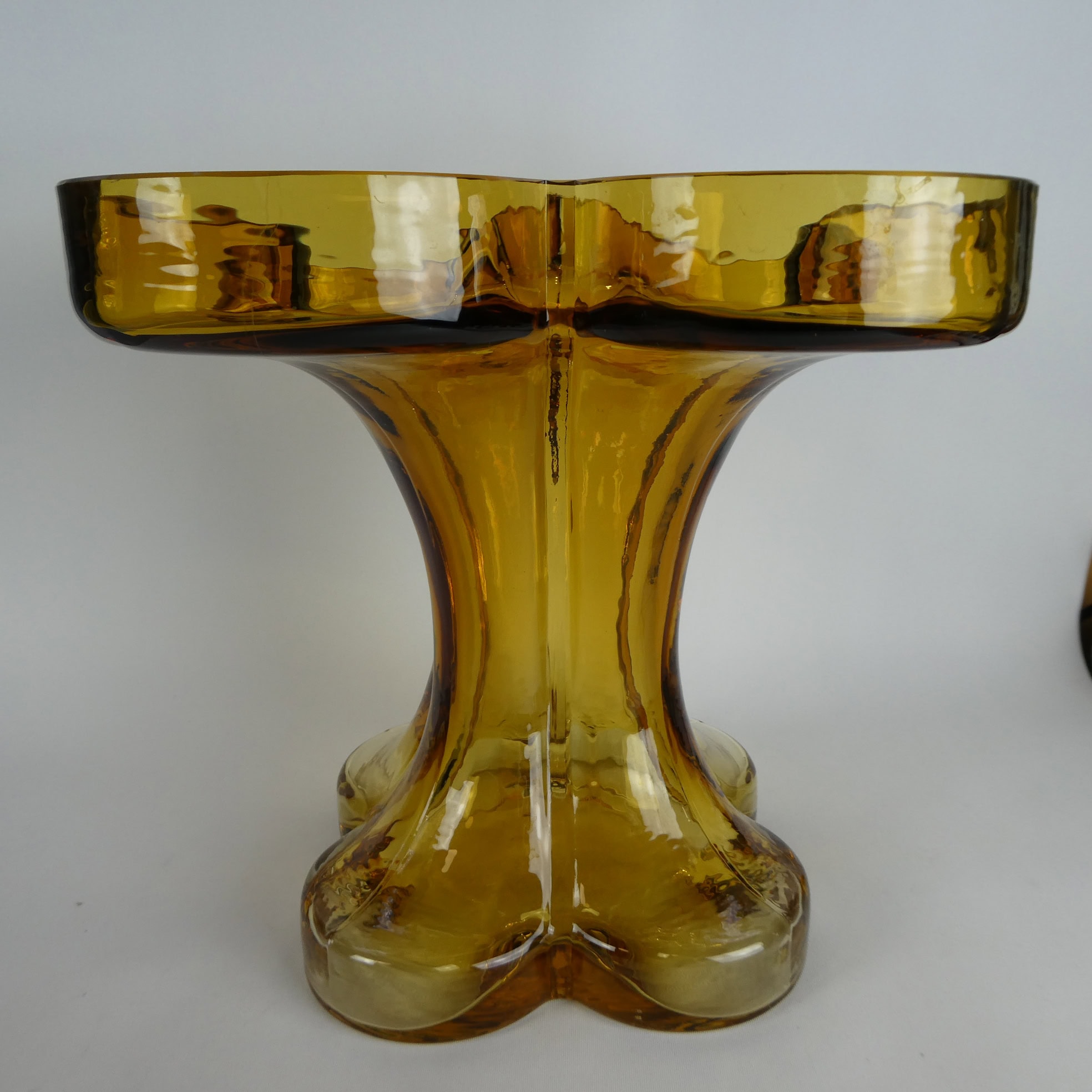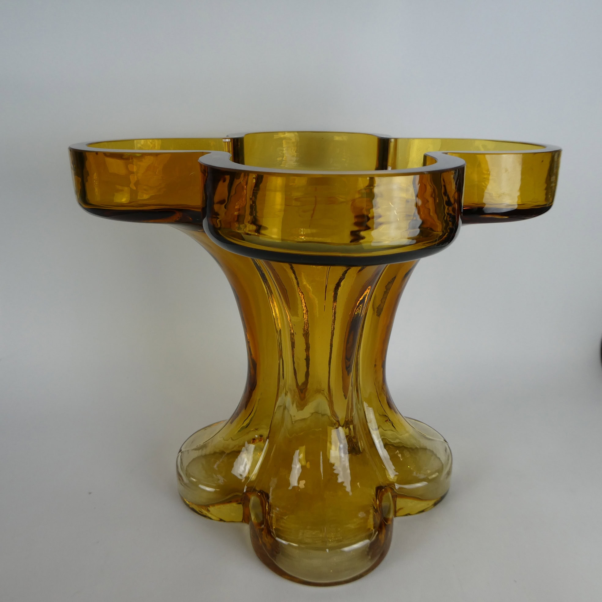 Amber-brown Onnenlehti vase designed by Helena Tynell for Riihimäen lasille. Its product code is 1410. The vase was produced in several different sizes and colors in 1971–76. The vase for sale is the largest in the series. Its height is 23.5 cm and diameter 27.5 cm. The vase is intact and in very good condition, with only a few handling scratches on the base.