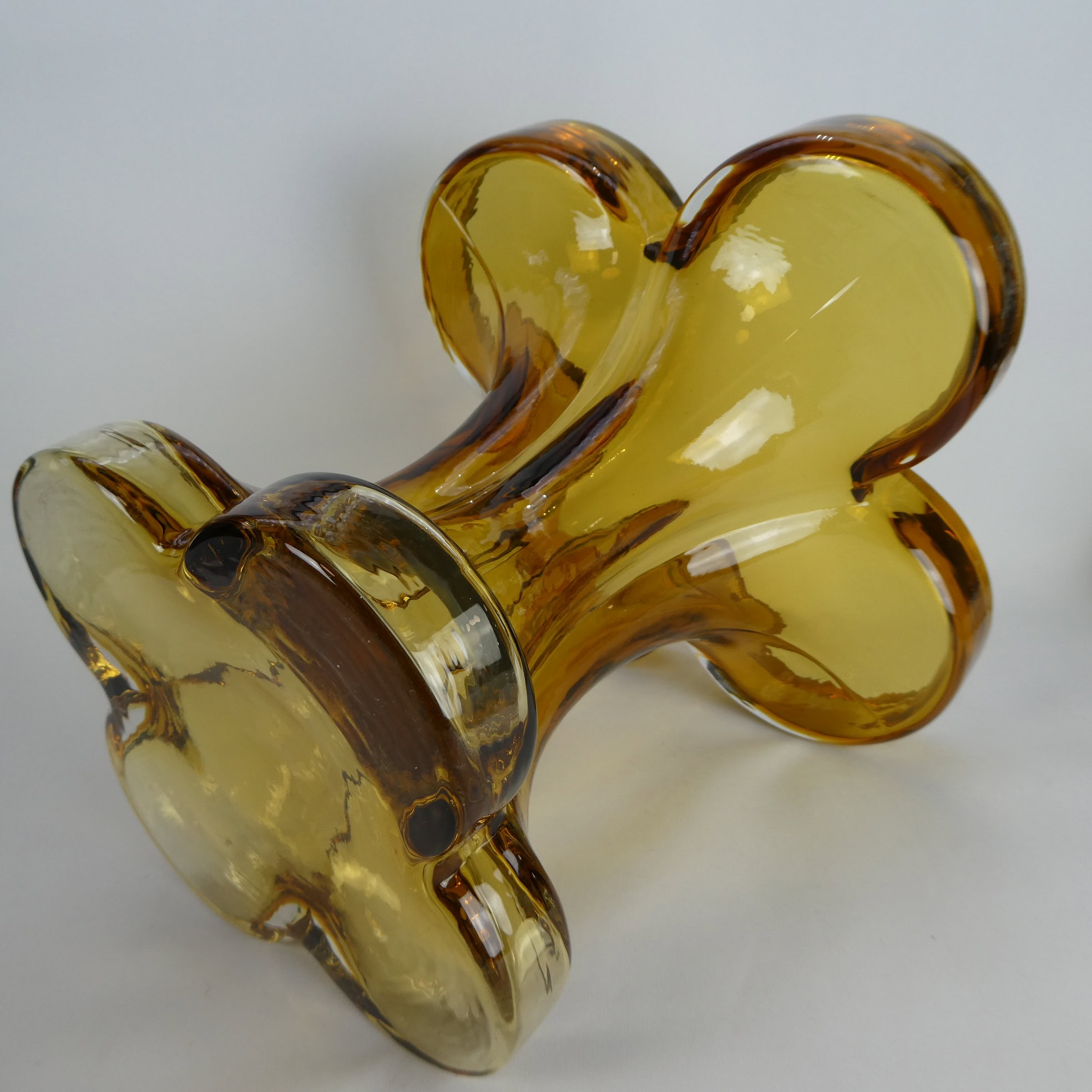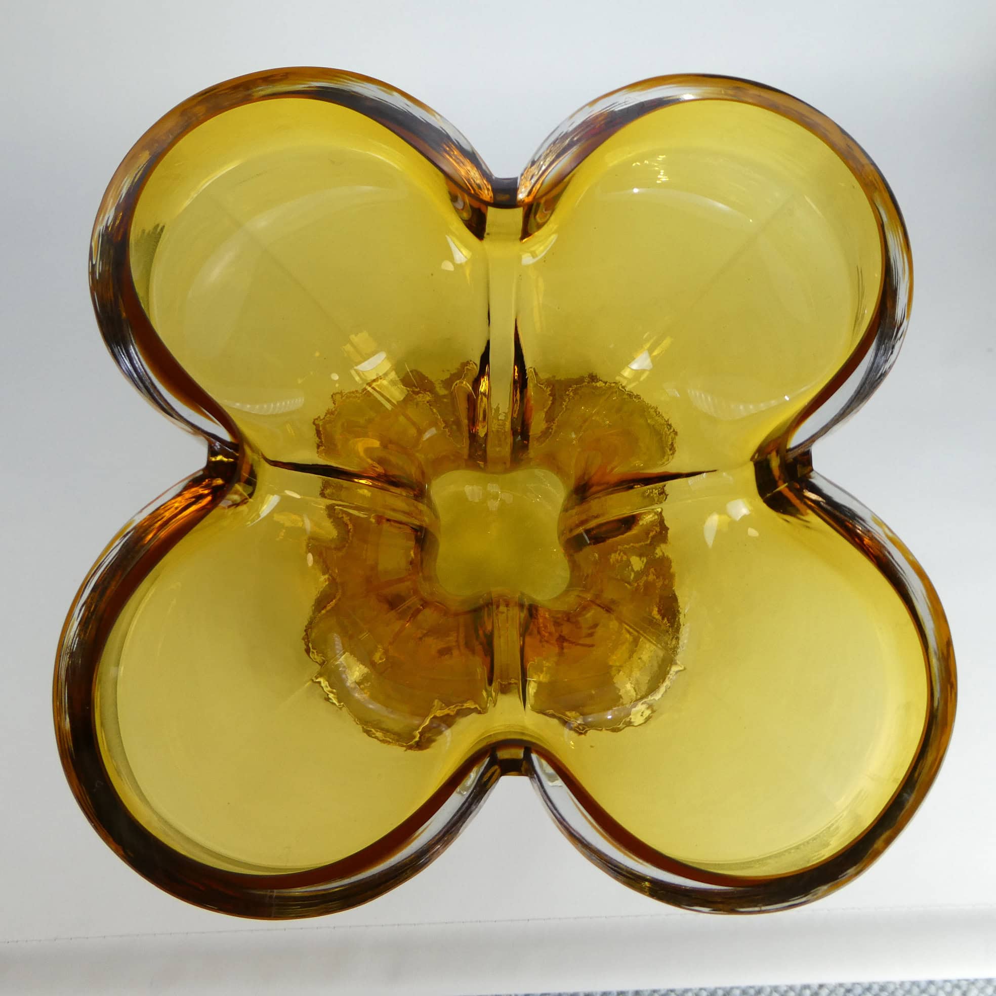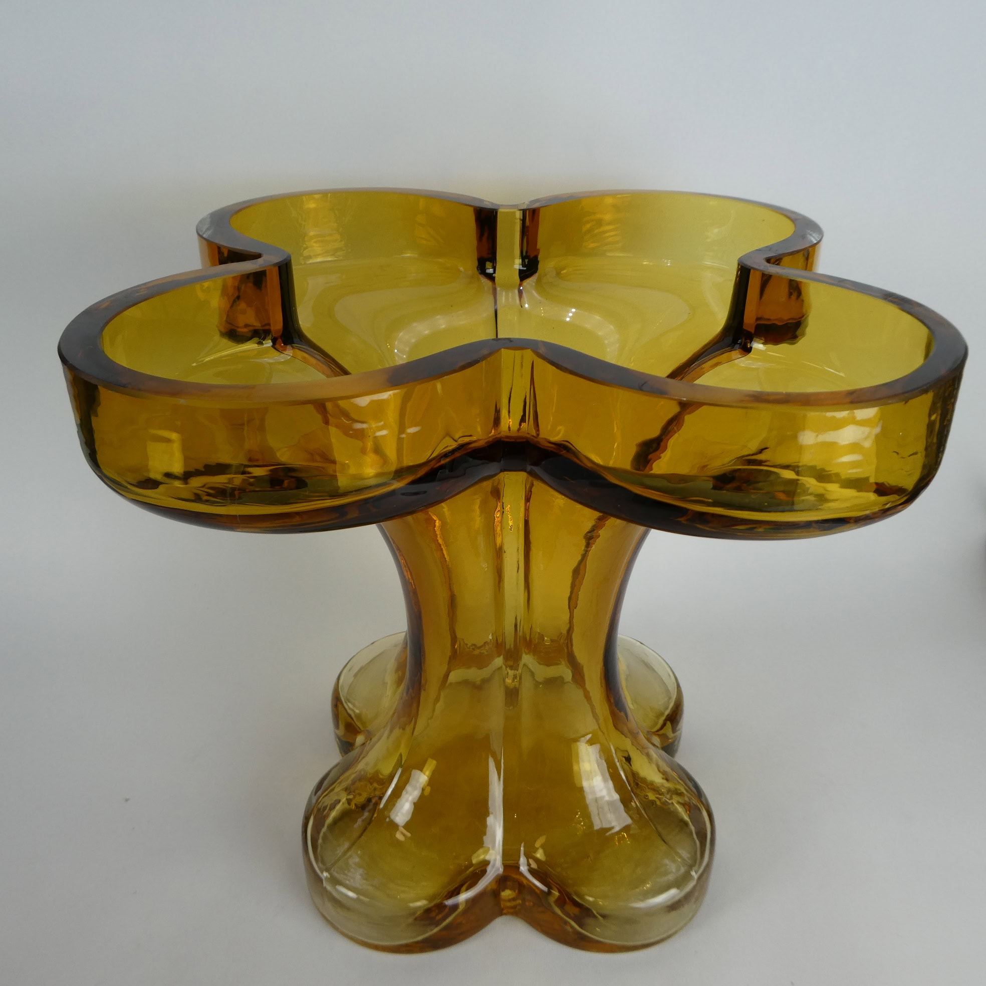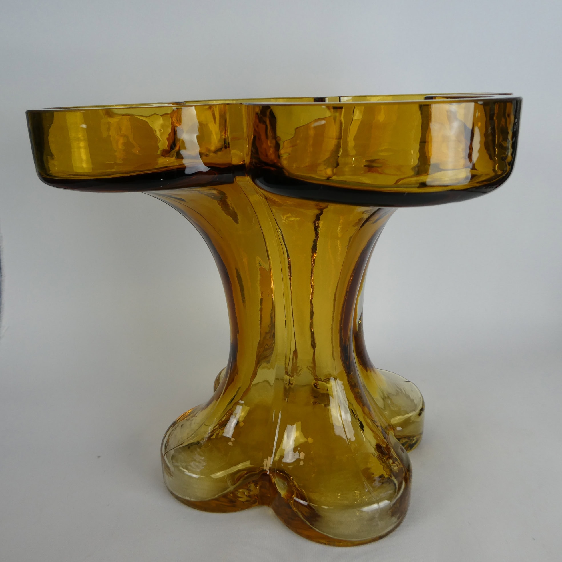 Amber-brown Onnenlehti vase designed by Helena Tynell for Riihimäen lasille. Its product code is 1410. The vase was produced in several different sizes and colors in 1971–76. The vase for sale is the largest in the series. Its height is 23.5 cm and diameter 27.5 cm. The vase is intact and in very good condition, with only a few handling scratches on the base.
