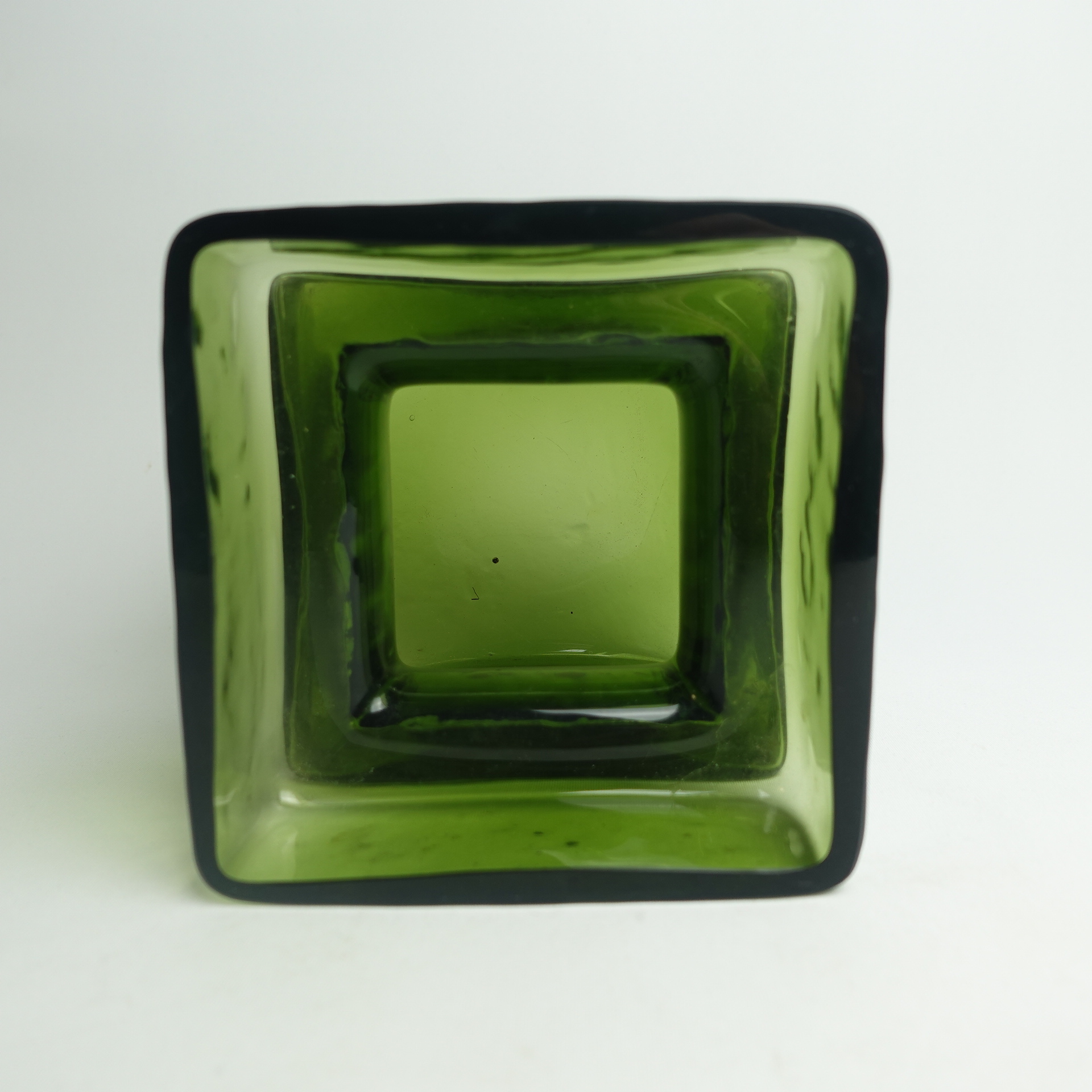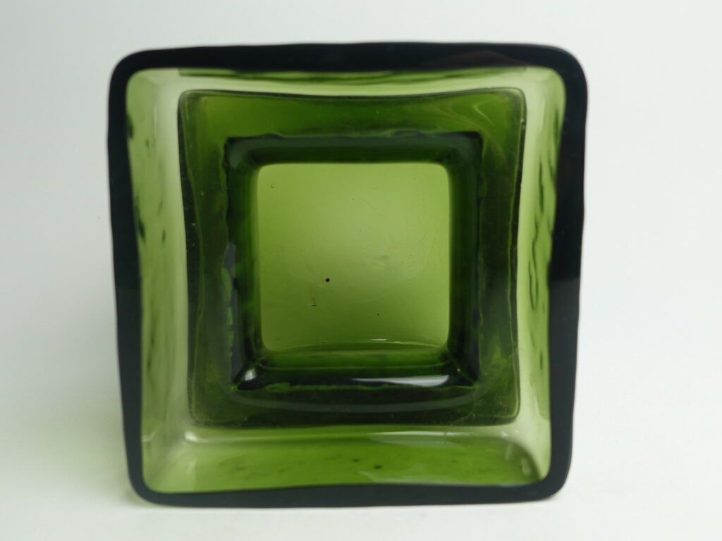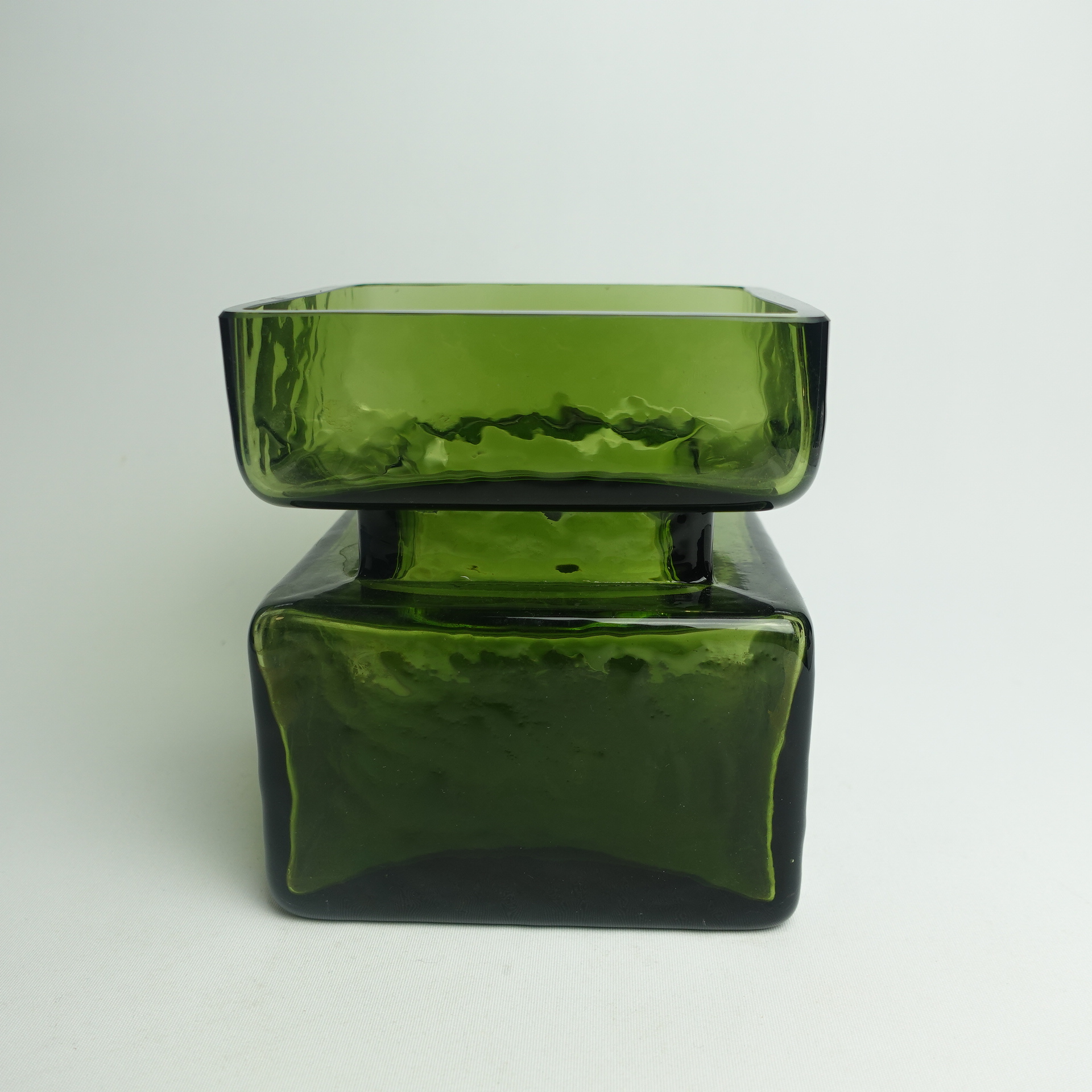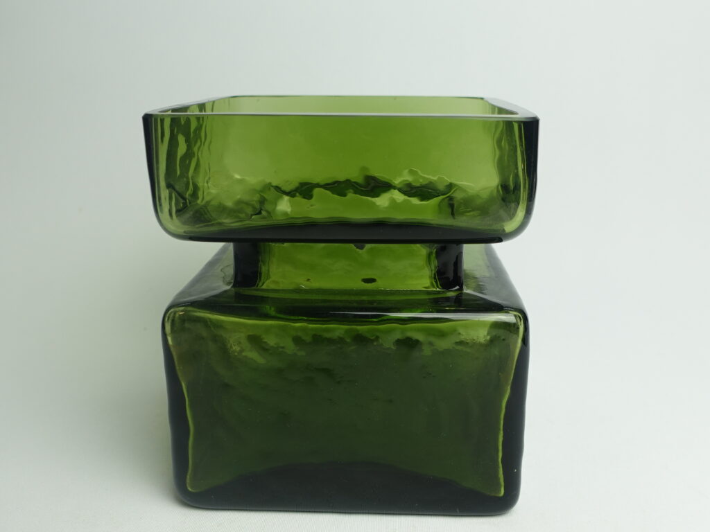 Green Pala vase designed by Helena Tynell for Riihimäki glass. The vase is marked 1393. The vase was produced between 1964 and 1974. The vase is a rare 5/6 size, with a height of 13.5 cm and a side length of 12 cm. The vase for sale is intact and otherwise in good condition.